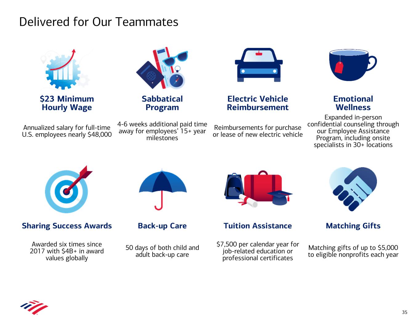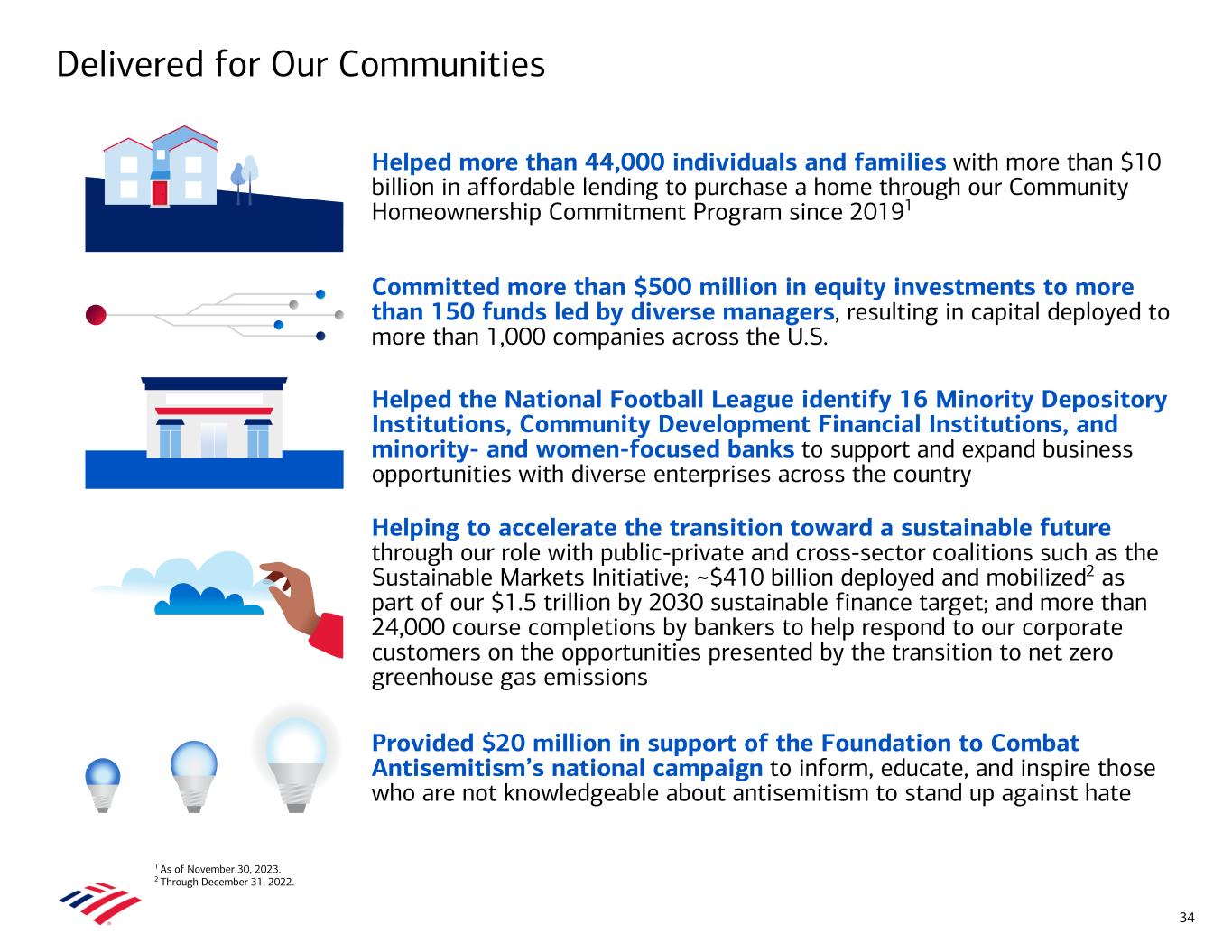 Helped more than 44,000 individuals and families with more than $10 billion in affordable lending to purchase a home through our Community Homeownership Commitment Program since 20191 Committed more than $500 million in equity investments to more than 150 funds led by diverse managers, resulting in capital deployed to more than 1,000 companies across the U.S. Helped the National Football League identify 16 Minority Depository Institutions, Community Development Financial Institutions, and minority- and women-focused banks to support and expand business opportunities with diverse enterprises across the country Helping to accelerate the transition toward a sustainable future through our role with public-private and cross-sector coalitions such as the Sustainable Markets Initiative; ~$410 billion deployed and mobilized2 as part of our $1.5 trillion by 2030 sustainable finance target; and more than 24,000 course completions by bankers to help respond to our corporate customers on the opportunities presented by the transition to net zero greenhouse gas emissions Provided $20 million in support of the Foundation to Combat Antisemitism’s national campaign to inform, educate, and inspire those who are not knowledgeable about antisemitism to stand up against hate 34 Delivered for Our Communities 1 As of November 30, 2023. 2 Through December 31, 2022.