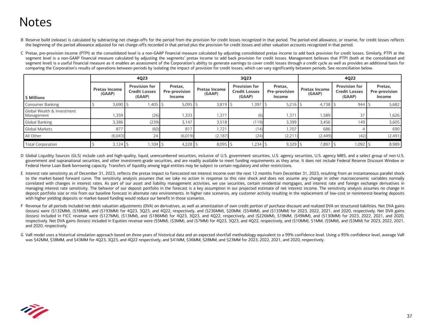 B Reserve build (release) is calculated by subtracting net charge-offs for the period from the provision for credit losses recognized in that period. The period-end allowance, or reserve, for credit losses reflects the beginning of the period allowance adjusted for net charge-offs recorded in that period plus the provision for credit losses and other valuation accounts recognized in that period. C Pretax, pre-provision income (PTPI) at the consolidated level is a non-GAAP financial measure calculated by adjusting consolidated pretax income to add back provision for credit losses. Similarly, PTPI at the segment level is a non-GAAP financial measure calculated by adjusting the segments’ pretax income to add back provision for credit losses. Management believes that PTPI (both at the consolidated and segment level) is a useful financial measure as it enables an assessment of the Corporation’s ability to generate earnings to cover credit losses through a credit cycle as well as provides an additional basis for comparing the Corporation's results of operations between periods by isolating the impact of provision for credit losses, which can vary significantly between periods. See reconciliation below. D Global Liquidity Sources (GLS) include cash and high-quality, liquid, unencumbered securities, inclusive of U.S. government securities, U.S. agency securities, U.S. agency MBS, and a select group of non-U.S. government and supranational securities, and other investment-grade securities, and are readily available to meet funding requirements as they arise. It does not include Federal Reserve Discount Window or Federal Home Loan Bank borrowing capacity. Transfers of liquidity among legal entities may be subject to certain regulatory and other restrictions. E Interest rate sensitivity as of December 31, 2023, reflects the pretax impact to forecasted net interest income over the next 12 months from December 31, 2023, resulting from an instantaneous parallel shock to the market-based forward curve. The sensitivity analysis assumes that we take no action in response to this rate shock and does not assume any change in other macroeconomic variables normally correlated with changes in interest rates. As part of our asset and liability management activities, we use securities, certain residential mortgages, and interest rate and foreign exchange derivatives in managing interest rate sensitivity. The behavior of our deposit portfolio in the forecast is a key assumption in our projected estimate of net interest income. The sensitivity analysis assumes no change in deposit portfolio size or mix from our baseline forecast in alternate rate environments. In higher rate scenarios, any customer activity resulting in the replacement of low-cost or noninterest-bearing deposits with higher yielding deposits or market-based funding would reduce our benefit in those scenarios. F Revenue for all periods included net debit valuation adjustments (DVA) on derivatives, as well as amortization of own credit portion of purchase discount and realized DVA on structured liabilities. Net DVA gains (losses) were ($132MM), ($16MM), and ($193MM) for 4Q23, 3Q23, and 4Q22, respectively, and ($236MM), $20MM, ($54MM), and ($133MM) for 2023, 2022, 2021, and 2020, respectively. Net DVA gains (losses) included in FICC revenue were ($127MM), ($13MM), and ($186MM) for 4Q23, 3Q23, and 4Q22, respectively, and ($226MM), $19MM, ($49MM), and ($130MM) for 2023, 2022, 2021, and 2020, respectively. Net DVA gains (losses) included in Equities revenue were ($5MM), ($3MM), and ($7MM) for 4Q23, 3Q23, and 4Q22, respectively, and ($10MM), $1MM, ($5MM), and ($3MM) for 2023, 2022, 2021, and 2020, respectively. G VaR model uses a historical simulation approach based on three years of historical data and an expected shortfall methodology equivalent to a 99% confidence level. Using a 95% confidence level, average VaR was $42MM, $38MM, and $43MM for 4Q23, 3Q23, and 4Q22 respectively, and $41MM, $36MM, $28MM, and $23MM for 2023, 2022, 2021, and 2020, respectively. Notes $ Millions 4Q23 3Q23 4Q22 Pretax Income (GAAP) Provision for Credit Losses (GAAP) Pretax, Pre-provision Income Pretax Income (GAAP) Provision for Credit Losses (GAAP) Pretax, Pre-provision Income Pretax Income (GAAP) Provision for Credit Losses (GAAP) Pretax, Pre-provision Income Consumer Banking $ 3,690 $ 1,405 $ 5,095 $ 3,819 $ 1,397 $ 5,216 $ 4,738 $ 944 $ 5,682 Global Wealth & Investment Management 1,359 (26) 1,333 1,377 (6) 1,371 1,589 37 1,626 Global Banking 3,386 (239) 3,147 3,518 (119) 3,399 3,456 149 3,605 Global Markets 877 (60) 817 1,721 (14) 1,707 686 4 690 All Other (6,043) 24 (6,019) (2,187) (24) (2,211) (2,449) (42) (2,491) Total Corporation $ 3,124 $ 1,104 $ 4,228 $ 8,095 $ 1,234 $ 9,329 $ 7,897 $ 1,092 $ 8,989 37