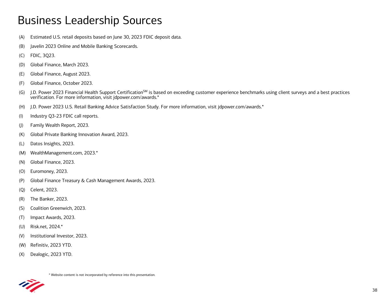 Business Leadership Sources (A) Estimated U.S. retail deposits based on June 30, 2023 FDIC deposit data. (B) Javelin 2023 Online and Mobile Banking Scorecards. (C) FDIC, 3Q23. (D) Global Finance, March 2023. (E) Global Finance, August 2023. (F) Global Finance, October 2023. (G) J.D. Power 2023 Financial Health Support CertificationSM is based on exceeding customer experience benchmarks using client surveys and a best practices verification. For more information, visit jdpower.com/awards.* (H) J.D. Power 2023 U.S. Retail Banking Advice Satisfaction Study. For more information, visit jdpower.com/awards.* (I) Industry Q3-23 FDIC call reports. (J) Family Wealth Report, 2023. (K) Global Private Banking Innovation Award, 2023. (L) Datos Insights, 2023. (M) WealthManagement.com, 2023.* (N) Global Finance, 2023. (O) Euromoney, 2023. (P) Global Finance Treasury & Cash Management Awards, 2023. (Q) Celent, 2023. (R) The Banker, 2023. (S) Coalition Greenwich, 2023. (T) Impact Awards, 2023. (U) Risk.net, 2024.* (V) Institutional Investor, 2023. (W) Refinitiv, 2023 YTD. (X) Dealogic, 2023 YTD. 38 * Website content is not incorporated by reference into this presentation.