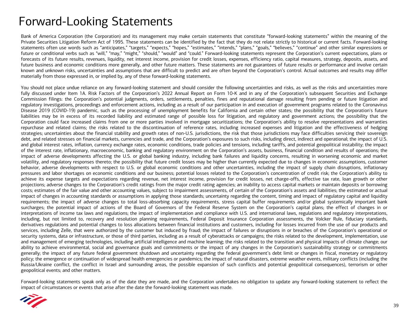 Forward-Looking Statements Bank of America Corporation (the Corporation) and its management may make certain statements that constitute “forward-looking statements” within the meaning of the Private Securities Litigation Reform Act of 1995. These statements can be identified by the fact that they do not relate strictly to historical or current facts. Forward-looking statements often use words such as “anticipates,” “targets,” “expects,” “hopes,” “estimates,” “intends,” “plans,” “goals,” “believes,” “continue” and other similar expressions or future or conditional verbs such as “will,” “may,” “might,” “should,” “would” and “could.” Forward-looking statements represent the Corporation’s current expectations, plans or forecasts of its future results, revenues, liquidity, net interest income, provision for credit losses, expenses, efficiency ratio, capital measures, strategy, deposits, assets, and future business and economic conditions more generally, and other future matters. These statements are not guarantees of future results or performance and involve certain known and unknown risks, uncertainties and assumptions that are difficult to predict and are often beyond the Corporation’s control. Actual outcomes and results may differ materially from those expressed in, or implied by, any of these forward-looking statements. You should not place undue reliance on any forward-looking statement and should consider the following uncertainties and risks, as well as the risks and uncertainties more fully discussed under Item 1A. Risk Factors of the Corporation’s 2022 Annual Report on Form 10-K and in any of the Corporation’s subsequent Securities and Exchange Commission filings: the Corporation’s potential judgments, orders, settlements, penalties, fines and reputational damage resulting from pending or future litigation and regulatory investigations, proceedings and enforcement actions, including as a result of our participation in and execution of government programs related to the Coronavirus Disease 2019 (COVID-19) pandemic, such as the processing of unemployment benefits for California and certain other states; the possibility that the Corporation's future liabilities may be in excess of its recorded liability and estimated range of possible loss for litigation, and regulatory and government actions; the possibility that the Corporation could face increased claims from one or more parties involved in mortgage securitizations; the Corporation’s ability to resolve representations and warranties repurchase and related claims; the risks related to the discontinuation of reference rates, including increased expenses and litigation and the effectiveness of hedging strategies; uncertainties about the financial stability and growth rates of non-U.S. jurisdictions, the risk that those jurisdictions may face difficulties servicing their sovereign debt, and related stresses on financial markets, currencies and trade, and the Corporation’s exposures to such risks, including direct, indirect and operational; the impact of U.S. and global interest rates, inflation, currency exchange rates, economic conditions, trade policies and tensions, including tariffs, and potential geopolitical instability; the impact of the interest rate, inflationary, macroeconomic, banking and regulatory environment on the Corporation’s assets, business, financial condition and results of operations; the impact of adverse developments affecting the U.S. or global banking industry, including bank failures and liquidity concerns, resulting in worsening economic and market volatility, and regulatory responses thereto; the possibility that future credit losses may be higher than currently expected due to changes in economic assumptions, customer behavior, adverse developments with respect to U.S. or global economic conditions and other uncertainties, including the impact of supply chain disruptions, inflationary pressures and labor shortages on economic conditions and our business; potential losses related to the Corporation’s concentration of credit risk; the Corporation's ability to achieve its expense targets and expectations regarding revenue, net interest income, provision for credit losses, net charge-offs, effective tax rate, loan growth or other projections; adverse changes to the Corporation’s credit ratings from the major credit rating agencies; an inability to access capital markets or maintain deposits or borrowing costs; estimates of the fair value and other accounting values, subject to impairment assessments, of certain of the Corporation’s assets and liabilities; the estimated or actual impact of changes in accounting standards or assumptions in applying those standards; uncertainty regarding the content, timing and impact of regulatory capital and liquidity requirements; the impact of adverse changes to total loss-absorbing capacity requirements, stress capital buffer requirements and/or global systemically important bank surcharges; the potential impact of actions of the Board of Governors of the Federal Reserve System on the Corporation’s capital plans; the effect of changes in or interpretations of income tax laws and regulations; the impact of implementation and compliance with U.S. and international laws, regulations and regulatory interpretations, including, but not limited to, recovery and resolution planning requirements, Federal Deposit Insurance Corporation assessments, the Volcker Rule, fiduciary standards, derivatives regulations and potential changes to loss allocations between financial institutions and customers, including for losses incurred from the use of our products and services, including Zelle, that were authorized by the customer but induced by fraud; the impact of failures or disruptions in or breaches of the Corporation’s operational or security systems, data or infrastructure, or those of third parti