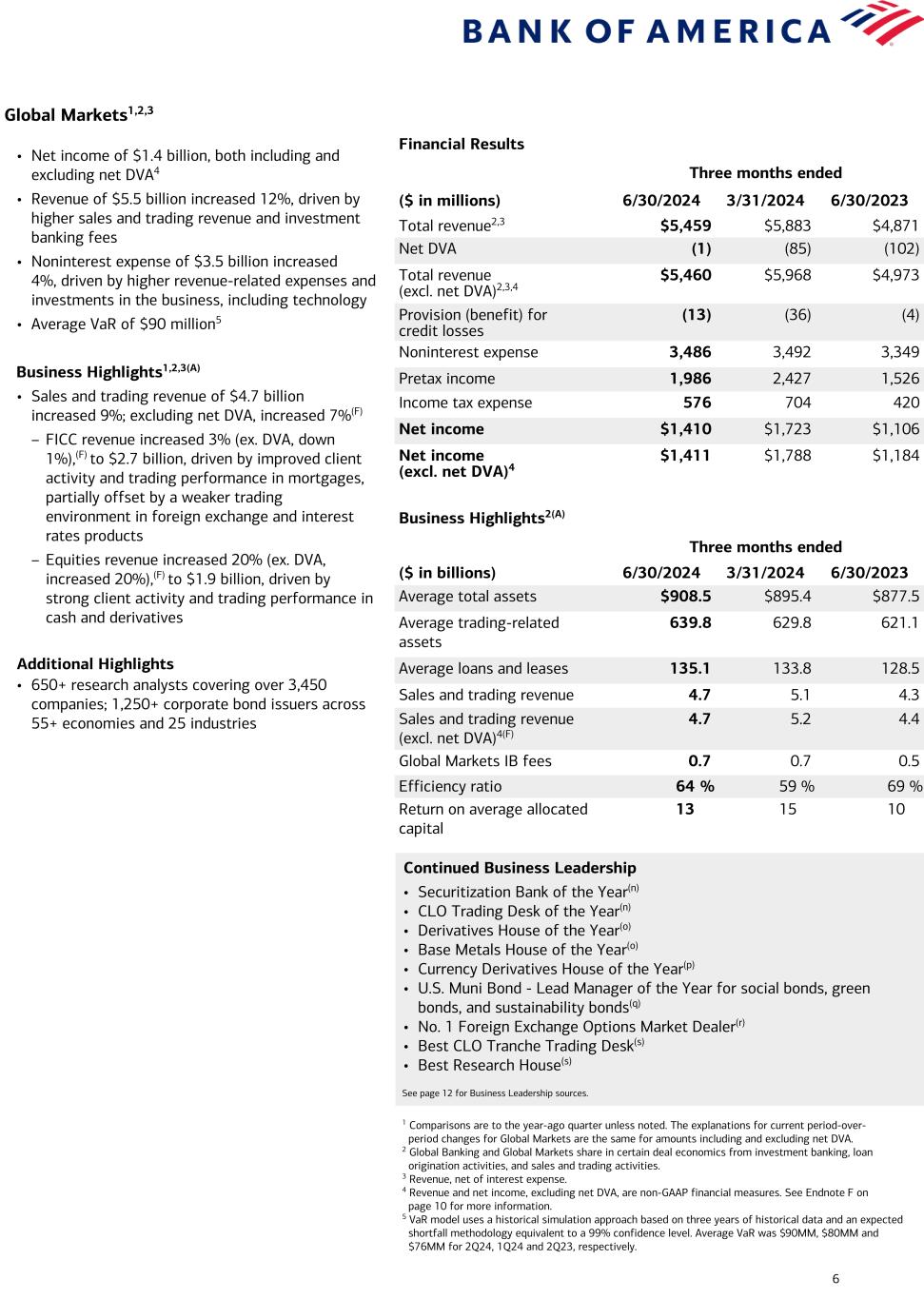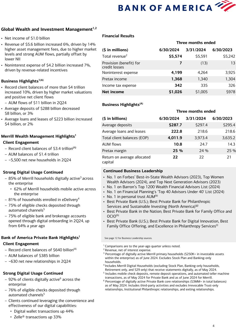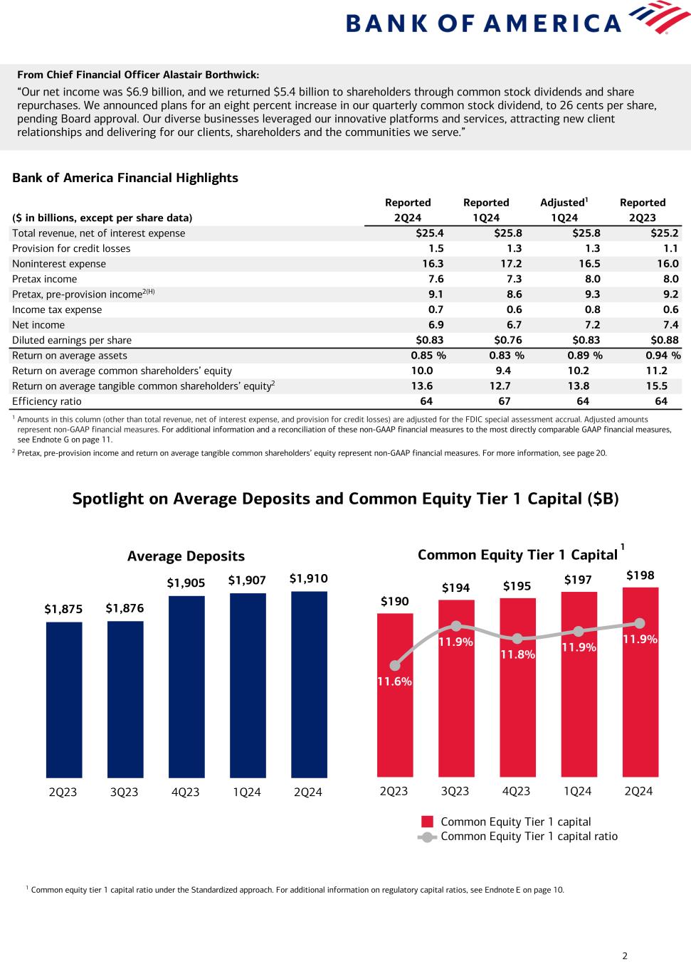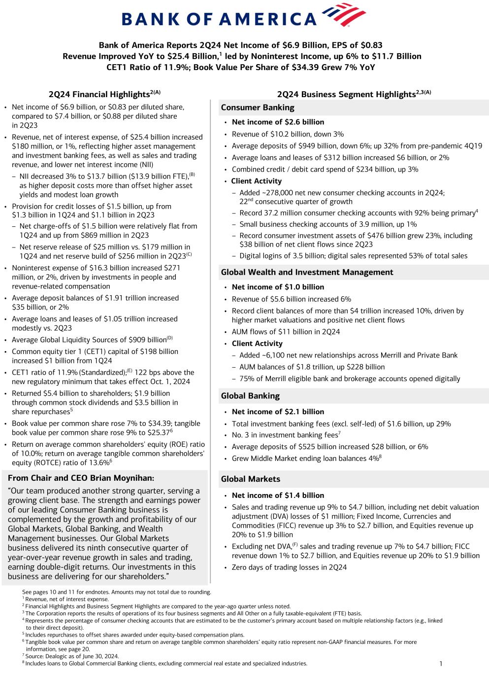1 2Q24 Financial Highlights2(A) 2Q24 Business Segment Highlights2,3(A) Consumer Banking Global Wealth and Investment Management Global Banking Global Markets See pages 10 and 11 for endnotes. Amounts may not total due to rounding. 1 Revenue, net of interest expense. 2 Financial Highlights and Business Segment Highlights are compared to the year-ago quarter unless noted. 3 The Corporation reports the results of operations of its four business segments and All Other on a fully taxable-equivalent (FTE) basis. 4 Represents the percentage of consumer checking accounts that are estimated to be the customer’s primary account based on multiple relationship factors (e.g., linked to their direct deposit). 5 Includes repurchases to offset shares awarded under equity-based compensation plans. 6 Tangible book value per common share and return on average tangible common shareholders’ equity ratio represent non-GAAP financial measures. For more information, see page 20. 7 Source: Dealogic as of June 30, 2024. 8 Includes loans to Global Commercial Banking clients, excluding commercial real estate and specialized industries. • Net income of $6.9 billion, or $0.83 per diluted share, compared to $7.4 billion, or $0.88 per diluted share in 2Q23 • Revenue, net of interest expense, of $25.4 billion increased $180 million, or 1%, reflecting higher asset management and investment banking fees, as well as sales and trading revenue, and lower net interest income (NII) – NII decreased 3% to $13.7 billion ($13.9 billion FTE),(B) as higher deposit costs more than offset higher asset yields and modest loan growth • Provision for credit losses of $1.5 billion, up from $1.3 billion in 1Q24 and $1.1 billion in 2Q23 – Net charge-offs of $1.5 billion were relatively flat from 1Q24 and up from $869 million in 2Q23 – Net reserve release of $25 million vs. $179 million in 1Q24 and net reserve build of $256 million in 2Q23(C) • Noninterest expense of $16.3 billion increased $271 million, or 2%, driven by investments in people and revenue-related compensation • Average deposit balances of $1.91 trillion increased $35 billion, or 2% • Average loans and leases of $1.05 trillion increased modestly vs. 2Q23 • Average Global Liquidity Sources of $909 billion(D) • Common equity tier 1 (CET1) capital of $198 billion increased $1 billion from 1Q24 • CET1 ratio of 11.9% (Standardized);(E) 122 bps above the new regulatory minimum that takes effect Oct. 1, 2024 • Returned $5.4 billion to shareholders; $1.9 billion through common stock dividends and $3.5 billion in share repurchases5 • Book value per common share rose 7% to $34.39; tangible book value per common share rose 9% to $25.376 • Return on average common shareholders' equity (ROE) ratio of 10.0%; return on average tangible common shareholders' equity (ROTCE) ratio of 13.6%6 • Net income of $1.4 billion • Sales and trading revenue up 9% to $4.7 billion, including net debit valuation adjustment (DVA) losses of $1 million; Fixed Income, Currencies and Commodities (FICC) revenue up 3% to $2.7 billion, and Equities revenue up 20% to $1.9 billion • Excluding net DVA,(F) sales and trading revenue up 7% to $4.7 billion; FICC revenue down 1% to $2.7 billion, and Equities revenue up 20% to $1.9 billion • Zero days of trading losses in 2Q24 From Chair and CEO Brian Moynihan: “Our team produced another strong quarter, serving a growing client base. The strength and earnings power of our leading Consumer Banking business is complemented by the growth and profitability of our Global Markets, Global Banking, and Wealth Management businesses. Our Global Markets business delivered its ninth consecutive quarter of year-over-year revenue growth in sales and trading, earning double-digit returns. Our investments in this business are delivering for our shareholders.” • Net income of $1.0 billion • Revenue of $5.6 billion increased 6% • Record client balances of more than $4 trillion increased 10%, driven by higher market valuations and positive net client flows • AUM flows of $11 billion in 2Q24 • Client Activity – Added ~6,100 net new relationships across Merrill and Private Bank – AUM balances of $1.8 trillion, up $228 billion – 75% of Merrill eligible bank and brokerage accounts opened digitally • Net income of $2.1 billion • Total investment banking fees (excl. self-led) of $1.6 billion, up 29% • No. 3 in investment banking fees7 • Average deposits of $525 billion increased $28 billion, or 6% • Grew Middle Market ending loan balances 4%8 • Net income of $2.6 billion • Revenue of $10.2 billion, down 3% • Average deposits of $949 billion, down 6%; up 32% from pre-pandemic 4Q19 • Average loans and leases of $312 billion increased $6 billion, or 2% • Combined credit / debit card spend of $234 billion, up 3% • Client Activity – Added ~278,000 net new consumer checking accounts in 2Q24; 22nd consecutive quarter of growth – Record 37.2 million consumer checking accounts with 92% being primary4 – Small business checking accounts of 3.9 million, up 1% – Record consumer investment assets of $476 billion grew 23%, including $38 billion of net client flows since 2Q23 – Digital logins of 3.5 billion; digital sales represented 53% of total sales Bank of America Reports 2Q24 Net Income of $6.9 Billion, EPS of $0.83 Revenue Improved YoY to $25.4 Billion,1 led by Noninterest Income, up 6% to $11.7 Billion CET1 Ratio of 11.9%; Book Value Per Share of $34.39 Grew 7% YoY
