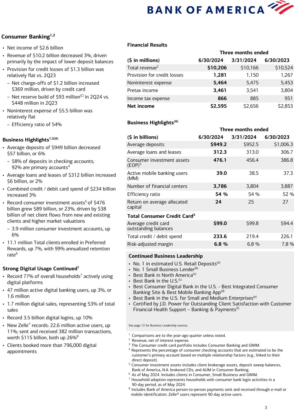 2 Bank of America Financial Highlights Reported Reported Adjusted1 Reported ($ in billions, except per share data) 2Q24 1Q24 1Q24 2Q23 Total revenue, net of interest expense $25.4 $25.8 $25.8 $25.2 Provision for credit losses 1.5 1.3 1.3 1.1 Noninterest expense 16.3 17.2 16.5 16.0 Pretax income 7.6 7.3 8.0 8.0 Pretax, pre-provision income2(H) 9.1 8.6 9.3 9.2 Income tax expense 0.7 0.6 0.8 0.6 Net income 6.9 6.7 7.2 7.4 Diluted earnings per share $0.83 $0.76 $0.83 $0.88 Return on average assets 0.85 % 0.83 % 0.89 % 0.94 % Return on average common shareholders’ equity 10.0 9.4 10.2 11.2 Return on average tangible common shareholders’ equity2 13.6 12.7 13.8 15.5 Efficiency ratio 64 67 64 64 1 Amounts in this column (other than total revenue, net of interest expense, and provision for credit losses) are adjusted for the FDIC special assessment accrual. Adjusted amounts represent non-GAAP financial measures. For additional information and a reconciliation of these non-GAAP financial measures to the most directly comparable GAAP financial measures, see Endnote G on page 11. 2 Pretax, pre-provision income and return on average tangible common shareholders’ equity represent non-GAAP financial measures. For more information, see page 20. From Chief Financial Officer Alastair Borthwick: “Our net income was $6.9 billion, and we returned $5.4 billion to shareholders through common stock dividends and share repurchases. We announced plans for an eight percent increase in our quarterly common stock dividend, to 26 cents per share, pending Board approval. Our diverse businesses leveraged our innovative platforms and services, attracting new client relationships and delivering for our clients, shareholders and the communities we serve.” Common Equity Tier 1 Capital $190 $194 $195 $197 $198 11.6% 11.9% 11.8% 11.9% 11.9% Common Equity Tier 1 capital Common Equity Tier 1 capital ratio 2Q23 3Q23 4Q23 1Q24 2Q24 Average Deposits $1,875 $1,876 $1,905 $1,907 $1,910 2Q23 3Q23 4Q23 1Q24 2Q24 Spotlight on Average Deposits and Common Equity Tier 1 Capital ($B) 1 1 Common equity tier 1 capital ratio under the Standardized approach. For additional information on regulatory capital ratios, see Endnote E on page 10.