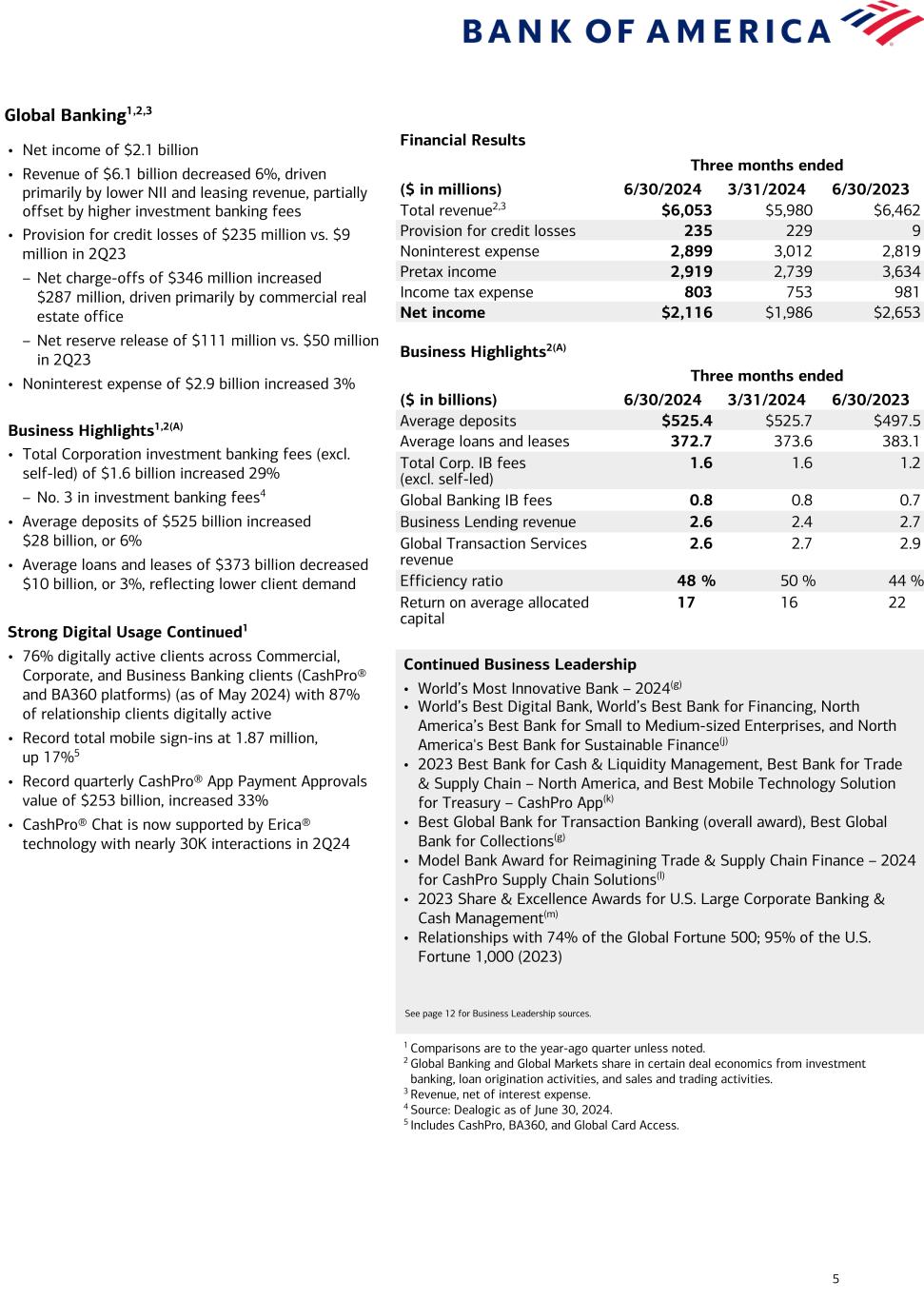 4 Global Wealth and Investment Management1,2 Financial Results Three months ended ($ in millions) 6/30/2024 3/31/2024 6/30/2023 Total revenue2 $5,574 $5,591 $5,242 Provision (benefit) for credit losses 7 (13) 13 Noninterest expense 4,199 4,264 3,925 Pretax income 1,368 1,340 1,304 Income tax expense 342 335 326 Net income $1,026 $1,005 $978 Business Highlights(A) Three months ended ($ in billions) 6/30/2024 3/31/2024 6/30/2023 Average deposits $287.7 $297.4 $295.4 Average loans and leases 222.8 218.6 218.6 Total client balances (EOP) 4,011.9 3,973.4 3,635.2 AUM flows 10.8 24.7 14.3 Pretax margin 25 % 24 % 25 % Return on average allocated capital 22 22 21 Continued Business Leadership • No. 1 on Forbes’ Best-in-State Wealth Advisors (2023), Top Women Wealth Advisors (2024), and Top Next Generation Advisors (2023) • No. 1 on Barron’s Top 1200 Wealth Financial Advisors List (2024) • No. 1 on Financial Planning's 'Top 40 Advisors Under 40' List (2024) • No. 1 in personal trust AUM(b) • Best Private Bank (U.S.); Best Private Bank for Philanthropic Services and Sustainable Investing (North America)(g) • Best Private Bank in the Nation; Best Private Bank for Family Office and OCIO(h) • Best Private Bank (U.S.); Best Private Bank for Digital Innovation, Best Family Office Offering, and Excellence in Philanthropy Services(i) See page 12 for Business Leadership sources. • Net income of $1.0 billion • Revenue of $5.6 billion increased 6%, driven by 14% higher asset management fees, due to higher market levels and strong AUM flows, partially offset by lower NII • Noninterest expense of $4.2 billion increased 7%, driven by revenue-related incentives Business Highlights1(A) • Record client balances of more than $4 trillion increased 10%, driven by higher market valuations and positive net client flows – AUM flows of $11 billion in 2Q24 • Average deposits of $288 billion decreased $8 billion, or 3% • Average loans and leases of $223 billion increased $4 billion, or 2% Merrill Wealth Management Highlights1 Client Engagement – Record client balances of $3.4 trillion(A) – AUM balances of $1.4 trillion – ~5,500 net new households in 2Q24 Strong Digital Usage Continued – 85% of Merrill households digitally active3 across the enterprise ▪ 62% of Merrill households mobile active across the enterprise – 81% of households enrolled in eDelivery4 – 75% of eligible checks deposited through automated channels5 – 75% of eligible bank and brokerage accounts opened through digital onboarding in 2Q24, up from 64% a year ago Bank of America Private Bank Highlights1 Client Engagement – Record client balances of $640 billion(A) – AUM balances of $385 billion – ~630 net new relationships in 2Q24 Strong Digital Usage Continued – 92% of clients digitally active6 across the enterprise – 76% of eligible checks deposited through automated channels5 – Clients continued leveraging the convenience and effectiveness of our digital capabilities: ▪ Digital wallet transactions up 44% ▪ Zelle® transactions up 33% 1 Comparisons are to the year-ago quarter unless noted. 2 Revenue, net of interest expense. 3 Percentage of digitally active Merrill primary households ($250K+ in investable assets within the enterprise) as of June 2024. Excludes Stock Plan and Banking-only households. 4 Includes Merrill Digital Households (excluding Stock Plan, Banking-only households, Retirement only, and 529 only) that receive statements digitally, as of May 2024. 5 Includes mobile check deposits, remote deposit operations, and automated teller machine transactions, as of May 2024 for Private Bank and as of June 2024 for Merrill. 6 Percentage of digitally active Private Bank core relationships ($3MM+ in total balances) as of May 2024. Includes third-party activities and excludes Irrevocable Trust-only relationships, Institutional Philanthropic relationships, and exiting relationships.