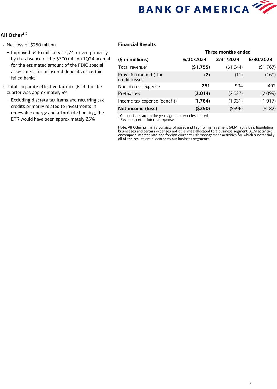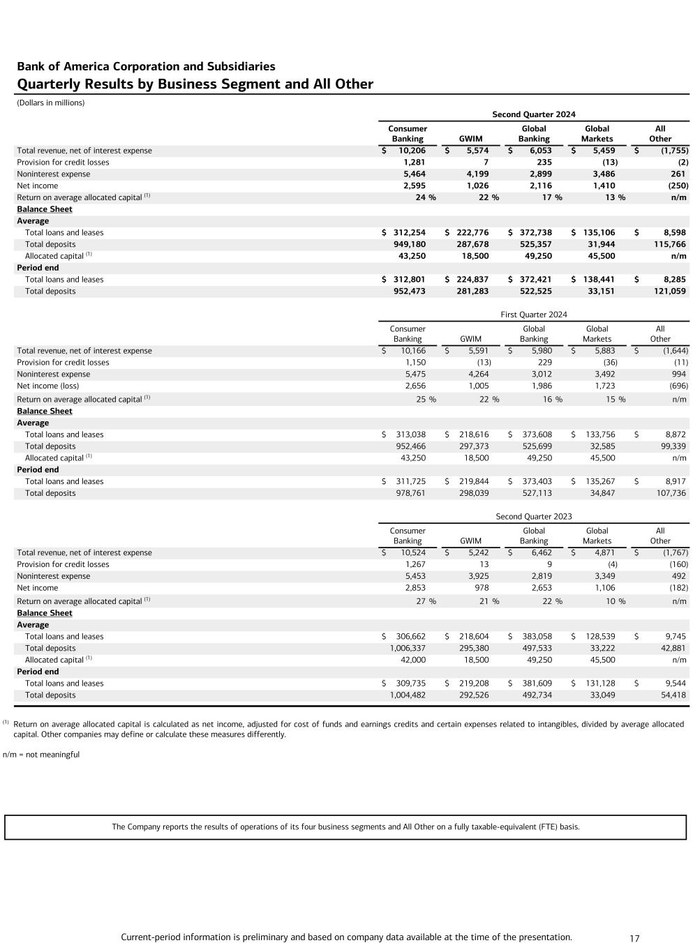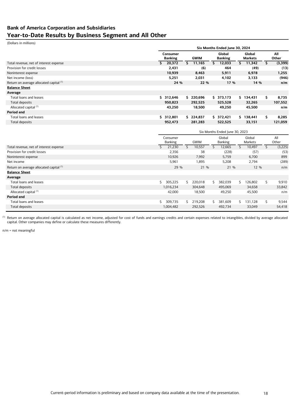 Current-period information is preliminary and based on company data available at the time of the presentation. 17 Bank of America Corporation and Subsidiaries Quarterly Results by Business Segment and All Other (Dollars in millions) Second Quarter 2024 Consumer Banking GWIM Global Banking Global Markets All Other Total revenue, net of interest expense $ 10,206 $ 5,574 $ 6,053 $ 5,459 $ (1,755) Provision for credit losses 1,281 7 235 (13) (2) Noninterest expense 5,464 4,199 2,899 3,486 261 Net income 2,595 1,026 2,116 1,410 (250) Return on average allocated capital (1) 24 % 22 % 17 % 13 % n/m Balance Sheet Average Total loans and leases $ 312,254 $ 222,776 $ 372,738 $ 135,106 $ 8,598 Total deposits 949,180 287,678 525,357 31,944 115,766 Allocated capital (1) 43,250 18,500 49,250 45,500 n/m Period end Total loans and leases $ 312,801 $ 224,837 $ 372,421 $ 138,441 $ 8,285 Total deposits 952,473 281,283 522,525 33,151 121,059 First Quarter 2024 Consumer Banking GWIM Global Banking Global Markets All Other Total revenue, net of interest expense $ 10,166 $ 5,591 $ 5,980 $ 5,883 $ (1,644) Provision for credit losses 1,150 (13) 229 (36) (11) Noninterest expense 5,475 4,264 3,012 3,492 994 Net income (loss) 2,656 1,005 1,986 1,723 (696) Return on average allocated capital (1) 25 % 22 % 16 % 15 % n/m Balance Sheet Average Total loans and leases $ 313,038 $ 218,616 $ 373,608 $ 133,756 $ 8,872 Total deposits 952,466 297,373 525,699 32,585 99,339 Allocated capital (1) 43,250 18,500 49,250 45,500 n/m Period end Total loans and leases $ 311,725 $ 219,844 $ 373,403 $ 135,267 $ 8,917 Total deposits 978,761 298,039 527,113 34,847 107,736 Second Quarter 2023 Consumer Banking GWIM Global Banking Global Markets All Other Total revenue, net of interest expense $ 10,524 $ 5,242 $ 6,462 $ 4,871 $ (1,767) Provision for credit losses 1,267 13 9 (4) (160) Noninterest expense 5,453 3,925 2,819 3,349 492 Net income 2,853 978 2,653 1,106 (182) Return on average allocated capital (1) 27 % 21 % 22 % 10 % n/m Balance Sheet Average Total loans and leases $ 306,662 $ 218,604 $ 383,058 $ 128,539 $ 9,745 Total deposits 1,006,337 295,380 497,533 33,222 42,881 Allocated capital (1) 42,000 18,500 49,250 45,500 n/m Period end Total loans and leases $ 309,735 $ 219,208 $ 381,609 $ 131,128 $ 9,544 Total deposits 1,004,482 292,526 492,734 33,049 54,418 (1) Return on average allocated capital is calculated as net income, adjusted for cost of funds and earnings credits and certain expenses related to intangibles, divided by average allocated capital. Other companies may define or calculate these measures differently. n/m = not meaningful The Company reports the results of operations of its four business segments and All Other on a fully taxable-equivalent (FTE) basis.