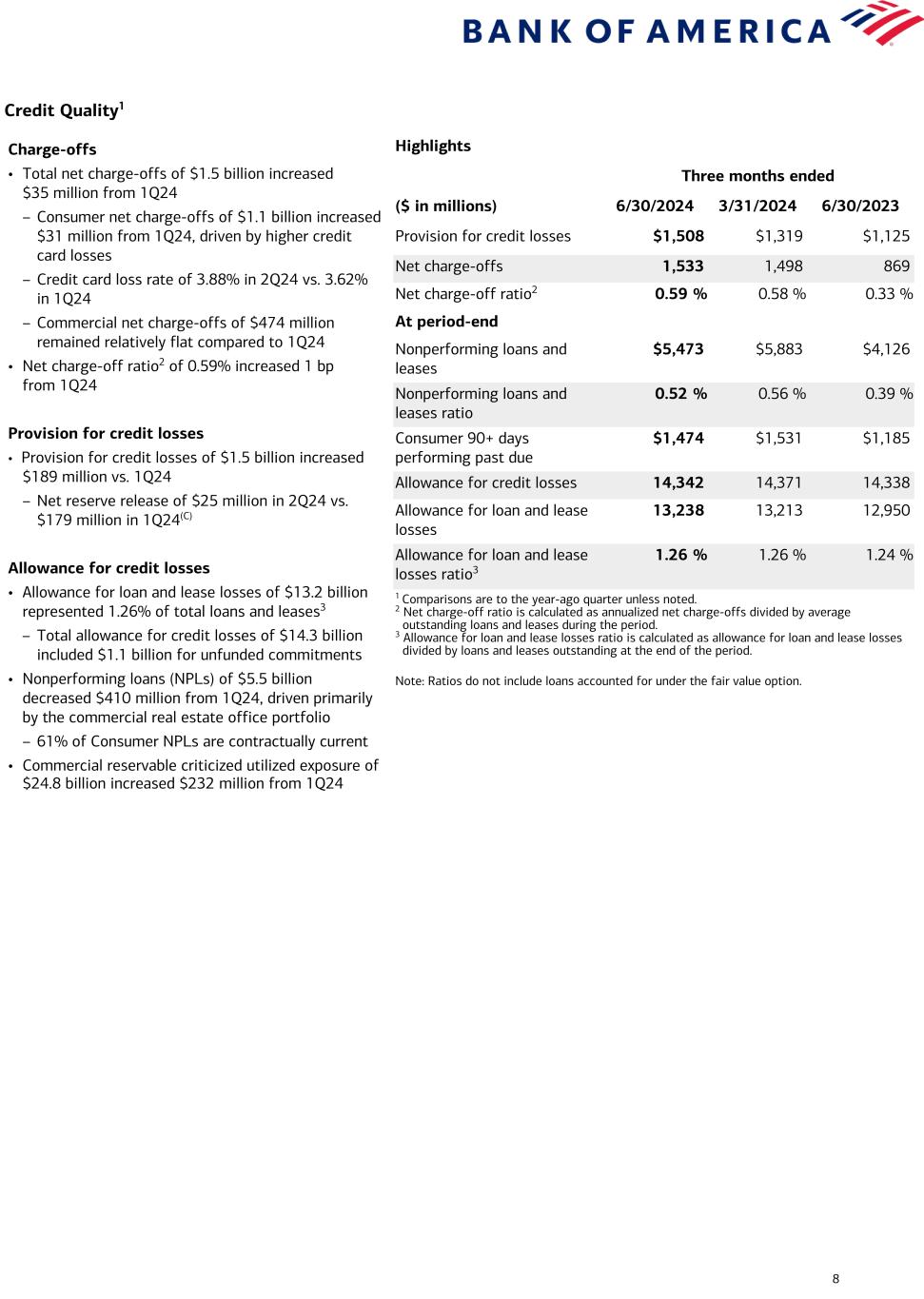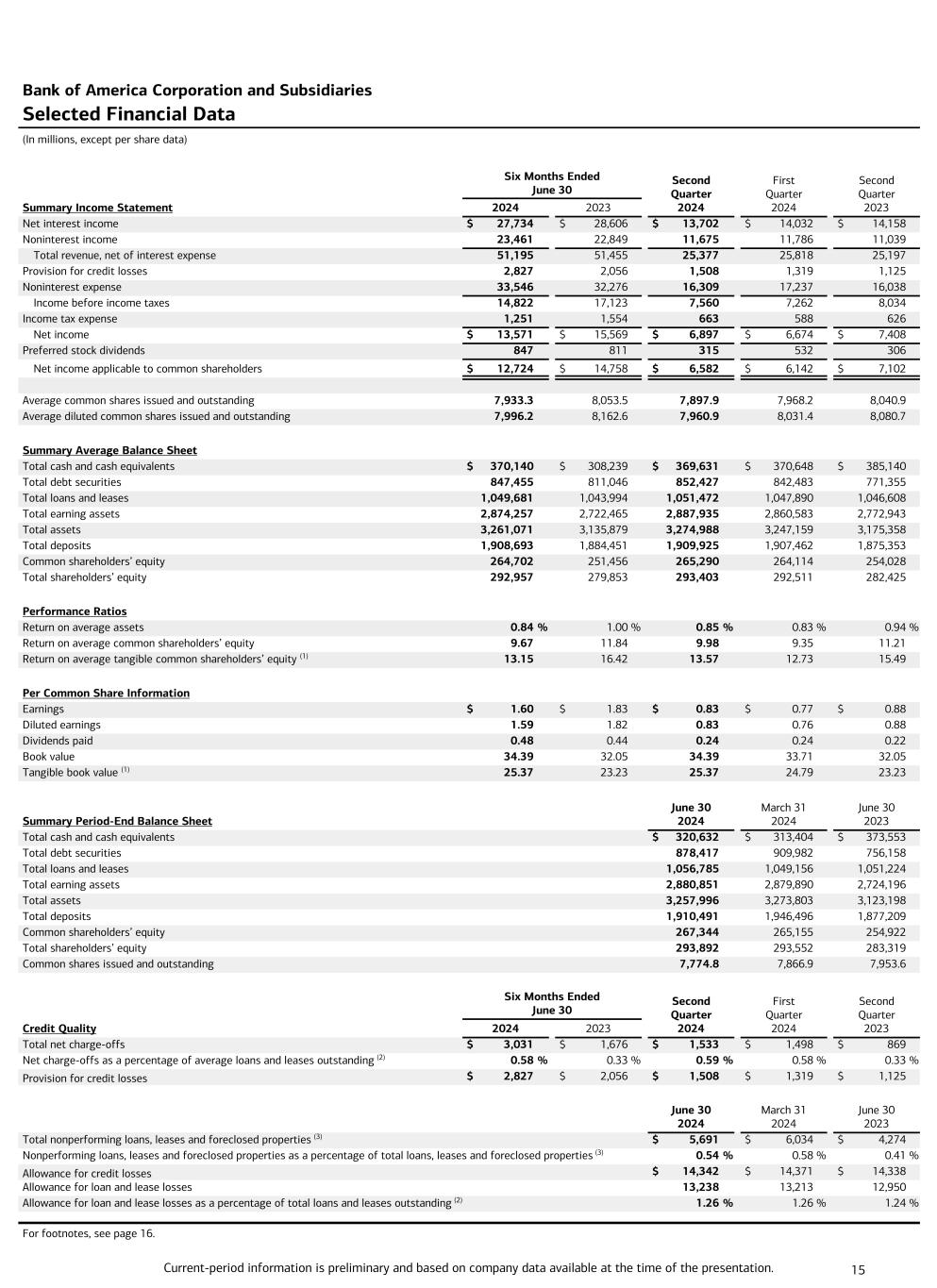 Current-period information is preliminary and based on company data available at the time of the presentation. 15 Bank of America Corporation and Subsidiaries Selected Financial Data (In millions, except per share data) Six Months Ended June 30 Second Quarter 2024 First Quarter 2024 Second Quarter 2023Summary Income Statement 2024 2023 Net interest income $ 27,734 $ 28,606 $ 13,702 $ 14,032 $ 14,158 Noninterest income 23,461 22,849 11,675 11,786 11,039 Total revenue, net of interest expense 51,195 51,455 25,377 25,818 25,197 Provision for credit losses 2,827 2,056 1,508 1,319 1,125 Noninterest expense 33,546 32,276 16,309 17,237 16,038 Income before income taxes 14,822 17,123 7,560 7,262 8,034 Income tax expense 1,251 1,554 663 588 626 Net income $ 13,571 $ 15,569 $ 6,897 $ 6,674 $ 7,408 Preferred stock dividends 847 811 315 532 306 Net income applicable to common shareholders $ 12,724 $ 14,758 $ 6,582 $ 6,142 $ 7,102 Average common shares issued and outstanding 7,933.3 8,053.5 7,897.9 7,968.2 8,040.9 Average diluted common shares issued and outstanding 7,996.2 8,162.6 7,960.9 8,031.4 8,080.7 Summary Average Balance Sheet Total cash and cash equivalents $ 370,140 $ 308,239 $ 369,631 $ 370,648 $ 385,140 Total debt securities 847,455 811,046 852,427 842,483 771,355 Total loans and leases 1,049,681 1,043,994 1,051,472 1,047,890 1,046,608 Total earning assets 2,874,257 2,722,465 2,887,935 2,860,583 2,772,943 Total assets 3,261,071 3,135,879 3,274,988 3,247,159 3,175,358 Total deposits 1,908,693 1,884,451 1,909,925 1,907,462 1,875,353 Common shareholders’ equity 264,702 251,456 265,290 264,114 254,028 Total shareholders’ equity 292,957 279,853 293,403 292,511 282,425 Performance Ratios Return on average assets 0.84 % 1.00 % 0.85 % 0.83 % 0.94 % Return on average common shareholders’ equity 9.67 11.84 9.98 9.35 11.21 Return on average tangible common shareholders’ equity (1) 13.15 16.42 13.57 12.73 15.49 Per Common Share Information Earnings $ 1.60 $ 1.83 $ 0.83 $ 0.77 $ 0.88 Diluted earnings 1.59 1.82 0.83 0.76 0.88 Dividends paid 0.48 0.44 0.24 0.24 0.22 Book value 34.39 32.05 34.39 33.71 32.05 Tangible book value (1) 25.37 23.23 25.37 24.79 23.23 Summary Period-End Balance Sheet June 30 2024 March 31 2024 June 30 2023 Total cash and cash equivalents $ 320,632 $ 313,404 $ 373,553 Total debt securities 878,417 909,982 756,158 Total loans and leases 1,056,785 1,049,156 1,051,224 Total earning assets 2,880,851 2,879,890 2,724,196 Total assets 3,257,996 3,273,803 3,123,198 Total deposits 1,910,491 1,946,496 1,877,209 Common shareholders’ equity 267,344 265,155 254,922 Total shareholders’ equity 293,892 293,552 283,319 Common shares issued and outstanding 7,774.8 7,866.9 7,953.6 Six Months Ended June 30 Second Quarter 2024 First Quarter 2024 Second Quarter 2023Credit Quality 2024 2023 Total net charge-offs $ 3,031 $ 1,676 $ 1,533 $ 1,498 $ 869 Net charge-offs as a percentage of average loans and leases outstanding (2) 0.58 % 0.33 % 0.59 % 0.58 % 0.33 % Provision for credit losses $ 2,827 $ 2,056 $ 1,508 $ 1,319 $ 1,125 June 30 2024 March 31 2024 June 30 2023 Total nonperforming loans, leases and foreclosed properties (3) $ 5,691 $ 6,034 $ 4,274 Nonperforming loans, leases and foreclosed properties as a percentage of total loans, leases and foreclosed properties (3) 0.54 % 0.58 % 0.41 % Allowance for credit losses $ 14,342 $ 14,371 $ 14,338 Allowance for loan and lease losses 13,238 13,213 12,950 Allowance for loan and lease losses as a percentage of total loans and leases outstanding (2) 1.26 % 1.26 % 1.24 % For footnotes, see page 16.