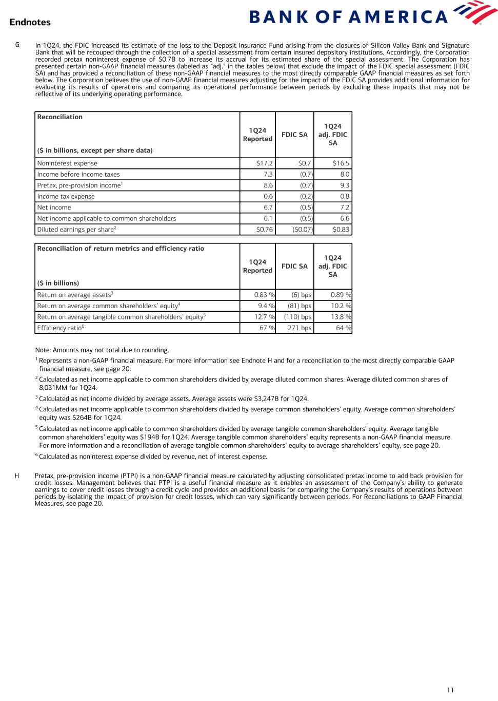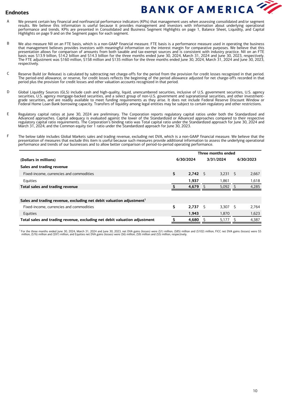 10 Endnotes Three months ended (Dollars in millions) 6/30/2024 3/31/2024 6/30/2023 Sales and trading revenue Fixed-income, currencies and commodities $ 2,742 $ 3,231 $ 2,667 Equities 1,937 1,861 1,618 Total sales and trading revenue $ 4,679 $ 5,092 $ 4,285 Sales and trading revenue, excluding net debit valuation adjustment1 Fixed-income, currencies and commodities $ 2,737 $ 3,307 $ 2,764 Equities 1,943 1,870 1,623 Total sales and trading revenue, excluding net debit valuation adjustment $ 4,680 $ 5,177 $ 4,387 A We present certain key financial and nonfinancial performance indicators (KPIs) that management uses when assessing consolidated and/or segment results. We believe this information is useful because it provides management and investors with information about underlying operational performance and trends. KPIs are presented in Consolidated and Business Segment Highlights on page 1, Balance Sheet, Liquidity, and Capital Highlights on page 9 and on the Segment pages for each segment. B We also measure NII on an FTE basis, which is a non-GAAP financial measure. FTE basis is a performance measure used in operating the business that management believes provides investors with meaningful information on the interest margin for comparative purposes. We believe that this presentation allows for comparison of amounts from both taxable and tax-exempt sources and is consistent with industry practice. NII on an FTE basis was $13.9 billion, $14.2 billion and $14.3 billion for the three months ended June 30, 2024, March 31, 2024 and June 30, 2023, respectively. The FTE adjustment was $160 million, $158 million and $135 million for the three months ended June 30, 2024, March 31, 2024 and June 30, 2023, respectively. C Reserve Build (or Release) is calculated by subtracting net charge-offs for the period from the provision for credit losses recognized in that period. The period-end allowance, or reserve, for credit losses reflects the beginning of the period allowance adjusted for net charge-offs recorded in that period plus the provision for credit losses and other valuation accounts recognized in that period. D Global Liquidity Sources (GLS) include cash and high-quality, liquid, unencumbered securities, inclusive of U.S. government securities, U.S. agency securities, U.S. agency mortgage-backed securities, and a select group of non-U.S. government and supranational securities, and other investment- grade securities, and are readily available to meet funding requirements as they arise. It does not include Federal Reserve Discount Window or Federal Home Loan Bank borrowing capacity. Transfers of liquidity among legal entities may be subject to certain regulatory and other restrictions. E Regulatory capital ratios at June 30, 2024 are preliminary. The Corporation reports regulatory capital ratios under both the Standardized and Advanced approaches. Capital adequacy is evaluated against the lower of the Standardized or Advanced approaches compared to their respective regulatory capital ratio requirements. The Corporation’s binding ratio was Total capital ratio under the Standardized approach for June 30, 2024 and March 31, 2024; and the Common equity tier 1 ratio under the Standardized approach for June 30, 2023. F The below table includes Global Markets sales and trading revenue, excluding net DVA, which is a non-GAAP financial measure. We believe that the presentation of measures that exclude this item is useful because such measures provide additional information to assess the underlying operational performance and trends of our businesses and to allow better comparison of period-to-period operating performance. 1 For the three months ended June 30, 2024, March 31, 2024 and June 30, 2023, net DVA gains (losses) were ($1) million, ($85) million and ($102) million, FICC net DVA gains (losses) were $5 million, ($76) million and ($97) million, and Equities net DVA gains (losses) were ($6) million, ($9) million and ($5) million, respectively.