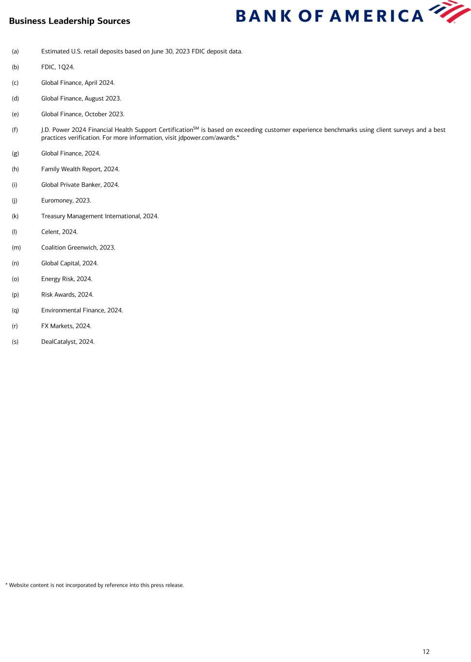 12 (a) Estimated U.S. retail deposits based on June 30, 2023 FDIC deposit data. (b) FDIC, 1Q24. (c) Global Finance, April 2024. (d) Global Finance, August 2023. (e) Global Finance, October 2023. (f) J.D. Power 2024 Financial Health Support CertificationSM is based on exceeding customer experience benchmarks using client surveys and a best practices verification. For more information, visit jdpower.com/awards.* (g) Global Finance, 2024. (h) Family Wealth Report, 2024. (i) Global Private Banker, 2024. (j) Euromoney, 2023. (k) Treasury Management International, 2024. (l) Celent, 2024. (m) Coalition Greenwich, 2023. (n) Global Capital, 2024. (o) Energy Risk, 2024. (p) Risk Awards, 2024. (q) Environmental Finance, 2024. (r) FX Markets, 2024. (s) DealCatalyst, 2024. Business Leadership Sources * Website content is not incorporated by reference into this press release.