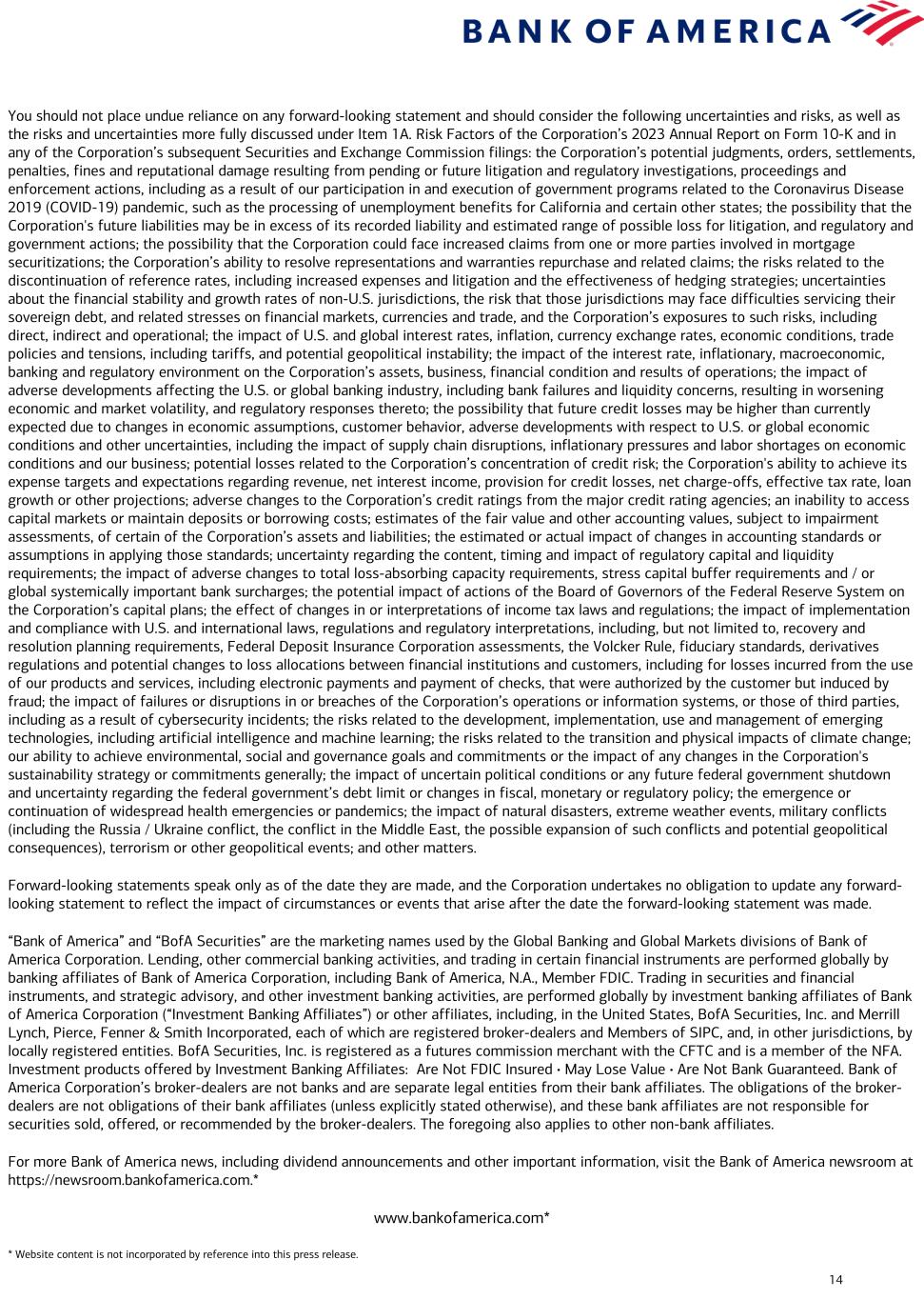 14 You should not place undue reliance on any forward-looking statement and should consider the following uncertainties and risks, as well as the risks and uncertainties more fully discussed under Item 1A. Risk Factors of the Corporation’s 2023 Annual Report on Form 10-K and in any of the Corporation’s subsequent Securities and Exchange Commission filings: the Corporation’s potential judgments, orders, settlements, penalties, fines and reputational damage resulting from pending or future litigation and regulatory investigations, proceedings and enforcement actions, including as a result of our participation in and execution of government programs related to the Coronavirus Disease 2019 (COVID-19) pandemic, such as the processing of unemployment benefits for California and certain other states; the possibility that the Corporation's future liabilities may be in excess of its recorded liability and estimated range of possible loss for litigation, and regulatory and government actions; the possibility that the Corporation could face increased claims from one or more parties involved in mortgage securitizations; the Corporation’s ability to resolve representations and warranties repurchase and related claims; the risks related to the discontinuation of reference rates, including increased expenses and litigation and the effectiveness of hedging strategies; uncertainties about the financial stability and growth rates of non-U.S. jurisdictions, the risk that those jurisdictions may face difficulties servicing their sovereign debt, and related stresses on financial markets, currencies and trade, and the Corporation’s exposures to such risks, including direct, indirect and operational; the impact of U.S. and global interest rates, inflation, currency exchange rates, economic conditions, trade policies and tensions, including tariffs, and potential geopolitical instability; the impact of the interest rate, inflationary, macroeconomic, banking and regulatory environment on the Corporation’s assets, business, financial condition and results of operations; the impact of adverse developments affecting the U.S. or global banking industry, including bank failures and liquidity concerns, resulting in worsening economic and market volatility, and regulatory responses thereto; the possibility that future credit losses may be higher than currently expected due to changes in economic assumptions, customer behavior, adverse developments with respect to U.S. or global economic conditions and other uncertainties, including the impact of supply chain disruptions, inflationary pressures and labor shortages on economic conditions and our business; potential losses related to the Corporation’s concentration of credit risk; the Corporation's ability to achieve its expense targets and expectations regarding revenue, net interest income, provision for credit losses, net charge-offs, effective tax rate, loan growth or other projections; adverse changes to the Corporation’s credit ratings from the major credit rating agencies; an inability to access capital markets or maintain deposits or borrowing costs; estimates of the fair value and other accounting values, subject to impairment assessments, of certain of the Corporation’s assets and liabilities; the estimated or actual impact of changes in accounting standards or assumptions in applying those standards; uncertainty regarding the content, timing and impact of regulatory capital and liquidity requirements; the impact of adverse changes to total loss-absorbing capacity requirements, stress capital buffer requirements and / or global systemically important bank surcharges; the potential impact of actions of the Board of Governors of the Federal Reserve System on the Corporation’s capital plans; the effect of changes in or interpretations of income tax laws and regulations; the impact of implementation and compliance with U.S. and international laws, regulations and regulatory interpretations, including, but not limited to, recovery and resolution planning requirements, Federal Deposit Insurance Corporation assessments, the Volcker Rule, fiduciary standards, derivatives regulations and potential changes to loss allocations between financial institutions and customers, including for losses incurred from the use of our products and services, including electronic payments and payment of checks, that were authorized by the customer but induced by fraud; the impact of failures or disruptions in or breaches of the Corporation’s operations or information systems, or those of third parties, including as a result of cybersecurity incidents; the risks related to the development, implementation, use and management of emerging technologies, including artificial intelligence and machine learning; the risks related to the transition and physical impacts of climate change; our ability to achieve environmental, social and governance goals and commitments or the impact of any changes in the Corporation's sustainability strategy or commitments generally; the impact of uncertain political conditions or any future federal government shutdown and uncertainty regarding the federal government’s debt limit or changes in fiscal, monetary or regulatory policy; the emergence or continuation of widespread health emergencies or pandemics; the impact of natural disasters, extreme weather events, military conflicts (including the Russia / Ukraine conflict, the conflict in the Middle East, the possible expansion of such conflicts and potential geopolitical consequences), terrorism or other geopolitical events; and other matters. Forward-looking statements speak only as of the date they are made, and the Corporation undertakes no obligation to update any forward- looking statement to reflect the impact of circumstances or events that arise after the date the forward-looking statement was made. “Bank of America” and “BofA Securities” are the marketing names used by the G