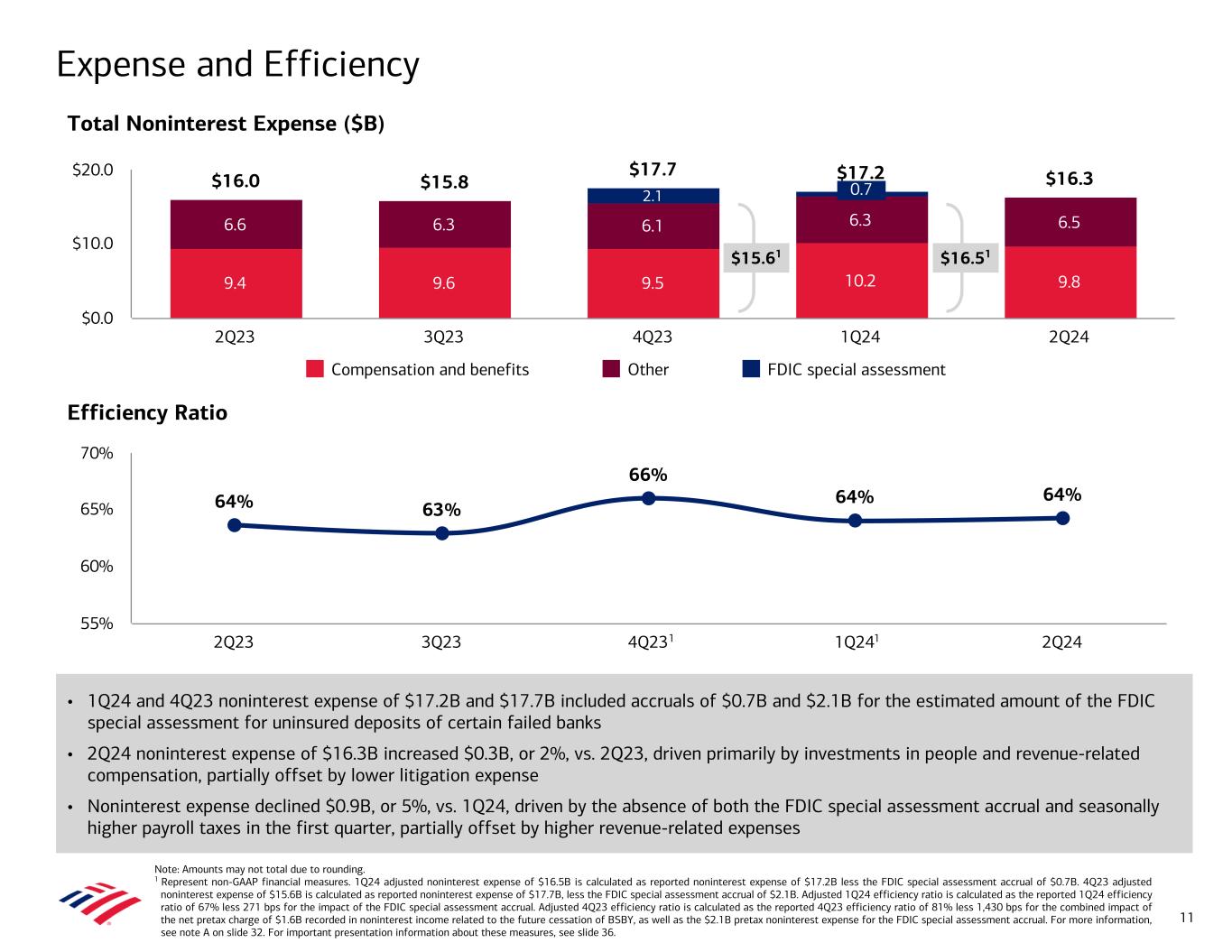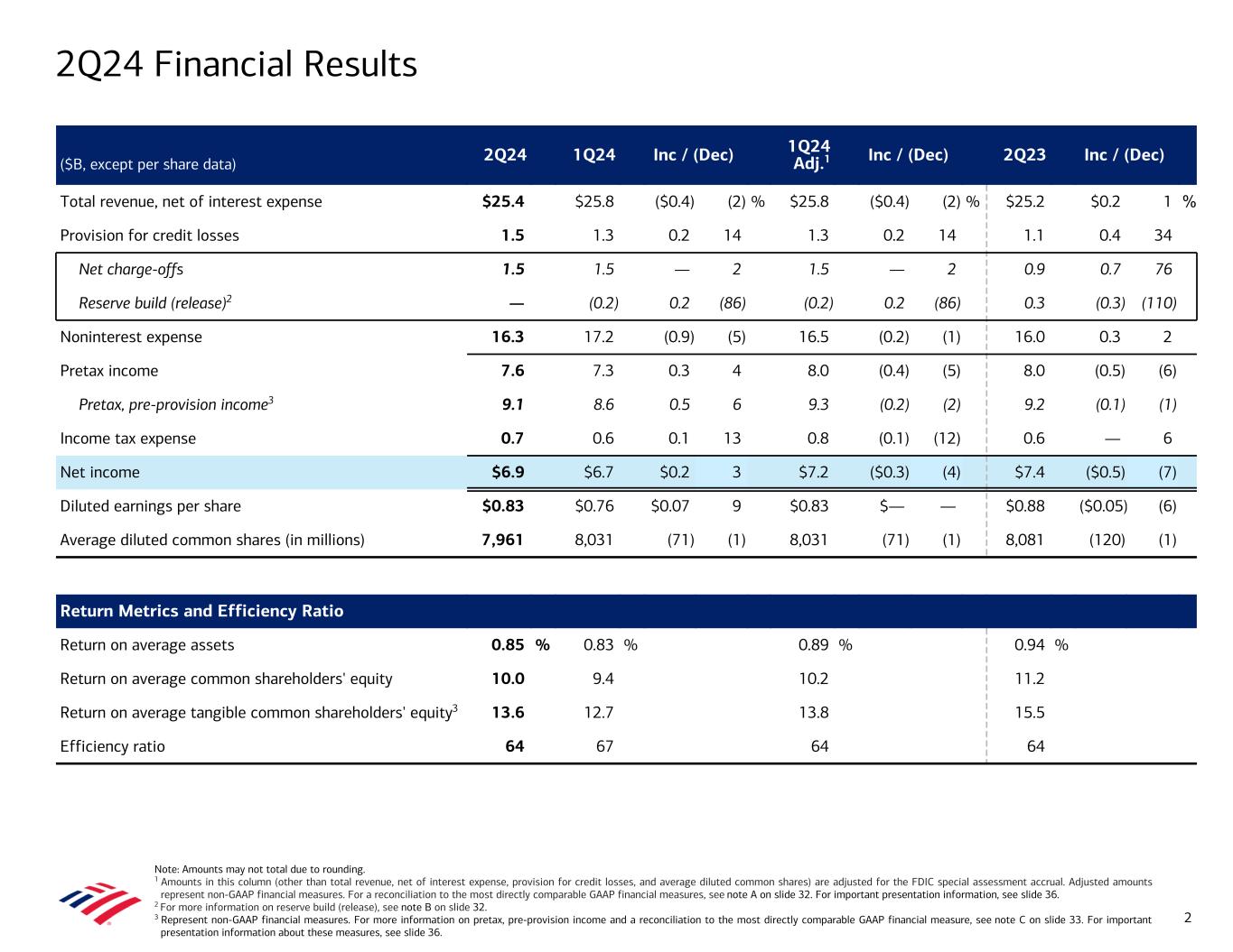 Note: Amounts may not total due to rounding. 1 Amounts in this column (other than total revenue, net of interest expense, provision for credit losses, and average diluted common shares) are adjusted for the FDIC special assessment accrual. Adjusted amounts represent non-GAAP financial measures. For a reconciliation to the most directly comparable GAAP financial measures, see note A on slide 32. For important presentation information, see slide 36. 2 For more information on reserve build (release), see note B on slide 32. 3 Represent non-GAAP financial measures. For more information on pretax, pre-provision income and a reconciliation to the most directly comparable GAAP financial measure, see note C on slide 33. For important presentation information about these measures, see slide 36. ($B, except per share data) 2Q24 1Q24 Inc / (Dec) 1Q24 Adj.1 Inc / (Dec) 2Q23 Inc / (Dec) Total revenue, net of interest expense $25.4 $25.8 ($0.4) (2) % $25.8 ($0.4) (2) % $25.2 $0.2 1 % Provision for credit losses 1.5 1.3 0.2 14 1.3 0.2 14 1.1 0.4 34 Net charge-offs 1.5 1.5 — 2 1.5 — 2 0.9 0.7 76 Reserve build (release)2 — (0.2) 0.2 (86) (0.2) 0.2 (86) 0.3 (0.3) (110) Noninterest expense 16.3 17.2 (0.9) (5) 16.5 (0.2) (1) 16.0 0.3 2 Pretax income 7.6 7.3 0.3 4 8.0 (0.4) (5) 8.0 (0.5) (6) Pretax, pre-provision income3 9.1 8.6 0.5 6 9.3 (0.2) (2) 9.2 (0.1) (1) Income tax expense 0.7 0.6 0.1 13 0.8 (0.1) (12) 0.6 — 6 Net income $6.9 $6.7 $0.2 3 $7.2 ($0.3) (4) $7.4 ($0.5) (7) Diluted earnings per share $0.83 $0.76 $0.07 9 $0.83 $— — $0.88 ($0.05) (6) Average diluted common shares (in millions) 7,961 8,031 (71) (1) 8,031 (71) (1) 8,081 (120) (1) Return Metrics and Efficiency Ratio Return on average assets 0.85 % 0.83 % 0.89 % 0.94 % Return on average common shareholders' equity 10.0 9.4 10.2 11.2 Return on average tangible common shareholders' equity3 13.6 12.7 13.8 15.5 Efficiency ratio 64 67 64 64 2Q24 Financial Results 2