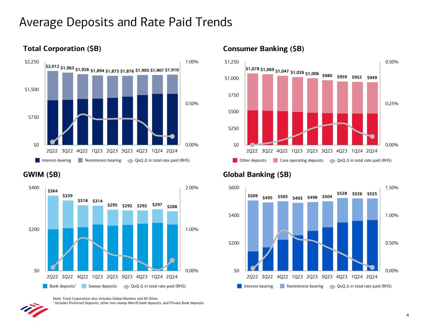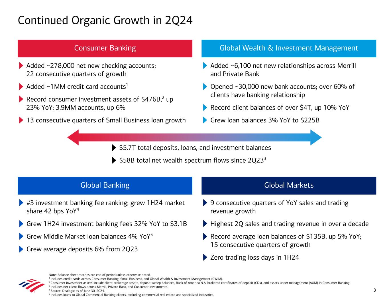 #3 investment banking fee ranking; grew 1H24 market share 42 bps YoY4 Grew 1H24 investment banking fees 32% YoY to $3.1B Grew Middle Market loan balances 4% YoY5 Grew average deposits 6% from 2Q23 9 consecutive quarters of YoY sales and trading revenue growth Highest 2Q sales and trading revenue in over a decade Record average loan balances of $135B, up 5% YoY; 15 consecutive quarters of growth Zero trading loss days in 1H24 Added ~6,100 net new relationships across Merrill and Private Bank Opened ~30,000 new bank accounts; over 60% of clients have banking relationship Record client balances of over $4T, up 10% YoY Grew loan balances 3% YoY to $225B Continued Organic Growth in 2Q24 3 Consumer Banking Global Wealth & Investment Management Global Banking Global Markets Added ~278,000 net new checking accounts; 22 consecutive quarters of growth Added ~1MM credit card accounts1 Record consumer investment assets of $476B,2 up 23% YoY; 3.9MM accounts, up 6% 13 consecutive quarters of Small Business loan growth $5.7T total deposits, loans, and investment balances $58B total net wealth spectrum flows since 2Q233 Note: Balance sheet metrics are end of period unless otherwise noted. 1 Includes credit cards across Consumer Banking, Small Business, and Global Wealth & Investment Management (GWIM). 2 Consumer investment assets include client brokerage assets, deposit sweep balances, Bank of America N.A. brokered certificates of deposit (CDs), and assets under management (AUM) in Consumer Banking. 3 Includes net client flows across Merrill, Private Bank, and Consumer Investments. 4 Source: Dealogic as of June 30, 2024. 5 Includes loans to Global Commercial Banking clients, excluding commercial real estate and specialized industries.