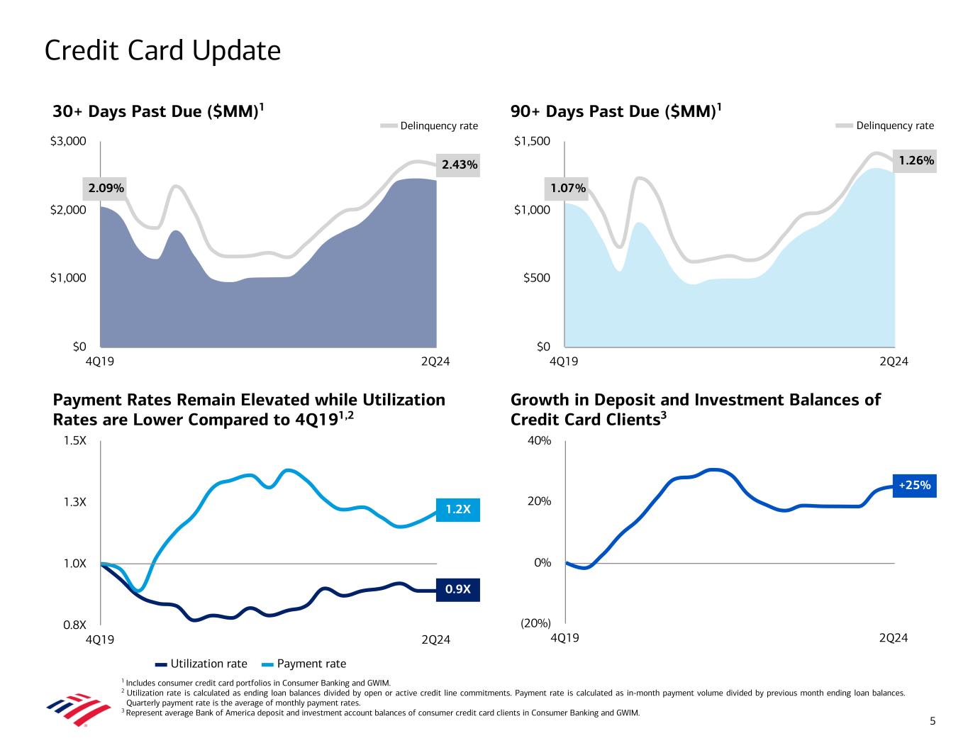 $2,012 $1,963 $1,926 $1,894 $1,875 $1,876 $1,905 $1,907 $1,910 Interest-bearing Noninterest-bearing QoQ Δ in total rate paid (RHS) 2Q22 3Q22 4Q22 1Q23 2Q23 3Q23 4Q23 1Q24 2Q24 $0 $750 $1,500 $2,250 0.00% 0.50% 1.00% Consumer Banking ($B) GWIM ($B) Global Banking ($B) Total Corporation ($B) Average Deposits and Rate Paid Trends 4 $1,078 $1,069 $1,047 $1,026 $1,006 $980 $959 $952 $949 Other deposits Core operating deposits QoQ Δ in total rate paid (RHS) 2Q22 3Q22 4Q22 1Q23 2Q23 3Q23 4Q23 1Q24 2Q24 $0 $250 $500 $750 $1,000 $1,250 0.00% 0.25% 0.50% $364 $339 $318 $314 $295 $292 $292 $297 $288 Bank deposits Sweep deposits QoQ Δ in total rate paid (RHS) 2Q22 3Q22 4Q22 1Q23 2Q23 3Q23 4Q23 1Q24 2Q24 $0 $200 $400 0.00% 1.00% 2.00% $509 $495 $503 $493 $498 $504 $528 $526 $525 Interest-bearing Noninterest-bearing QoQ Δ in total rate paid (RHS) 2Q22 3Q22 4Q22 1Q23 2Q23 3Q23 4Q23 1Q24 2Q24 $0 $200 $400 $600 0.00% 0.50% 1.00% 1.50% Note: Total Corporation also includes Global Markets and All Other. 1 Includes Preferred Deposits, other non-sweep Merrill bank deposits, and Private Bank deposits. 1