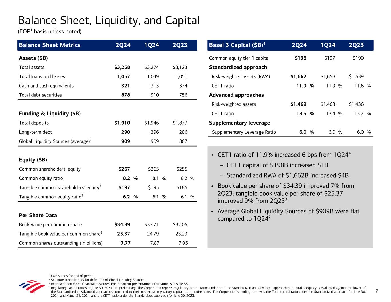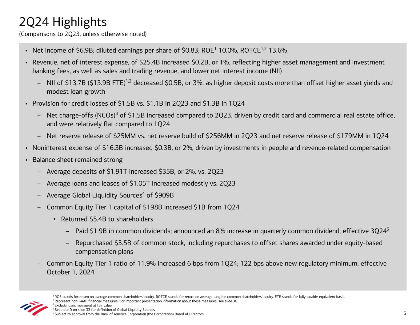 1 ROE stands for return on average common shareholders’ equity. ROTCE stands for return on average tangible common shareholders’ equity. FTE stands for fully taxable-equivalent basis. 2 Represent non-GAAP financial measures. For important presentation information about these measures, see slide 36. 3 Exclude loans measured at fair value. 4 See note D on slide 33 for definition of Global Liquidity Sources. 5 Subject to approval from the Bank of America Corporation (the Corporation) Board of Directors. 2Q24 Highlights (Comparisons to 2Q23, unless otherwise noted) • Net income of $6.9B; diluted earnings per share of $0.83; ROE1 10.0%, ROTCE1,2 13.6% • Revenue, net of interest expense, of $25.4B increased $0.2B, or 1%, reflecting higher asset management and investment banking fees, as well as sales and trading revenue, and lower net interest income (NII) – NII of $13.7B ($13.9B FTE)1,2 decreased $0.5B, or 3%, as higher deposit costs more than offset higher asset yields and modest loan growth • Provision for credit losses of $1.5B vs. $1.1B in 2Q23 and $1.3B in 1Q24 – Net charge-offs (NCOs)3 of $1.5B increased compared to 2Q23, driven by credit card and commercial real estate office, and were relatively flat compared to 1Q24 – Net reserve release of $25MM vs. net reserve build of $256MM in 2Q23 and net reserve release of $179MM in 1Q24 • Noninterest expense of $16.3B increased $0.3B, or 2%, driven by investments in people and revenue-related compensation • Balance sheet remained strong – Average deposits of $1.91T increased $35B, or 2%, vs. 2Q23 – Average loans and leases of $1.05T increased modestly vs. 2Q23 – Average Global Liquidity Sources4 of $909B – Common Equity Tier 1 capital of $198B increased $1B from 1Q24 ▪ Returned $5.4B to shareholders – Paid $1.9B in common dividends; announced an 8% increase in quarterly common dividend, effective 3Q245 – Repurchased $3.5B of common stock, including repurchases to offset shares awarded under equity-based compensation plans – Common Equity Tier 1 ratio of 11.9% increased 6 bps from 1Q24; 122 bps above new regulatory minimum, effective October 1, 2024 6