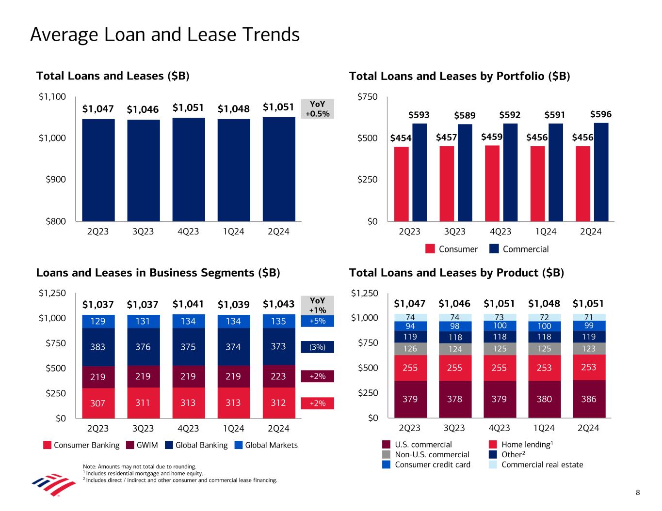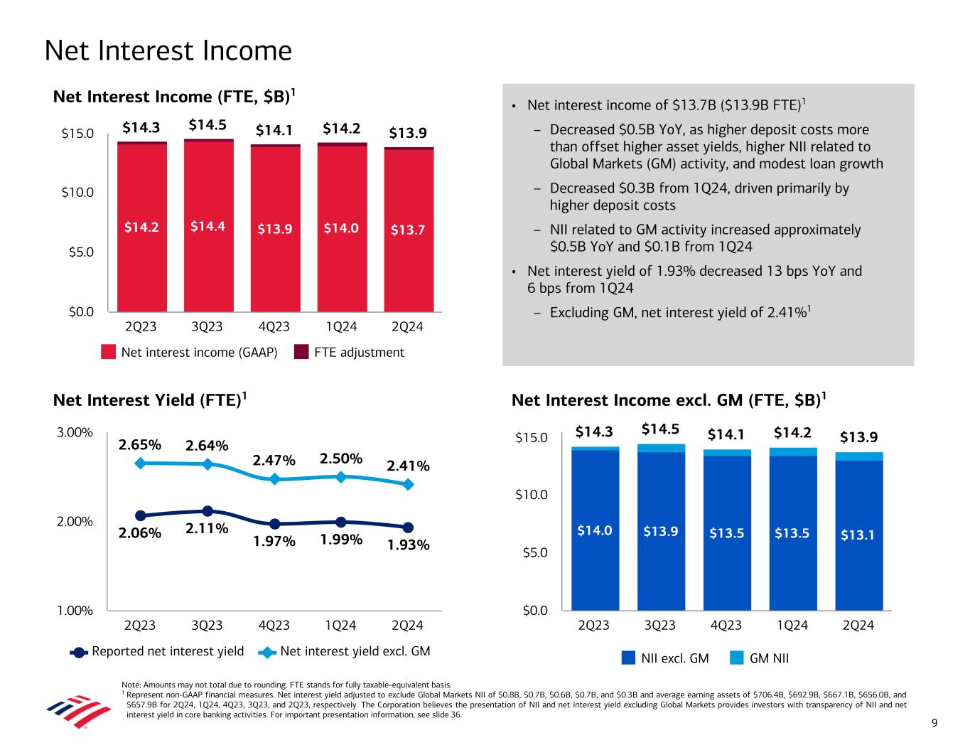$1,037 $1,037 $1,041 $1,039 $1,043 307 311 313 313 312 219 219 219 219 223 383 376 375 374 373 129 131 134 134 135 Consumer Banking GWIM Global Banking Global Markets 2Q23 3Q23 4Q23 1Q24 2Q24 $0 $250 $500 $750 $1,000 $1,250 $1,047 $1,046 $1,051 $1,048 $1,051 2Q23 3Q23 4Q23 1Q24 2Q24 $800 $900 $1,000 $1,100 +2% +2% (3%) +5% Average Loan and Lease Trends YoY +0.5% YoY +1% Note: Amounts may not total due to rounding. 1 Includes residential mortgage and home equity. 2 Includes direct / indirect and other consumer and commercial lease financing. Total Loans and Leases by Product ($B) Loans and Leases in Business Segments ($B) Total Loans and Leases by Portfolio ($B)Total Loans and Leases ($B) $454 $457 $459 $456 $456 $593 $589 $592 $591 $596 Consumer Commercial 2Q23 3Q23 4Q23 1Q24 2Q24 $0 $250 $500 $750 8 $1,047 $1,046 $1,051 $1,048 $1,051 379 378 379 380 386 255 255 255 253 253 126 124 125 125 123 119 118 118 118 119 94 98 100 100 99 74 74 73 72 71 U.S. commercial Home lending Non-U.S. commercial Other Consumer credit card Commercial real estate 2Q23 3Q23 4Q23 1Q24 2Q24 $0 $250 $500 $750 $1,000 $1,250 2 1