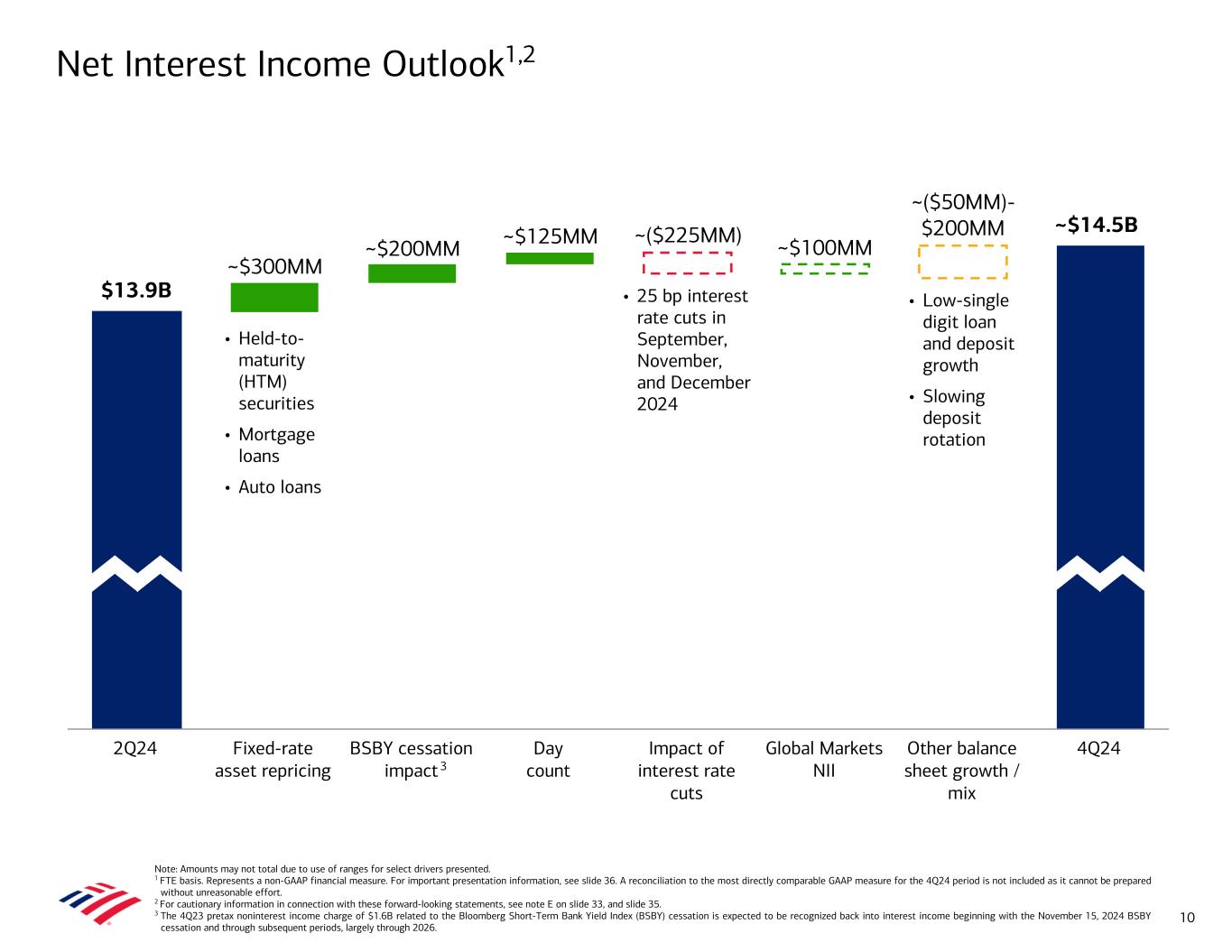 • Net interest income of $13.7B ($13.9B FTE)1 – Decreased $0.5B YoY, as higher deposit costs more than offset higher asset yields, higher NII related to Global Markets (GM) activity, and modest loan growth – Decreased $0.3B from 1Q24, driven primarily by higher deposit costs – NII related to GM activity increased approximately $0.5B YoY and $0.1B from 1Q24 • Net interest yield of 1.93% decreased 13 bps YoY and 6 bps from 1Q24 – Excluding GM, net interest yield of 2.41%1 Net Interest Income (FTE, $B)1 Net Interest Income Net Interest Yield (FTE)1 Note: Amounts may not total due to rounding. FTE stands for fully taxable-equivalent basis. 1 Represent non-GAAP financial measures. Net interest yield adjusted to exclude Global Markets NII of $0.8B, $0.7B, $0.6B, $0.7B, and $0.3B and average earning assets of $706.4B, $692.9B, $667.1B, $656.0B, and $657.9B for 2Q24, 1Q24, 4Q23, 3Q23, and 2Q23, respectively. The Corporation believes the presentation of NII and net interest yield excluding Global Markets provides investors with transparency of NII and net interest yield in core banking activities. For important presentation information, see slide 36. 2.06% 2.11% 1.97% 1.99% 1.93% 2.65% 2.64% 2.47% 2.50% 2.41% Reported net interest yield Net interest yield excl. GM 2Q23 3Q23 4Q23 1Q24 2Q24 1.00% 2.00% 3.00% $14.3 $14.5 $14.1 $14.2 $13.9 $14.2 $14.4 $13.9 $14.0 $13.7 Net interest income (GAAP) FTE adjustment 2Q23 3Q23 4Q23 1Q24 2Q24 $0.0 $5.0 $10.0 $15.0 9 Net Interest Income excl. GM (FTE, $B)1 $14.3 $14.5 $14.1 $14.2 $13.9 $14.0 $13.9 $13.5 $13.5 $13.1 NII excl. GM GM NII 2Q23 3Q23 4Q23 1Q24 2Q24 $0.0 $5.0 $10.0 $15.0