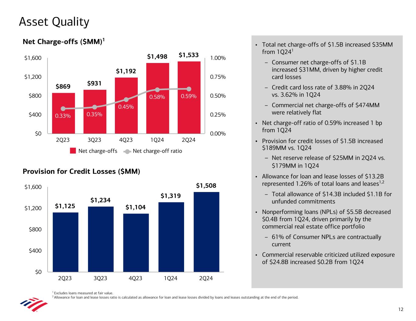 • 1Q24 and 4Q23 noninterest expense of $17.2B and $17.7B included accruals of $0.7B and $2.1B for the estimated amount of the FDIC special assessment for uninsured deposits of certain failed banks • 2Q24 noninterest expense of $16.3B increased $0.3B, or 2%, vs. 2Q23, driven primarily by investments in people and revenue-related compensation, partially offset by lower litigation expense • Noninterest expense declined $0.9B, or 5%, vs. 1Q24, driven by the absence of both the FDIC special assessment accrual and seasonally higher payroll taxes in the first quarter, partially offset by higher revenue-related expenses $16.0 $15.8 $17.7 $17.2 $16.3 9.4 9.6 9.5 10.2 9.8 6.6 6.3 6.1 6.3 6.5 2.1 0.7 Compensation and benefits Other FDIC special assessment 2Q23 3Q23 4Q23 1Q24 2Q24 $0.0 $10.0 $20.0 64% 63% 66% 64% 64% 2Q23 3Q23 4Q23 1Q24 2Q24 55% 60% 65% 70% Total Noninterest Expense ($B) Efficiency Ratio Expense and Efficiency 11 1 $16.51 Note: Amounts may not total due to rounding. 1 Represent non-GAAP financial measures. 1Q24 adjusted noninterest expense of $16.5B is calculated as reported noninterest expense of $17.2B less the FDIC special assessment accrual of $0.7B. 4Q23 adjusted noninterest expense of $15.6B is calculated as reported noninterest expense of $17.7B, less the FDIC special assessment accrual of $2.1B. Adjusted 1Q24 efficiency ratio is calculated as the reported 1Q24 efficiency ratio of 67% less 271 bps for the impact of the FDIC special assessment accrual. Adjusted 4Q23 efficiency ratio is calculated as the reported 4Q23 efficiency ratio of 81% less 1,430 bps for the combined impact of the net pretax charge of $1.6B recorded in noninterest income related to the future cessation of BSBY, as well as the $2.1B pretax noninterest expense for the FDIC special assessment accrual. For more information, see note A on slide 32. For important presentation information about these measures, see slide 36. $15.61 1 0.7