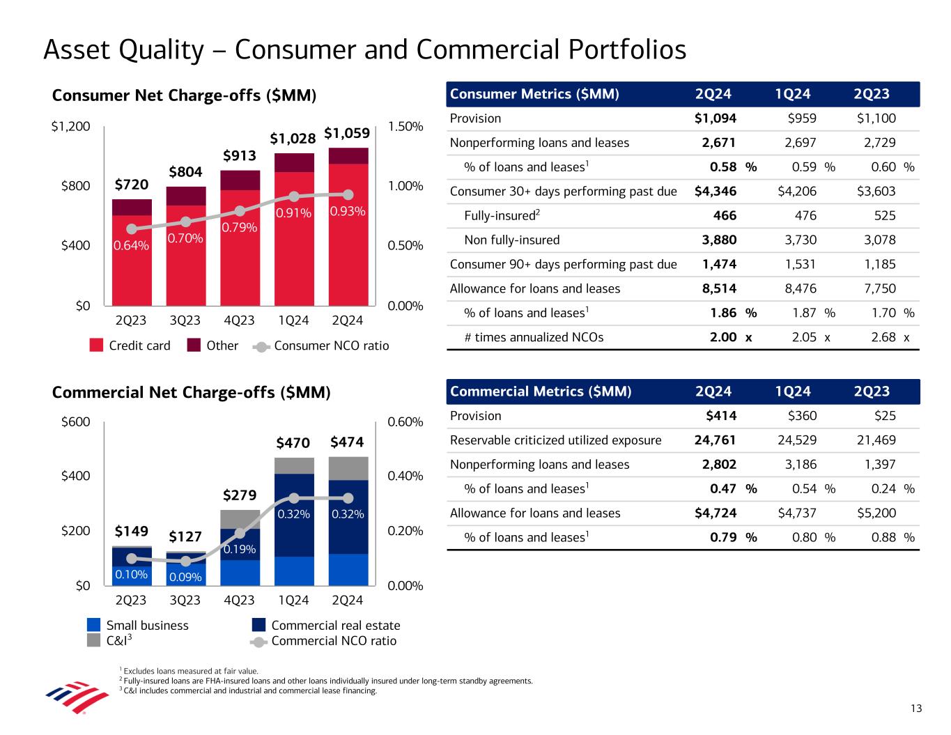 Asset Quality 1 Excludes loans measured at fair value. 2 Allowance for loan and lease losses ratio is calculated as allowance for loan and lease losses divided by loans and leases outstanding at the end of the period. Provision for Credit Losses ($MM) Net Charge-offs ($MM)1 $1,125 $1,234 $1,104 $1,319 $1,508 2Q23 3Q23 4Q23 1Q24 2Q24 $0 $400 $800 $1,200 $1,600 $869 $931 $1,192 $1,498 $1,533 0.33% 0.35% 0.45% 0.58% 0.59% Net charge-offs Net charge-off ratio 2Q23 3Q23 4Q23 1Q24 2Q24 $0 $400 $800 $1,200 $1,600 0.00% 0.25% 0.50% 0.75% 1.00% 12 • Total net charge-offs of $1.5B increased $35MM from 1Q241 – Consumer net charge-offs of $1.1B increased $31MM, driven by higher credit card losses – Credit card loss rate of 3.88% in 2Q24 vs. 3.62% in 1Q24 – Commercial net charge-offs of $474MM were relatively flat • Net charge-off ratio of 0.59% increased 1 bp from 1Q24 • Provision for credit losses of $1.5B increased $189MM vs. 1Q24 – Net reserve release of $25MM in 2Q24 vs. $179MM in 1Q24 • Allowance for loan and lease losses of $13.2B represented 1.26% of total loans and leases1,2 – Total allowance of $14.3B included $1.1B for unfunded commitments • Nonperforming loans (NPLs) of $5.5B decreased $0.4B from 1Q24, driven primarily by the commercial real estate office portfolio – 61% of Consumer NPLs are contractually current • Commercial reservable criticized utilized exposure of $24.8B increased $0.2B from 1Q24