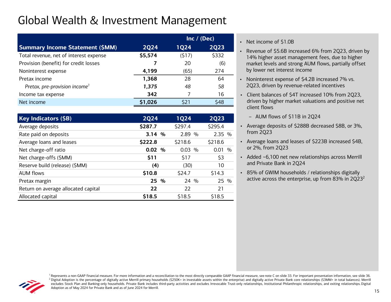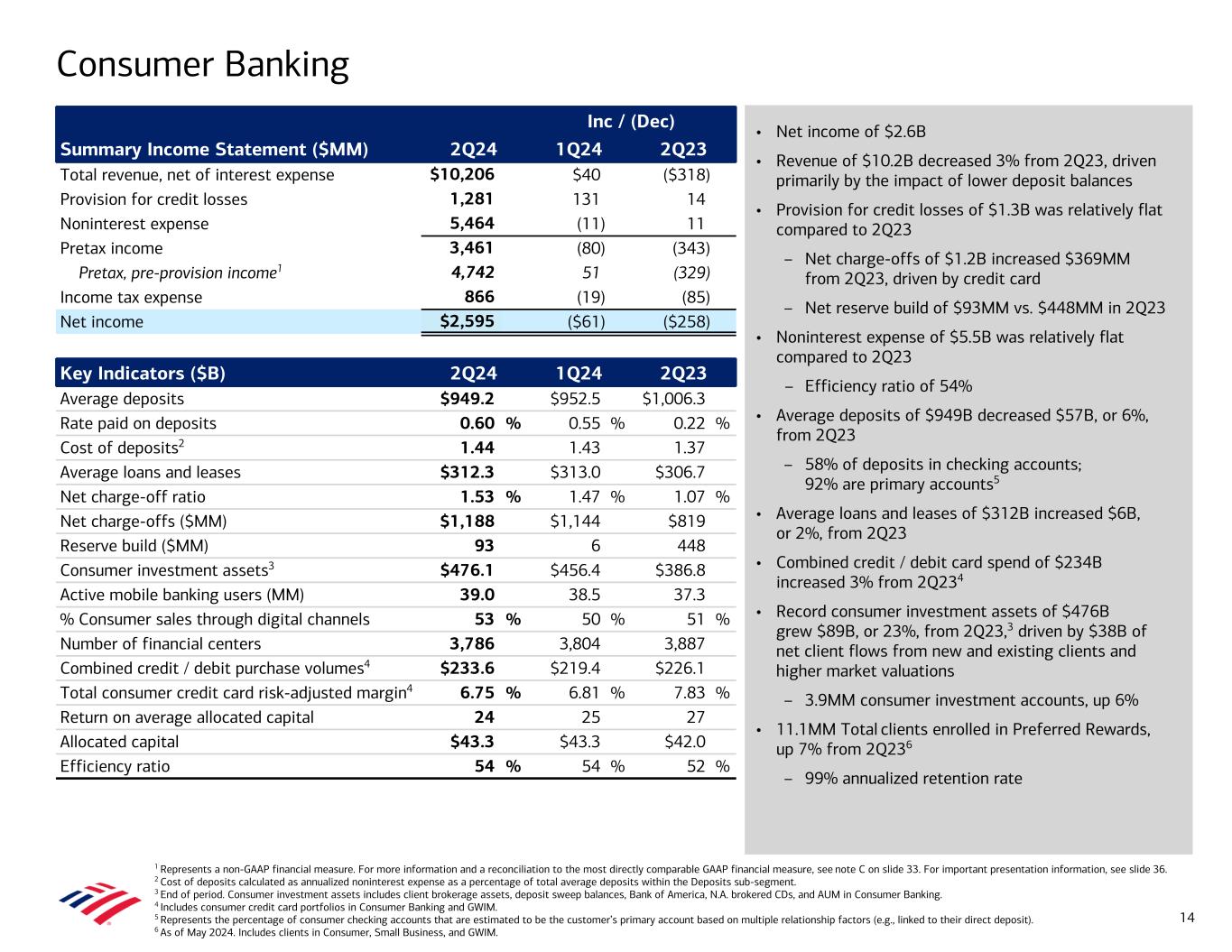 • Net income of $2.6B • Revenue of $10.2B decreased 3% from 2Q23, driven primarily by the impact of lower deposit balances • Provision for credit losses of $1.3B was relatively flat compared to 2Q23 – Net charge-offs of $1.2B increased $369MM from 2Q23, driven by credit card – Net reserve build of $93MM vs. $448MM in 2Q23 • Noninterest expense of $5.5B was relatively flat compared to 2Q23 – Efficiency ratio of 54% • Average deposits of $949B decreased $57B, or 6%, from 2Q23 – 58% of deposits in checking accounts; 92% are primary accounts5 • Average loans and leases of $312B increased $6B, or 2%, from 2Q23 • Combined credit / debit card spend of $234B increased 3% from 2Q234 • Record consumer investment assets of $476B grew $89B, or 23%, from 2Q23,3 driven by $38B of net client flows from new and existing clients and higher market valuations – 3.9MM consumer investment accounts, up 6% • 11.1MM Total clients enrolled in Preferred Rewards, up 7% from 2Q236 – 99% annualized retention rate Consumer Banking 1 Represents a non-GAAP financial measure. For more information and a reconciliation to the most directly comparable GAAP financial measure, see note C on slide 33. For important presentation information, see slide 36. 2 Cost of deposits calculated as annualized noninterest expense as a percentage of total average deposits within the Deposits sub-segment. 3 End of period. Consumer investment assets includes client brokerage assets, deposit sweep balances, Bank of America, N.A. brokered CDs, and AUM in Consumer Banking. 4 Includes consumer credit card portfolios in Consumer Banking and GWIM. 5 Represents the percentage of consumer checking accounts that are estimated to be the customer’s primary account based on multiple relationship factors (e.g., linked to their direct deposit). 6 As of May 2024. Includes clients in Consumer, Small Business, and GWIM. Inc / (Dec) Summary Income Statement ($MM) 2Q24 1Q24 2Q23 Total revenue, net of interest expense $10,206 $40 ($318) Provision for credit losses 1,281 131 14 Noninterest expense 5,464 (11) 11 Pretax income 3,461 (80) (343) Pretax, pre-provision income1 4,742 51 (329) Income tax expense 866 (19) (85) Net income $2,595 ($61) ($258) Key Indicators ($B) 2Q24 1Q24 2Q23 Average deposits $949.2 $952.5 $1,006.3 Rate paid on deposits 0.60 % 0.55 % 0.22 % Cost of deposits2 1.44 1.43 1.37 Average loans and leases $312.3 $313.0 $306.7 Net charge-off ratio 1.53 % 1.47 % 1.07 % Net charge-offs ($MM) $1,188 $1,144 $819 Reserve build ($MM) 93 6 448 Consumer investment assets3 $476.1 $456.4 $386.8 Active mobile banking users (MM) 39.0 38.5 37.3 % Consumer sales through digital channels 53 % 50 % 51 % Number of financial centers 3,786 3,804 3,887 Combined credit / debit purchase volumes4 $233.6 $219.4 $226.1 Total consumer credit card risk-adjusted margin4 6.75 % 6.81 % 7.83 % Return on average allocated capital 24 25 27 Allocated capital $43.3 $43.3 $42.0 Efficiency ratio 54 % 54 % 52 % 14