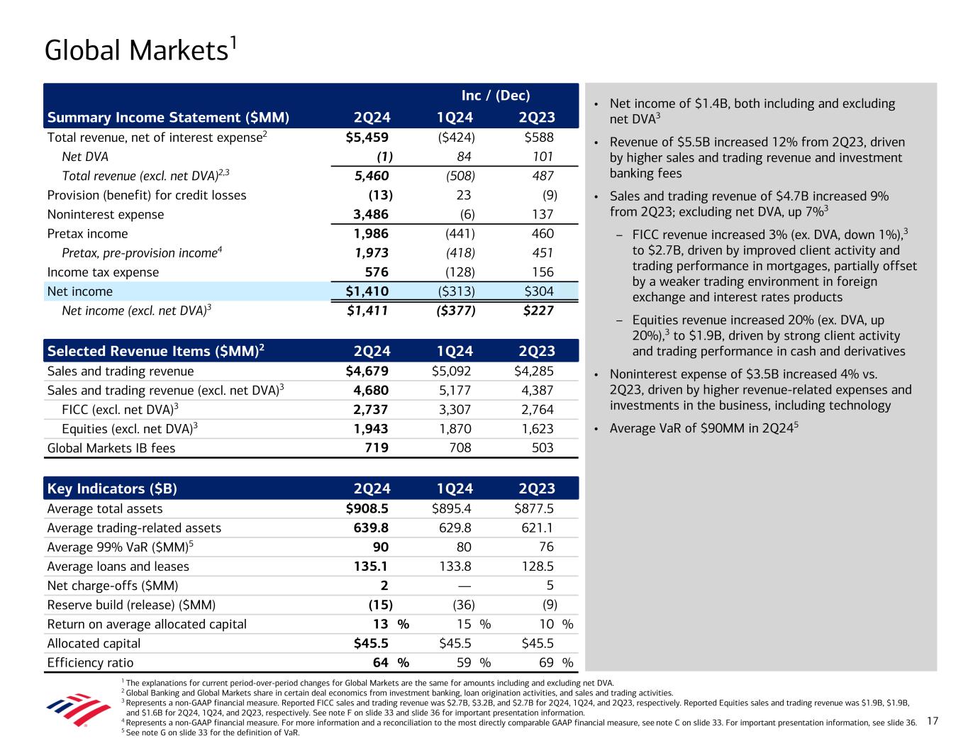• Net income of $2.1B • Revenue of $6.1B decreased 6% from 2Q23, driven primarily by lower net interest income and leasing revenue, partially offset by higher investment banking fees – Total Corporation investment banking fees (ex. self-led) of $1.6B increased 29% vs. 2Q23; #3 investment banking fee ranking3 • Provision for credit losses of $235MM vs. $9MM in 2Q23 – Net charge-offs of $346MM increased $287MM from 2Q23, driven primarily by commercial real estate office – Net reserve release of $111MM vs. $50MM in 2Q23 • Noninterest expense of $2.9B increased 3% vs. 2Q23 • Average deposits of $525B increased $28B, or 6%, from 2Q23 • Average loans and leases of $373B decreased $10B, or 3%, from 2Q23, reflecting lower client demand Global Banking 1 Global Banking and Global Markets share in certain deal economics from investment banking, loan origination activities, and sales and trading activities. 2 Represents a non-GAAP financial measure. For more information and a reconciliation to the most directly comparable GAAP financial measure, see note C on slide 33. For important presentation information, see slide 36. 3 Source: Dealogic as of June 30, 2024. Inc / (Dec) Summary Income Statement ($MM) 2Q24 1Q24 2Q23 Total revenue, net of interest expense1 $6,053 $73 ($409) Provision for credit losses 235 6 226 Noninterest expense 2,899 (113) 80 Pretax income 2,919 180 (715) Pretax, pre-provision income2 3,154 186 (489) Income tax expense 803 50 (178) Net income $2,116 $130 ($537) Selected Revenue Items ($MM) 2Q24 1Q24 2Q23 Total Corporation IB fees (excl. self-led)1 $1,561 $1,568 $1,212 Global Banking IB fees1 835 850 718 Business Lending revenue 2,565 2,404 2,692 Global Transaction Services revenue 2,561 2,666 2,923 Key Indicators ($B) 2Q24 1Q24 2Q23 Average deposits $525.4 $525.7 $497.5 Average loans and leases 372.7 373.6 383.1 Net charge-off ratio 0.38 % 0.38 % 0.06 % Net charge-offs ($MM) $346 $350 $59 Reserve build (release) ($MM) (111) (121) (50) Return on average allocated capital 17 % 16 % 22 % Allocated capital $49.3 $49.3 $49.3 Efficiency ratio 48 % 50 % 44 % 16