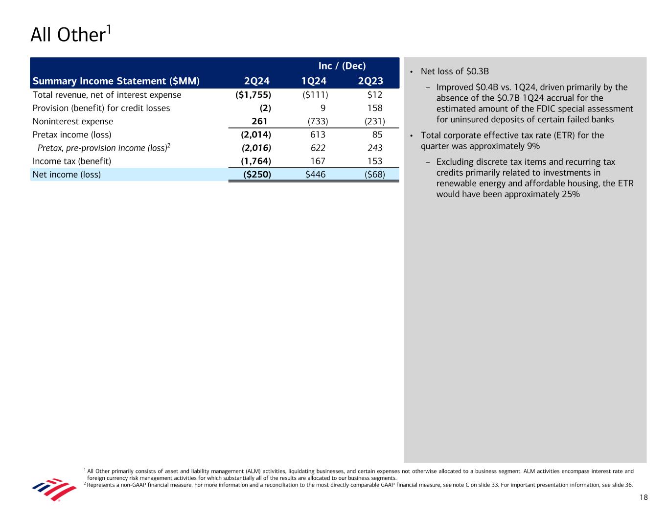 Global Markets1 • Net income of $1.4B, both including and excluding net DVA3 • Revenue of $5.5B increased 12% from 2Q23, driven by higher sales and trading revenue and investment banking fees • Sales and trading revenue of $4.7B increased 9% from 2Q23; excluding net DVA, up 7%3 – FICC revenue increased 3% (ex. DVA, down 1%),3 to $2.7B, driven by improved client activity and trading performance in mortgages, partially offset by a weaker trading environment in foreign exchange and interest rates products – Equities revenue increased 20% (ex. DVA, up 20%),3 to $1.9B, driven by strong client activity and trading performance in cash and derivatives • Noninterest expense of $3.5B increased 4% vs. 2Q23, driven by higher revenue-related expenses and investments in the business, including technology • Average VaR of $90MM in 2Q245 1 The explanations for current period-over-period changes for Global Markets are the same for amounts including and excluding net DVA. 2 Global Banking and Global Markets share in certain deal economics from investment banking, loan origination activities, and sales and trading activities. 3 Represents a non-GAAP financial measure. Reported FICC sales and trading revenue was $2.7B, $3.2B, and $2.7B for 2Q24, 1Q24, and 2Q23, respectively. Reported Equities sales and trading revenue was $1.9B, $1.9B, and $1.6B for 2Q24, 1Q24, and 2Q23, respectively. See note F on slide 33 and slide 36 for important presentation information. 4 Represents a non-GAAP financial measure. For more information and a reconciliation to the most directly comparable GAAP financial measure, see note C on slide 33. For important presentation information, see slide 36. 5 See note G on slide 33 for the definition of VaR. Inc / (Dec) Summary Income Statement ($MM) 2Q24 1Q24 2Q23 Total revenue, net of interest expense2 $5,459 ($424) $588 Net DVA (1) 84 101 Total revenue (excl. net DVA)2,3 5,460 (508) 487 Provision (benefit) for credit losses (13) 23 (9) Noninterest expense 3,486 (6) 137 Pretax income 1,986 (441) 460 Pretax, pre-provision income4 1,973 (418) 451 Income tax expense 576 (128) 156 Net income $1,410 ($313) $304 Net income (excl. net DVA)3 $1,411 ($377) $227 Selected Revenue Items ($MM)2 2Q24 1Q24 2Q23 Sales and trading revenue $4,679 $5,092 $4,285 Sales and trading revenue (excl. net DVA)3 4,680 5,177 4,387 FICC (excl. net DVA)3 2,737 3,307 2,764 Equities (excl. net DVA)3 1,943 1,870 1,623 Global Markets IB fees 719 708 503 Key Indicators ($B) 2Q24 1Q24 2Q23 Average total assets $908.5 $895.4 $877.5 Average trading-related assets 639.8 629.8 621.1 Average 99% VaR ($MM)5 90 80 76 Average loans and leases 135.1 133.8 128.5 Net charge-offs ($MM) 2 — 5 Reserve build (release) ($MM) (15) (36) (9) Return on average allocated capital 13 % 15 % 10 % Allocated capital $45.5 $45.5 $45.5 Efficiency ratio 64 % 59 % 69 % 17