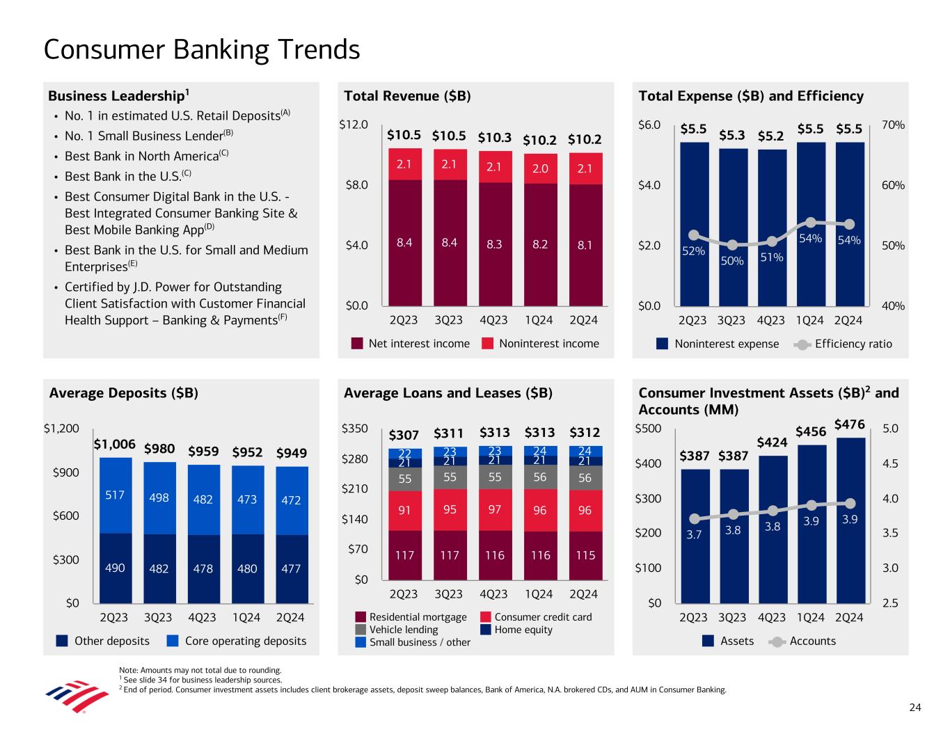 Total Expense ($B) and Efficiency Total Revenue ($B) Average Deposits ($B) Consumer Investment Assets ($B)2 and Accounts (MM) Average Loans and Leases ($B) Consumer Banking Trends Note: Amounts may not total due to rounding. 1 See slide 34 for business leadership sources. 2 End of period. Consumer investment assets includes client brokerage assets, deposit sweep balances, Bank of America, N.A. brokered CDs, and AUM in Consumer Banking. $10.5 $10.5 $10.3 $10.2 $10.2 8.4 8.4 8.3 8.2 8.1 2.1 2.1 2.1 2.0 2.1 Net interest income Noninterest income 2Q23 3Q23 4Q23 1Q24 2Q24 $0.0 $4.0 $8.0 $12.0 $5.5 $5.3 $5.2 $5.5 $5.5 52% 50% 51% 54% 54% Noninterest expense Efficiency ratio 2Q23 3Q23 4Q23 1Q24 2Q24 $0.0 $2.0 $4.0 $6.0 40% 50% 60% 70% $1,006 $980 $959 $952 $949 490 482 478 480 477 517 498 482 473 472 Other deposits Core operating deposits 2Q23 3Q23 4Q23 1Q24 2Q24 $0 $300 $600 $900 $1,200 $307 $311 $313 $313 $312 117 117 116 116 115 91 95 97 96 96 55 55 55 56 56 21 21 21 21 21 22 23 23 24 24 Residential mortgage Consumer credit card Vehicle lending Home equity Small business / other 2Q23 3Q23 4Q23 1Q24 2Q24 $0 $70 $140 $210 $280 $350 24 $387 $387 $424 $456 $476 3.7 3.8 3.8 3.9 3.9 Assets Accounts 2Q23 3Q23 4Q23 1Q24 2Q24 $0 $100 $200 $300 $400 $500 2.5 3.0 3.5 4.0 4.5 5.0 Business Leadership1 • No. 1 in estimated U.S. Retail Deposits(A) • No. 1 Small Business Lender(B) • Best Bank in North America(C) • Best Bank in the U.S.(C) • Best Consumer Digital Bank in the U.S. - Best Integrated Consumer Banking Site & Best Mobile Banking App(D) • Best Bank in the U.S. for Small and Medium Enterprises(E) • Certified by J.D. Power for Outstanding Client Satisfaction with Customer Financial Health Support – Banking & Payments(F)