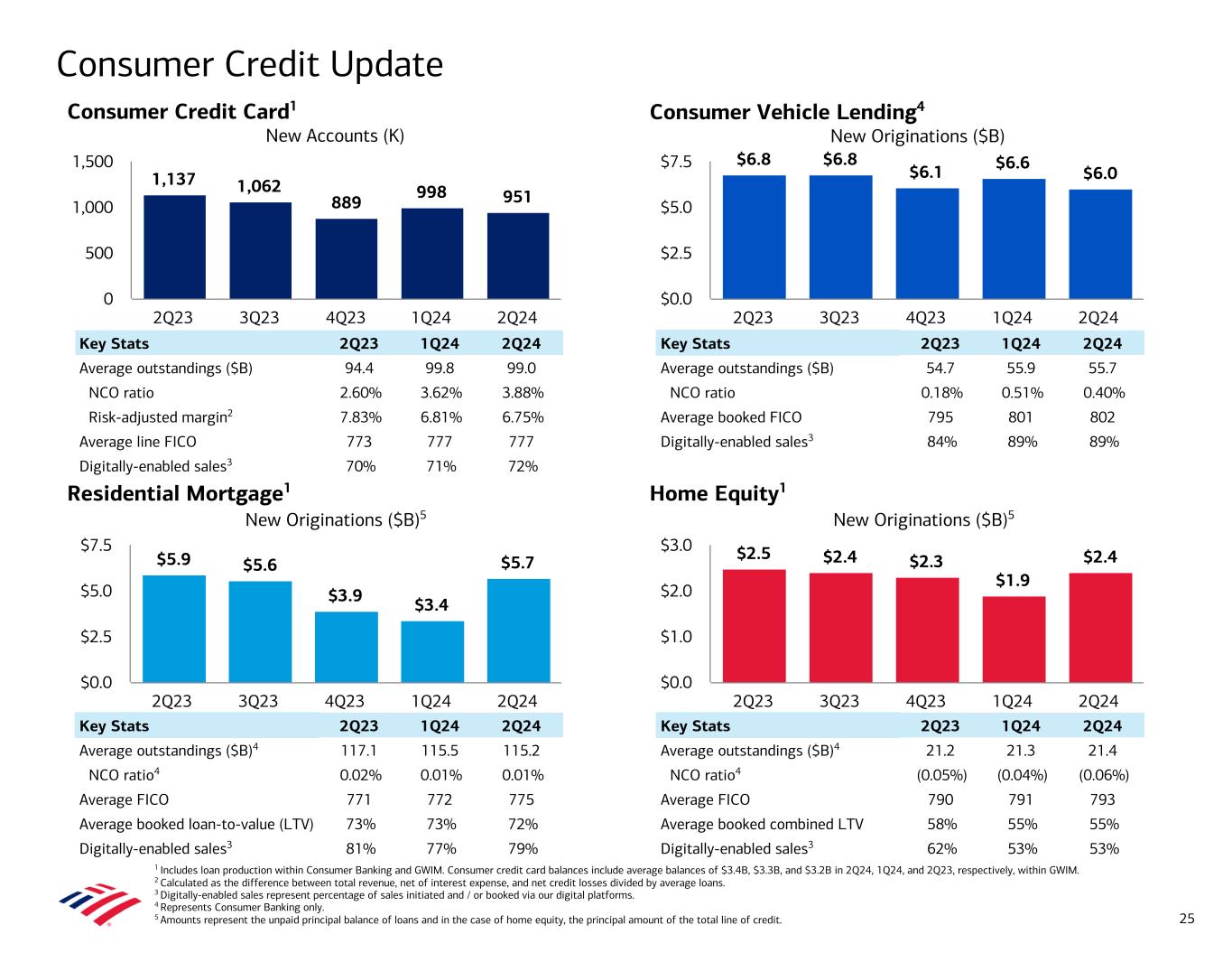 1,137 1,062 889 998 951 2Q23 3Q23 4Q23 1Q24 2Q24 0 500 1,000 1,500 Home Equity1 New Originations ($B)5 Consumer Credit Update 1 Includes loan production within Consumer Banking and GWIM. Consumer credit card balances include average balances of $3.4B, $3.3B, and $3.2B in 2Q24, 1Q24, and 2Q23, respectively, within GWIM. 2 Calculated as the difference between total revenue, net of interest expense, and net credit losses divided by average loans. 3 Digitally-enabled sales represent percentage of sales initiated and / or booked via our digital platforms. 4 Represents Consumer Banking only. 5 Amounts represent the unpaid principal balance of loans and in the case of home equity, the principal amount of the total line of credit. Consumer Vehicle Lending4 New Originations ($B) Consumer Credit Card1 New Accounts (K) 25 Residential Mortgage1 New Originations ($B)5 Key Stats 2Q23 1Q24 2Q24 Average outstandings ($B) 94.4 99.8 99.0 NCO ratio 2.60% 3.62% 3.88% Risk-adjusted margin2 7.83% 6.81% 6.75% Average line FICO 773 777 777 Digitally-enabled sales3 70% 71% 72% $6.8 $6.8 $6.1 $6.6 $6.0 2Q23 3Q23 4Q23 1Q24 2Q24 $0.0 $2.5 $5.0 $7.5 Key Stats 2Q23 1Q24 2Q24 Average outstandings ($B) 54.7 55.9 55.7 NCO ratio 0.18% 0.51% 0.40% Average booked FICO 795 801 802 Digitally-enabled sales3 84% 89% 89% $5.9 $5.6 $3.9 $3.4 $5.7 2Q23 3Q23 4Q23 1Q24 2Q24 $0.0 $2.5 $5.0 $7.5 Key Stats 2Q23 1Q24 2Q24 Average outstandings ($B)4 117.1 115.5 115.2 NCO ratio4 0.02% 0.01% 0.01% Average FICO 771 772 775 Average booked loan-to-value (LTV) 73% 73% 72% Digitally-enabled sales3 81% 77% 79% $2.5 $2.4 $2.3 $1.9 $2.4 2Q23 3Q23 4Q23 1Q24 2Q24 $0.0 $1.0 $2.0 $3.0 Key Stats 2Q23 1Q24 2Q24 Average outstandings ($B)4 21.2 21.3 21.4 NCO ratio4 (0.05%) (0.04%) (0.06%) Average FICO 790 791 793 Average booked combined LTV 58% 55% 55% Digitally-enabled sales3 62% 53% 53%