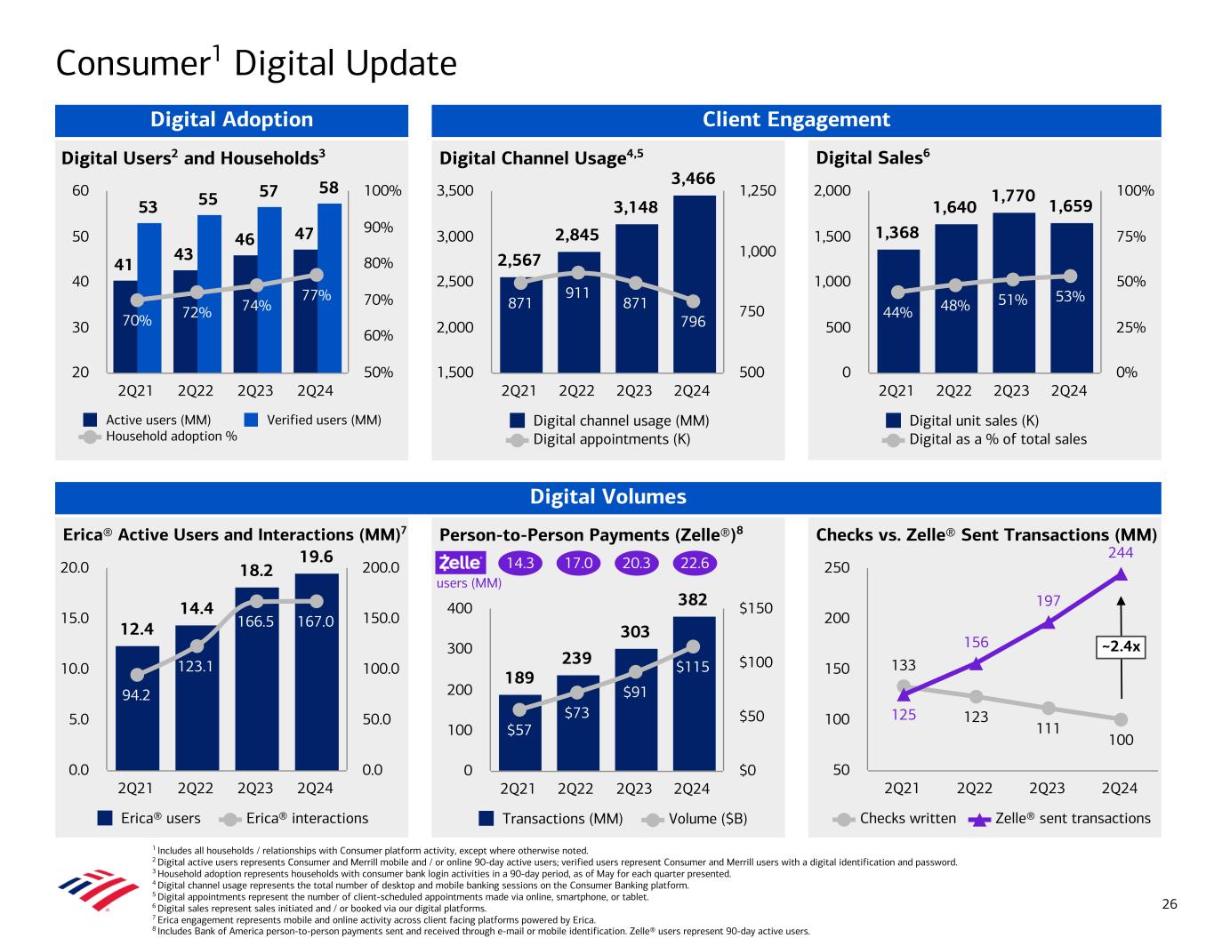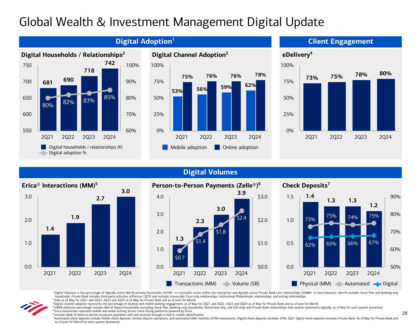 Erica® Interactions (MM)5 1.4 1.9 2.7 3.0 2Q21 2Q22 2Q23 2Q24 0.0 1.0 2.0 3.0 Person-to-Person Payments (Zelle®)6 Check Deposits7 eDelivery4Digital Households / Relationships2 Digital Channel Adoption3 73% 75% 78% 80% 2Q21 2Q22 2Q23 2Q24 0% 25% 50% 75% 100% 53% 56% 59% 62% 75% 76% 76% 78% Mobile adoption Online adoption 2Q21 2Q22 2Q23 2Q24 0% 25% 50% 75% 100% 681 690 718 742 80% 82% 83% 85% Digital households / relationships (K) Digital adoption % 2Q21 2Q22 2Q23 2Q24 550 600 650 700 750 60% 70% 80% 90% 100% Client Engagement Digital Volumes Global Wealth & Investment Management Digital Update 1 Digital Adoption is the percentage of digitally active Merrill primary households ($250K+ in investable assets within the enterprise) and digitally active Private Bank core relationships ($3MM+ in total balances). Merrill excludes Stock Plan and Banking-only households. Private Bank includes third-party activities (effective 1Q23) and excludes Irrevocable Trust-only relationships, Institutional Philanthropic relationships, and exiting relationships. 2 Data as of May for 2Q21 and 2Q22. 2Q23 and 2Q24 as of May for Private Bank and as of June for Merrill. 3 Digital channel adoption represents the percentage of desktop and mobile banking engagement, as of May for 2Q21 and 2Q22. 2Q23 and 2Q24 as of May for Private Bank and as of June for Merrill. 4 GWIM eDelivery percentage includes Merrill Digital Households (excluding Stock Plan, Banking-only households, Retirement only, and 529 only) and Private Bank relationships that receive statements digitally, as of May for each quarter presented. 5 Erica interactions represent mobile and online activity across client-facing platforms powered by Erica. 6 Includes Bank of America person-to-person payments sent and received through e-mail or mobile identification. 7 Automated check deposits include mobile check deposits, remote deposit operations, and automated teller machine (ATM) transactions. Digital check deposits excludes ATM. 2Q21 digital check deposits excludes Private Bank. As of May for Private Bank and as of June for Merrill for each quarter presented. 28 Digital Adoption1 1.4 1.3 1.3 1.2 73% 75% 74% 75% 62% 65% 66% 67% Physical (MM) Automated Digital 2Q21 2Q22 2Q23 2Q24 0.0 0.5 1.0 1.5 50% 60% 70% 80% 90% 1.3 2.3 3.0 3.9 $0.7 $1.4 $1.8 $2.4 Transactions (MM) Volume ($B) 2Q21 2Q22 2Q23 2Q24 0.0 1.0 2.0 3.0 4.0 $0.0 $1.0 $2.0 $3.0