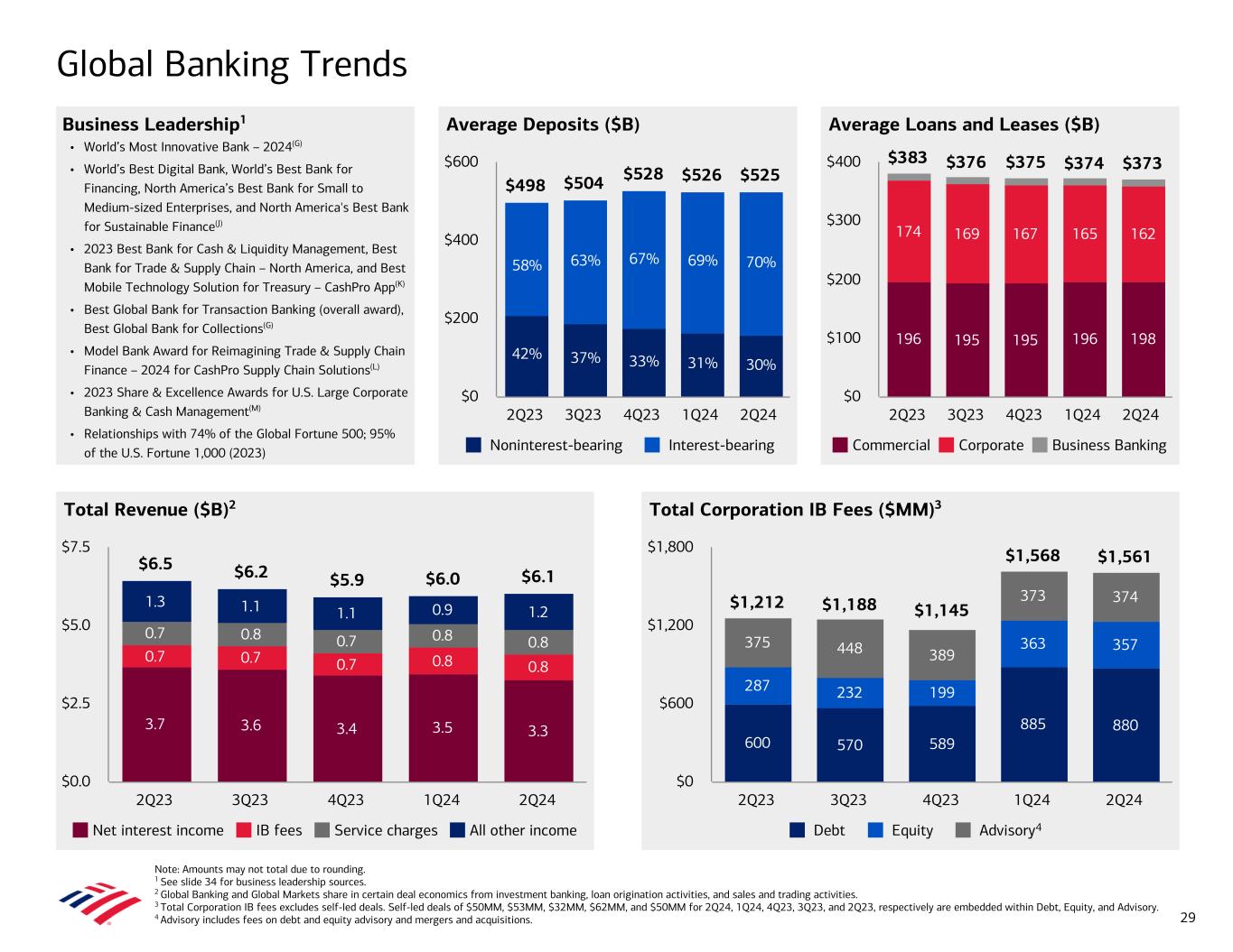 Global Banking Trends Note: Amounts may not total due to rounding. 1 See slide 34 for business leadership sources. 2 Global Banking and Global Markets share in certain deal economics from investment banking, loan origination activities, and sales and trading activities. 3 Total Corporation IB fees excludes self-led deals. Self-led deals of $50MM, $53MM, $32MM, $62MM, and $50MM for 2Q24, 1Q24, 4Q23, 3Q23, and 2Q23, respectively are embedded within Debt, Equity, and Advisory. 4 Advisory includes fees on debt and equity advisory and mergers and acquisitions. Average Deposits ($B)Business Leadership1 • World’s Most Innovative Bank – 2024(G) • World’s Best Digital Bank, World’s Best Bank for Financing, North America’s Best Bank for Small to Medium-sized Enterprises, and North America's Best Bank for Sustainable Finance(J) • 2023 Best Bank for Cash & Liquidity Management, Best Bank for Trade & Supply Chain – North America, and Best Mobile Technology Solution for Treasury – CashPro App(K) • Best Global Bank for Transaction Banking (overall award), Best Global Bank for Collections(G) • Model Bank Award for Reimagining Trade & Supply Chain Finance – 2024 for CashPro Supply Chain Solutions(L) • 2023 Share & Excellence Awards for U.S. Large Corporate Banking & Cash Management(M) • Relationships with 74% of the Global Fortune 500; 95% of the U.S. Fortune 1,000 (2023) Average Loans and Leases ($B) Total Revenue ($B)2 Total Corporation IB Fees ($MM)3 $6.5 $6.2 $5.9 $6.0 $6.1 3.7 3.6 3.4 3.5 3.3 0.7 0.7 0.7 0.8 0.8 0.7 0.8 0.7 0.8 0.8 1.3 1.1 1.1 0.9 1.2 Net interest income IB fees Service charges All other income 2Q23 3Q23 4Q23 1Q24 2Q24 $0.0 $2.5 $5.0 $7.5 600 570 589 885 880 287 232 199 363 357375 448 389 373 374$1,212 $1,188 $1,145 $1,568 $1,561 Debt Equity Advisory 2Q23 3Q23 4Q23 1Q24 2Q24 $0 $600 $1,200 $1,800 196 195 195 196 198 174 169 167 165 162 $383 $376 $375 $374 $373 Commercial Corporate Business Banking 2Q23 3Q23 4Q23 1Q24 2Q24 $0 $100 $200 $300 $400 4 $498 $504 $528 $526 $525 Noninterest-bearing Interest-bearing 2Q23 3Q23 4Q23 1Q24 2Q24 $0 $200 $400 $600 29 42% 37% 33% 31% 30% 58% 63% 67% 69% 70%