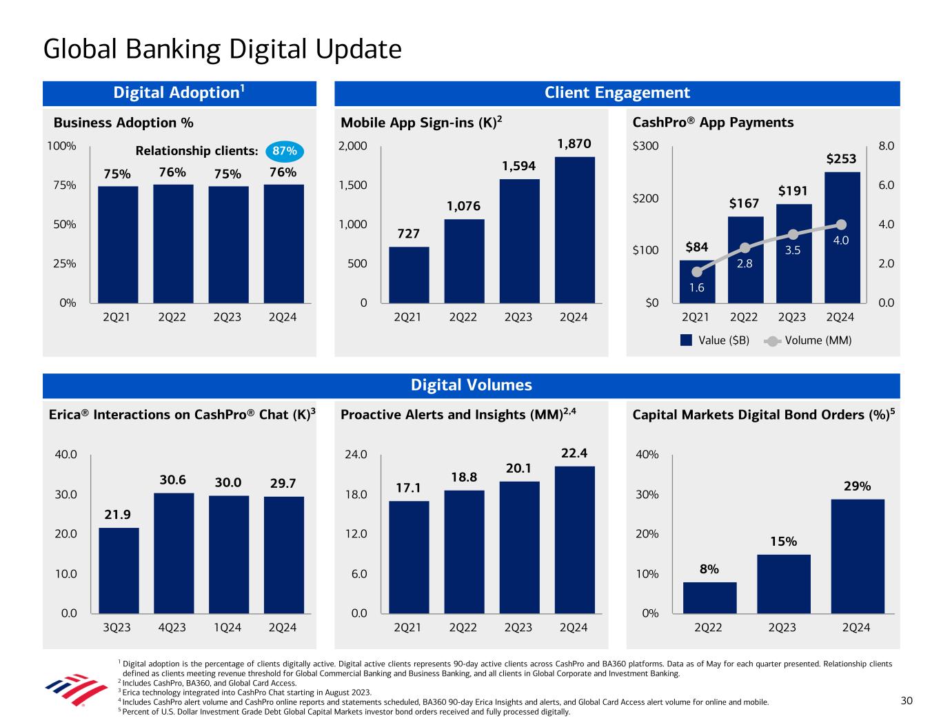 1 Digital adoption is the percentage of clients digitally active. Digital active clients represents 90-day active clients across CashPro and BA360 platforms. Data as of May for each quarter presented. Relationship clients defined as clients meeting revenue threshold for Global Commercial Banking and Business Banking, and all clients in Global Corporate and Investment Banking. 2 Includes CashPro, BA360, and Global Card Access. 3 Erica technology integrated into CashPro Chat starting in August 2023. 4 Includes CashPro alert volume and CashPro online reports and statements scheduled, BA360 90-day Erica Insights and alerts, and Global Card Access alert volume for online and mobile. 5 Percent of U.S. Dollar Investment Grade Debt Global Capital Markets investor bond orders received and fully processed digitally. Capital Markets Digital Bond Orders (%)5 Erica® Interactions on CashPro® Chat (K)3 Proactive Alerts and Insights (MM)2,4 8% 15% 29% 2Q22 2Q23 2Q24 0% 10% 20% 30% 40% 17.1 18.8 20.1 22.4 2Q21 2Q22 2Q23 2Q24 0.0 6.0 12.0 18.0 24.0 21.9 30.6 30.0 29.7 3Q23 4Q23 1Q24 2Q24 0.0 10.0 20.0 30.0 40.0 CashPro® App PaymentsBusiness Adoption % Mobile App Sign-ins (K)2 $84 $167 $191 $253 1.6 2.8 3.5 4.0 Value ($B) Volume (MM) 2Q21 2Q22 2Q23 2Q24 $0 $100 $200 $300 0.0 2.0 4.0 6.0 8.0 727 1,076 1,594 1,870 2Q21 2Q22 2Q23 2Q24 0 500 1,000 1,500 2,000 75% 76% 75% 76% 2Q21 2Q22 2Q23 2Q24 0% 25% 50% 75% 100% Client Engagement Digital Volumes Global Banking Digital Update 30 Digital Adoption1 87%Relationship clients: