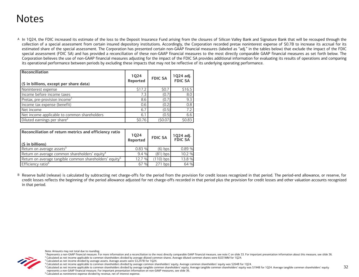 Note: Amounts may not total due to rounding. 1 Represents a non-GAAP financial measure. For more information and a reconciliation to the most directly comparable GAAP financial measure, see note C on slide 33. For important presentation information about this measure, see slide 36. 2 Calculated as net income applicable to common shareholders divided by average diluted common shares. Average diluted common shares were 8,031MM for 1Q24. 3 Calculated as net income divided by average assets. Average assets were $3,247B for 1Q24. 4 Calculated as net income applicable to common shareholders divided by average common shareholders’ equity. Average common shareholders’ equity was $264B for 1Q24. 5 Calculated as net income applicable to common shareholders divided by average tangible common shareholders’ equity. Average tangible common shareholders’ equity was $194B for 1Q24. Average tangible common shareholders’ equity represents a non-GAAP financial measure. For important presentation information on non-GAAP measures, see slide 36. 6 Calculated as noninterest expense divided by revenue, net of interest expense. A In 1Q24, the FDIC increased its estimate of the loss to the Deposit Insurance Fund arising from the closures of Silicon Valley Bank and Signature Bank that will be recouped through the collection of a special assessment from certain insured depository institutions. Accordingly, the Corporation recorded pretax noninterest expense of $0.7B to increase its accrual for its estimated share of the special assessment. The Corporation has presented certain non-GAAP financial measures (labeled as “adj.” in the tables below) that exclude the impact of the FDIC special assessment (FDIC SA) and has provided a reconciliation of these non-GAAP financial measures to the most directly comparable GAAP financial measures as set forth below. The Corporation believes the use of non-GAAP financial measures adjusting for the impact of the FDIC SA provides additional information for evaluating its results of operations and comparing its operational performance between periods by excluding these impacts that may not be reflective of its underlying operating performance. B Reserve build (release) is calculated by subtracting net charge-offs for the period from the provision for credit losses recognized in that period. The period-end allowance, or reserve, for credit losses reflects the beginning of the period allowance adjusted for net charge-offs recorded in that period plus the provision for credit losses and other valuation accounts recognized in that period. Notes 32 Reconciliation of return metrics and efficiency ratio ($ in billions) 1Q24 Reported FDIC SA 1Q24 adj. FDIC SA Return on average assets3 0.83 % (6) bps 0.89 % Return on average common shareholders’ equity4 9.4 % (81) bps 10.2 % Return on average tangible common shareholders’ equity5 12.7 % (110) bps 13.8 % Efficiency ratio6 67 % 271 bps 64 % Reconciliation 1Q24 Reported FDIC SA 1Q24 adj. FDIC SA ($ in billions, except per share data) Noninterest expense $17.2 $0.7 $16.5 Income before income taxes 7.3 (0.7) 8.0 Pretax, pre-provision income1 8.6 (0.7) 9.3 Income tax expense (benefit) 0.6 (0.2) 0.8 Net income 6.7 (0.5) 7.2 Net income applicable to common shareholders 6.1 (0.5) 6.6 Diluted earnings per share2 $0.76 ($0.07) $0.83