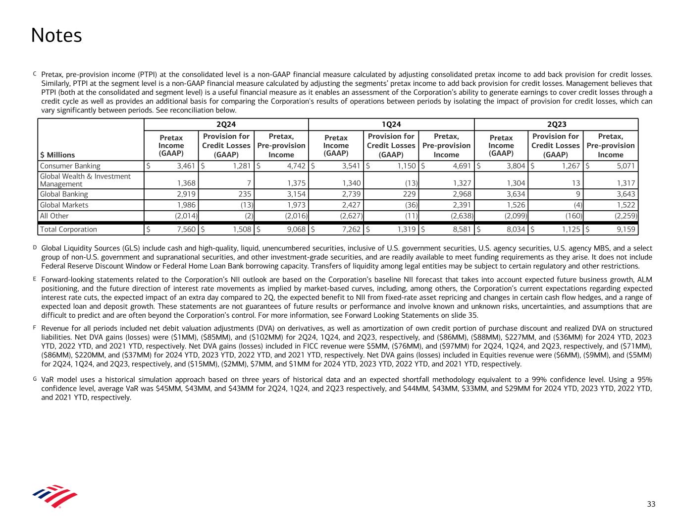 C Pretax, pre-provision income (PTPI) at the consolidated level is a non-GAAP financial measure calculated by adjusting consolidated pretax income to add back provision for credit losses. Similarly, PTPI at the segment level is a non-GAAP financial measure calculated by adjusting the segments’ pretax income to add back provision for credit losses. Management believes that PTPI (both at the consolidated and segment level) is a useful financial measure as it enables an assessment of the Corporation’s ability to generate earnings to cover credit losses through a credit cycle as well as provides an additional basis for comparing the Corporation's results of operations between periods by isolating the impact of provision for credit losses, which can vary significantly between periods. See reconciliation below. D Global Liquidity Sources (GLS) include cash and high-quality, liquid, unencumbered securities, inclusive of U.S. government securities, U.S. agency securities, U.S. agency MBS, and a select group of non-U.S. government and supranational securities, and other investment-grade securities, and are readily available to meet funding requirements as they arise. It does not include Federal Reserve Discount Window or Federal Home Loan Bank borrowing capacity. Transfers of liquidity among legal entities may be subject to certain regulatory and other restrictions. E Forward-looking statements related to the Corporation’s NII outlook are based on the Corporation’s baseline NII forecast that takes into account expected future business growth, ALM positioning, and the future direction of interest rate movements as implied by market-based curves, including, among others, the Corporation’s current expectations regarding expected interest rate cuts, the expected impact of an extra day compared to 2Q, the expected benefit to NII from fixed-rate asset repricing and changes in certain cash flow hedges, and a range of expected loan and deposit growth. These statements are not guarantees of future results or performance and involve known and unknown risks, uncertainties, and assumptions that are difficult to predict and are often beyond the Corporation’s control. For more information, see Forward Looking Statements on slide 35. F Revenue for all periods included net debit valuation adjustments (DVA) on derivatives, as well as amortization of own credit portion of purchase discount and realized DVA on structured liabilities. Net DVA gains (losses) were ($1MM), ($85MM), and ($102MM) for 2Q24, 1Q24, and 2Q23, respectively, and ($86MM), ($88MM), $227MM, and ($36MM) for 2024 YTD, 2023 YTD, 2022 YTD, and 2021 YTD, respectively. Net DVA gains (losses) included in FICC revenue were $5MM, ($76MM), and ($97MM) for 2Q24, 1Q24, and 2Q23, respectively, and ($71MM), ($86MM), $220MM, and ($37MM) for 2024 YTD, 2023 YTD, 2022 YTD, and 2021 YTD, respectively. Net DVA gains (losses) included in Equities revenue were ($6MM), ($9MM), and ($5MM) for 2Q24, 1Q24, and 2Q23, respectively, and ($15MM), ($2MM), $7MM, and $1MM for 2024 YTD, 2023 YTD, 2022 YTD, and 2021 YTD, respectively. G VaR model uses a historical simulation approach based on three years of historical data and an expected shortfall methodology equivalent to a 99% confidence level. Using a 95% confidence level, average VaR was $45MM, $43MM, and $43MM for 2Q24, 1Q24, and 2Q23 respectively, and $44MM, $43MM, $33MM, and $29MM for 2024 YTD, 2023 YTD, 2022 YTD, and 2021 YTD, respectively. Notes $ Millions 2Q24 1Q24 2Q23 Pretax Income (GAAP) Provision for Credit Losses (GAAP) Pretax, Pre-provision Income Pretax Income (GAAP) Provision for Credit Losses (GAAP) Pretax, Pre-provision Income Pretax Income (GAAP) Provision for Credit Losses (GAAP) Pretax, Pre-provision Income Consumer Banking $ 3,461 $ 1,281 $ 4,742 $ 3,541 $ 1,150 $ 4,691 $ 3,804 $ 1,267 $ 5,071 Global Wealth & Investment Management 1,368 7 1,375 1,340 (13) 1,327 1,304 13 1,317 Global Banking 2,919 235 3,154 2,739 229 2,968 3,634 9 3,643 Global Markets 1,986 (13) 1,973 2,427 (36) 2,391 1,526 (4) 1,522 All Other (2,014) (2) (2,016) (2,627) (11) (2,638) (2,099) (160) (2,259) Total Corporation $ 7,560 $ 1,508 $ 9,068 $ 7,262 $ 1,319 $ 8,581 $ 8,034 $ 1,125 $ 9,159 33