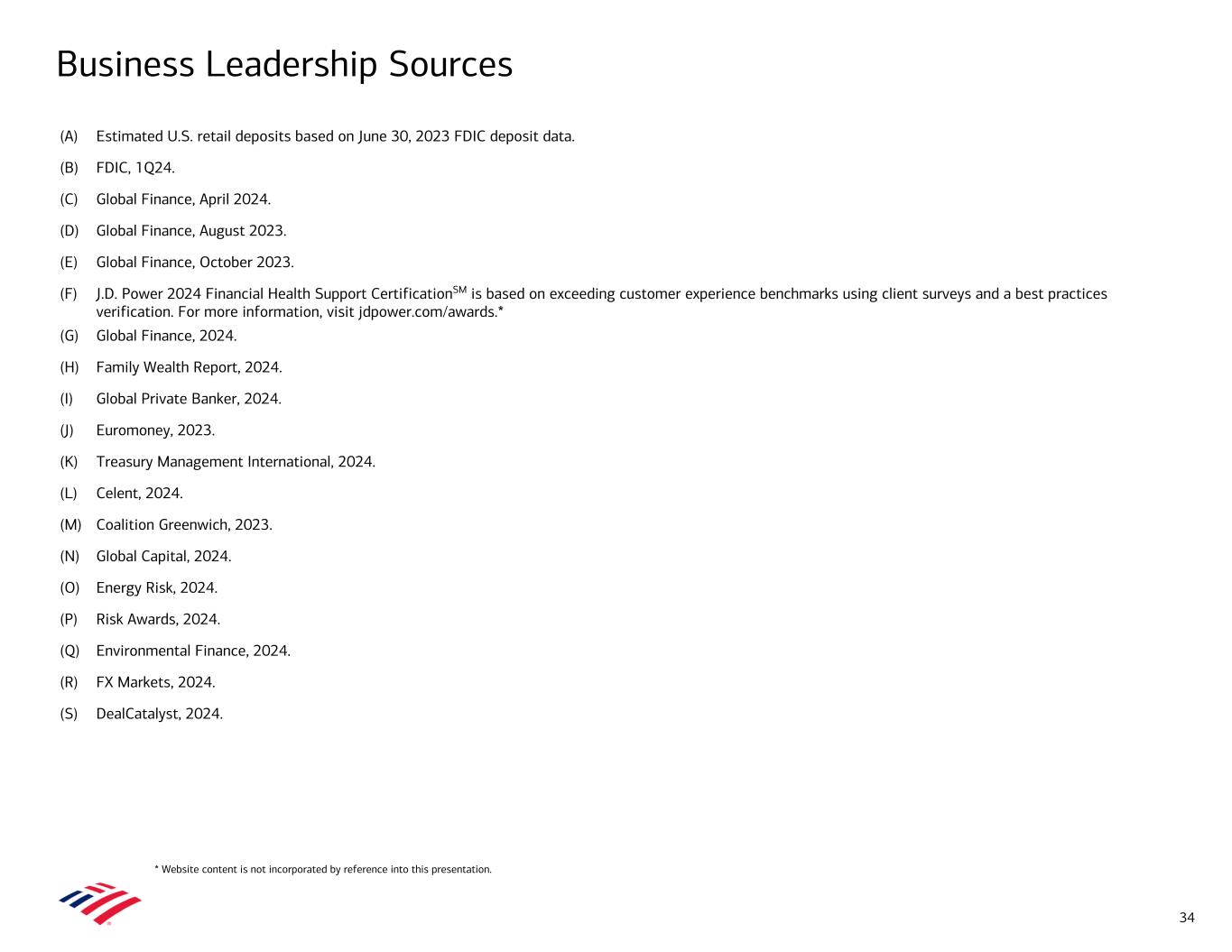 Business Leadership Sources (A) Estimated U.S. retail deposits based on June 30, 2023 FDIC deposit data. (B) FDIC, 1Q24. (C) Global Finance, April 2024. (D) Global Finance, August 2023. (E) Global Finance, October 2023. (F) J.D. Power 2024 Financial Health Support CertificationSM is based on exceeding customer experience benchmarks using client surveys and a best practices verification. For more information, visit jdpower.com/awards.* (G) Global Finance, 2024. (H) Family Wealth Report, 2024. (I) Global Private Banker, 2024. (J) Euromoney, 2023. (K) Treasury Management International, 2024. (L) Celent, 2024. (M) Coalition Greenwich, 2023. (N) Global Capital, 2024. (O) Energy Risk, 2024. (P) Risk Awards, 2024. (Q) Environmental Finance, 2024. (R) FX Markets, 2024. (S) DealCatalyst, 2024. 34 * Website content is not incorporated by reference into this presentation.