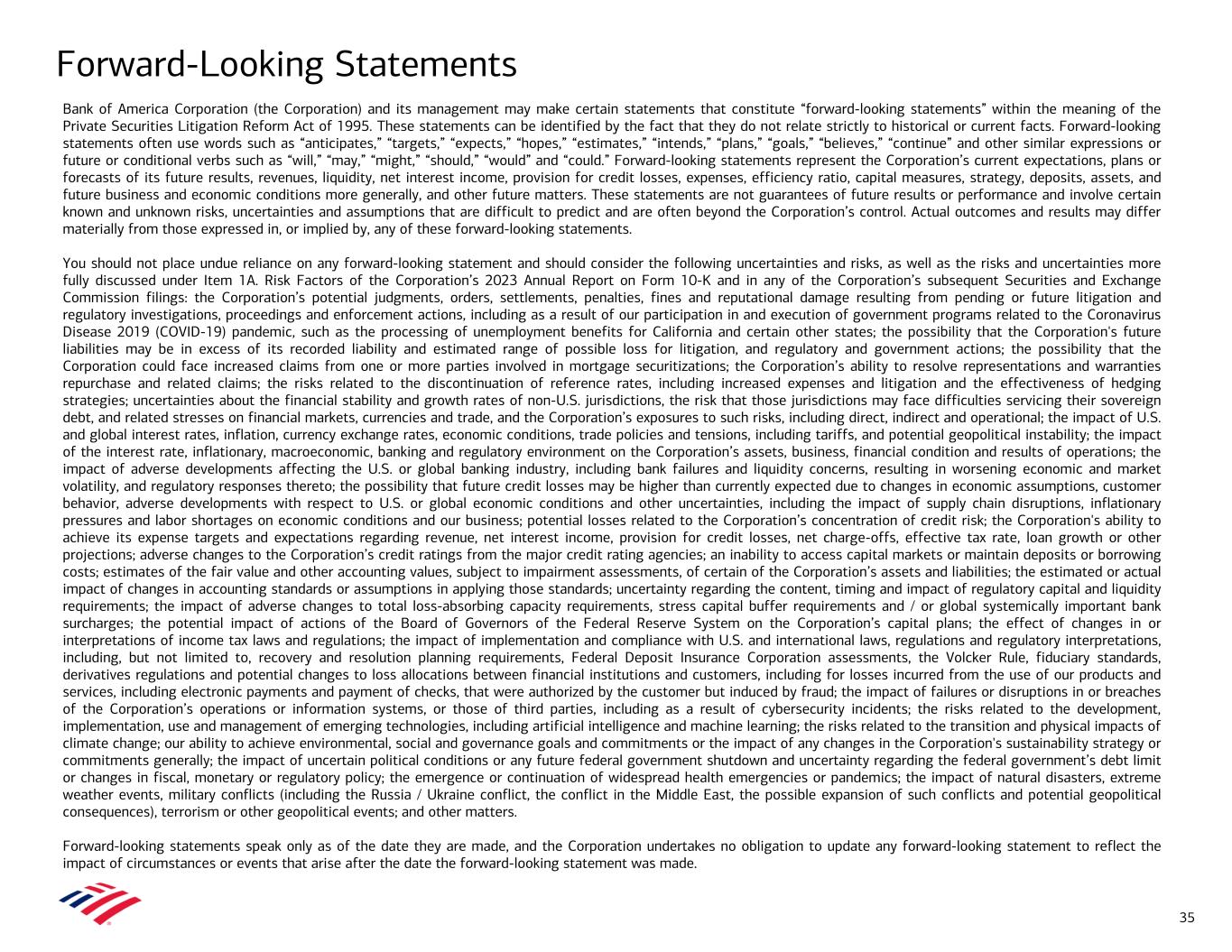 Forward-Looking Statements Bank of America Corporation (the Corporation) and its management may make certain statements that constitute “forward-looking statements” within the meaning of the Private Securities Litigation Reform Act of 1995. These statements can be identified by the fact that they do not relate strictly to historical or current facts. Forward-looking statements often use words such as “anticipates,” “targets,” “expects,” “hopes,” “estimates,” “intends,” “plans,” “goals,” “believes,” “continue” and other similar expressions or future or conditional verbs such as “will,” “may,” “might,” “should,” “would” and “could.” Forward-looking statements represent the Corporation’s current expectations, plans or forecasts of its future results, revenues, liquidity, net interest income, provision for credit losses, expenses, efficiency ratio, capital measures, strategy, deposits, assets, and future business and economic conditions more generally, and other future matters. These statements are not guarantees of future results or performance and involve certain known and unknown risks, uncertainties and assumptions that are difficult to predict and are often beyond the Corporation’s control. Actual outcomes and results may differ materially from those expressed in, or implied by, any of these forward-looking statements. You should not place undue reliance on any forward-looking statement and should consider the following uncertainties and risks, as well as the risks and uncertainties more fully discussed under Item 1A. Risk Factors of the Corporation’s 2023 Annual Report on Form 10-K and in any of the Corporation’s subsequent Securities and Exchange Commission filings: the Corporation’s potential judgments, orders, settlements, penalties, fines and reputational damage resulting from pending or future litigation and regulatory investigations, proceedings and enforcement actions, including as a result of our participation in and execution of government programs related to the Coronavirus Disease 2019 (COVID-19) pandemic, such as the processing of unemployment benefits for California and certain other states; the possibility that the Corporation's future liabilities may be in excess of its recorded liability and estimated range of possible loss for litigation, and regulatory and government actions; the possibility that the Corporation could face increased claims from one or more parties involved in mortgage securitizations; the Corporation’s ability to resolve representations and warranties repurchase and related claims; the risks related to the discontinuation of reference rates, including increased expenses and litigation and the effectiveness of hedging strategies; uncertainties about the financial stability and growth rates of non-U.S. jurisdictions, the risk that those jurisdictions may face difficulties servicing their sovereign debt, and related stresses on financial markets, currencies and trade, and the Corporation’s exposures to such risks, including direct, indirect and operational; the impact of U.S. and global interest rates, inflation, currency exchange rates, economic conditions, trade policies and tensions, including tariffs, and potential geopolitical instability; the impact of the interest rate, inflationary, macroeconomic, banking and regulatory environment on the Corporation’s assets, business, financial condition and results of operations; the impact of adverse developments affecting the U.S. or global banking industry, including bank failures and liquidity concerns, resulting in worsening economic and market volatility, and regulatory responses thereto; the possibility that future credit losses may be higher than currently expected due to changes in economic assumptions, customer behavior, adverse developments with respect to U.S. or global economic conditions and other uncertainties, including the impact of supply chain disruptions, inflationary pressures and labor shortages on economic conditions and our business; potential losses related to the Corporation’s concentration of credit risk; the Corporation's ability to achieve its expense targets and expectations regarding revenue, net interest income, provision for credit losses, net charge-offs, effective tax rate, loan growth or other projections; adverse changes to the Corporation’s credit ratings from the major credit rating agencies; an inability to access capital markets or maintain deposits or borrowing costs; estimates of the fair value and other accounting values, subject to impairment assessments, of certain of the Corporation’s assets and liabilities; the estimated or actual impact of changes in accounting standards or assumptions in applying those standards; uncertainty regarding the content, timing and impact of regulatory capital and liquidity requirements; the impact of adverse changes to total loss-absorbing capacity requirements, stress capital buffer requirements and / or global systemically important bank surcharges; the potential impact of actions of the Board of Governors of the Federal Reserve System on the Corporation’s capital plans; the effect of changes in or interpretations of income tax laws and regulations; the impact of implementation and compliance with U.S. and international laws, regulations and regulatory interpretations, including, but not limited to, recovery and resolution planning requirements, Federal Deposit Insurance Corporation assessments, the Volcker Rule, fiduciary standards, derivatives regulations and potential changes to loss allocations between financial institutions and customers, including for losses incurred from the use of our products and services, including electronic payments and payment of checks, that were authorized by the customer but induced by fraud; the impact of failures or disruptions in or breaches of the Corporation’s operations or information systems, or thos