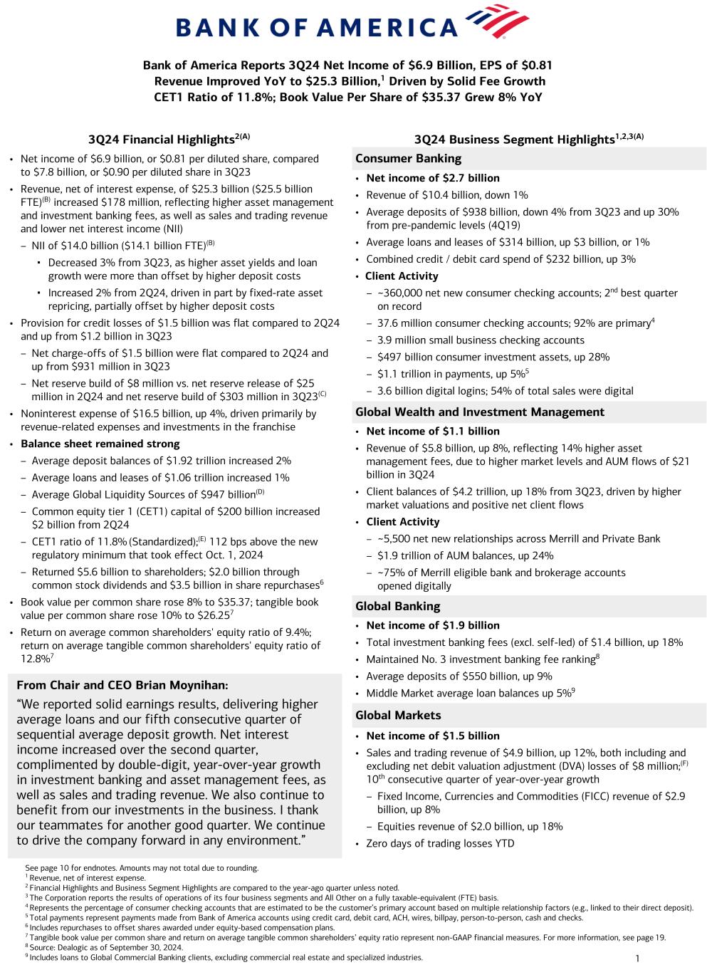 1 3Q24 Financial Highlights2(A) 3Q24 Business Segment Highlights1,2,3(A) Consumer Banking • Net income of $2.7 billion • Revenue of $10.4 billion, down 1% • Average deposits of $938 billion, down 4% from 3Q23 and up 30% from pre-pandemic levels (4Q19) • Average loans and leases of $314 billion, up $3 billion, or 1% • Combined credit / debit card spend of $232 billion, up 3% • Client Activity – ~360,000 net new consumer checking accounts; 2nd best quarter on record – 37.6 million consumer checking accounts; 92% are primary4 – 3.9 million small business checking accounts – $497 billion consumer investment assets, up 28% – $1.1 trillion in payments, up 5%5 – 3.6 billion digital logins; 54% of total sales were digital Global Wealth and Investment Management • Net income of $1.1 billion • Revenue of $5.8 billion, up 8%, reflecting 14% higher asset management fees, due to higher market levels and AUM flows of $21 billion in 3Q24 • Client balances of $4.2 trillion, up 18% from 3Q23, driven by higher market valuations and positive net client flows • Client Activity – ~5,500 net new relationships across Merrill and Private Bank – $1.9 trillion of AUM balances, up 24% – ~75% of Merrill eligible bank and brokerage accounts opened digitally Global Banking • Net income of $1.9 billion • Total investment banking fees (excl. self-led) of $1.4 billion, up 18% • Maintained No. 3 investment banking fee ranking8 • Average deposits of $550 billion, up 9% • Middle Market average loan balances up 5%9 Global Markets • Net income of $1.5 billion • Sales and trading revenue of $4.9 billion, up 12%, both including and excluding net debit valuation adjustment (DVA) losses of $8 million;(F) 10th consecutive quarter of year-over-year growth – Fixed Income, Currencies and Commodities (FICC) revenue of $2.9 billion, up 8% – Equities revenue of $2.0 billion, up 18% • Zero days of trading losses YTD • Net income of $6.9 billion, or $0.81 per diluted share, compared to $7.8 billion, or $0.90 per diluted share in 3Q23 • Revenue, net of interest expense, of $25.3 billion ($25.5 billion FTE)(B) increased $178 million, reflecting higher asset management and investment banking fees, as well as sales and trading revenue and lower net interest income (NII) – NII of $14.0 billion ($14.1 billion FTE)(B) ▪ Decreased 3% from 3Q23, as higher asset yields and loan growth were more than offset by higher deposit costs ▪ Increased 2% from 2Q24, driven in part by fixed-rate asset repricing, partially offset by higher deposit costs • Provision for credit losses of $1.5 billion was flat compared to 2Q24 and up from $1.2 billion in 3Q23 – Net charge-offs of $1.5 billion were flat compared to 2Q24 and up from $931 million in 3Q23 – Net reserve build of $8 million vs. net reserve release of $25 million in 2Q24 and net reserve build of $303 million in 3Q23(C) • Noninterest expense of $16.5 billion, up 4%, driven primarily by revenue-related expenses and investments in the franchise • Balance sheet remained strong – Average deposit balances of $1.92 trillion increased 2% – Average loans and leases of $1.06 trillion increased 1% – Average Global Liquidity Sources of $947 billion(D) – Common equity tier 1 (CET1) capital of $200 billion increased $2 billion from 2Q24 – CET1 ratio of 11.8% (Standardized);(E) 112 bps above the new regulatory minimum that took effect Oct. 1, 2024 – Returned $5.6 billion to shareholders; $2.0 billion through common stock dividends and $3.5 billion in share repurchases6 • Book value per common share rose 8% to $35.37; tangible book value per common share rose 10% to $26.257 • Return on average common shareholders' equity ratio of 9.4%; return on average tangible common shareholders' equity ratio of 12.8%7 From Chair and CEO Brian Moynihan: “We reported solid earnings results, delivering higher average loans and our fifth consecutive quarter of sequential average deposit growth. Net interest income increased over the second quarter, complimented by double-digit, year-over-year growth in investment banking and asset management fees, as well as sales and trading revenue. We also continue to benefit from our investments in the business. I thank our teammates for another good quarter. We continue to drive the company forward in any environment.” See page 10 for endnotes. Amounts may not total due to rounding. 1 Revenue, net of interest expense. 2 Financial Highlights and Business Segment Highlights are compared to the year-ago quarter unless noted. 3 The Corporation reports the results of operations of its four business segments and All Other on a fully taxable-equivalent (FTE) basis. 4 Represents the percentage of consumer checking accounts that are estimated to be the customer’s primary account based on multiple relationship factors (e.g., linked to their direct deposit). 5 Total payments represent payments made from Bank of America accounts using credit card, debit card, ACH, wires, billpay, person-to-person, cash and checks. 6 Includes repurchases to offset shares awarded under equity-based compensation plans. 7 Tangible book value per common share and return on average tangible common shareholders’ equity ratio represent non-GAAP financial measures. For more information, see page 19. 8 Source: Dealogic as of September 30, 2024. 9 Includes loans to Global Commercial Banking clients, excluding commercial real estate and specialized industries. Bank of America Reports 3Q24 Net Income of $6.9 Billion, EPS of $0.81 Revenue Improved YoY to $25.3 Billion,1 Driven by Solid Fee Growth CET1 Ratio of 11.8%; Book Value Per Share of $35.37 Grew 8% YoY