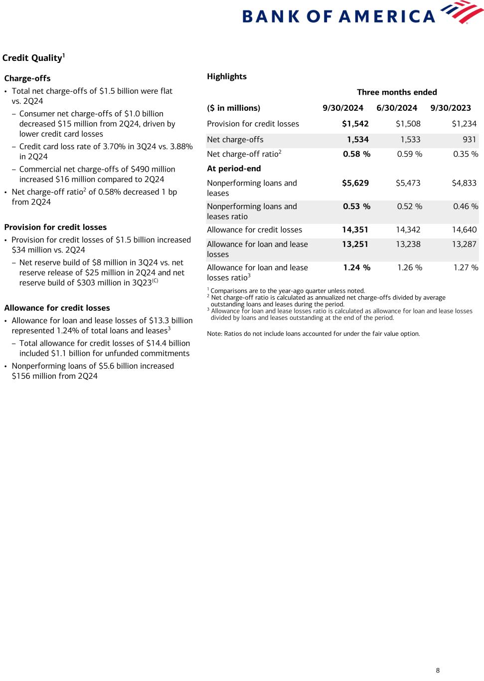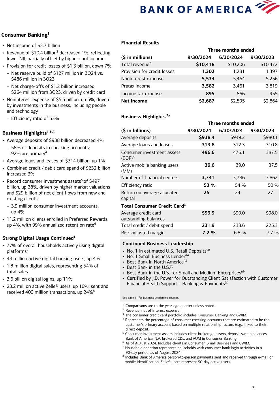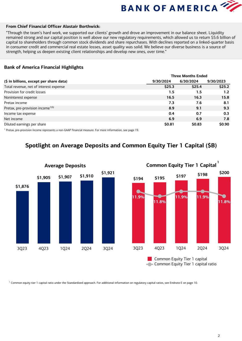 2 From Chief Financial Officer Alastair Borthwick: “Through the team’s hard work, we supported our clients’ growth and drove an improvement in our balance sheet. Liquidity remained strong and our capital position is well above our new regulatory requirements, which allowed us to return $5.6 billion of capital to shareholders through common stock dividends and share repurchases. With declines reported on a linked-quarter basis in consumer credit and commercial real estate losses, asset quality was solid. We believe our diverse business is a source of strength, helping us deepen existing client relationships and develop new ones, over time.” Bank of America Financial Highlights Three Months Ended ($ in billions, except per share data) 9/30/2024 6/30/2024 9/30/2023 Total revenue, net of interest expense $25.3 $25.4 $25.2 Provision for credit losses 1.5 1.5 1.2 Noninterest expense 16.5 16.3 15.8 Pretax income 7.3 7.6 8.1 Pretax, pre-provision income1(G) 8.9 9.1 9.3 Income tax expense 0.4 0.7 0.3 Net income 6.9 6.9 7.8 Diluted earnings per share $0.81 $0.83 $0.90 1 Pretax, pre-provision income represents a non-GAAP financial measure. For more information, see page 19. Common Equity Tier 1 Capital $194 $195 $197 $198 $200 11.9% 11.8% 11.9% 11.9% 11.8% Common Equity Tier 1 capital Common Equity Tier 1 capital ratio 3Q23 4Q23 1Q24 2Q24 3Q24 Average Deposits $1,876 $1,905 $1,907 $1,910 $1,921 3Q23 4Q23 1Q24 2Q24 3Q24 Spotlight on Average Deposits and Common Equity Tier 1 Capital ($B) 1 1 Common equity tier 1 capital ratio under the Standardized approach. For additional information on regulatory capital ratios, see Endnote E on page 10.