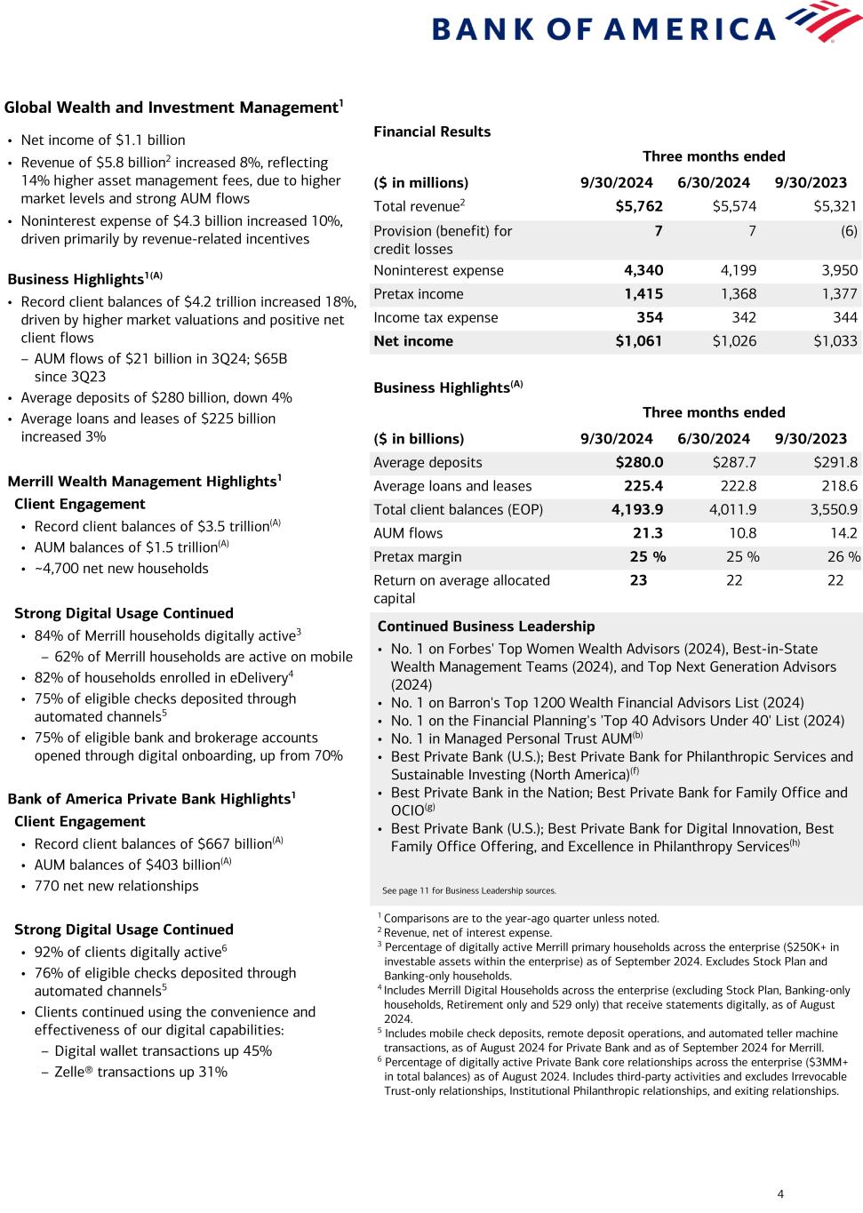 3 Consumer Banking1 Financial Results Three months ended ($ in millions) 9/30/2024 6/30/2024 9/30/2023 Total revenue2 $10,418 $10,206 $10,472 Provision for credit losses 1,302 1,281 1,397 Noninterest expense 5,534 5,464 5,256 Pretax income 3,582 3,461 3,819 Income tax expense 895 866 955 Net income $2,687 $2,595 $2,864 Business Highlights(A) Three months ended ($ in billions) 9/30/2024 6/30/2024 9/30/2023 Average deposits $938.4 $949.2 $980.1 Average loans and leases 313.8 312.3 310.8 Consumer investment assets (EOP)5 496.6 476.1 387.5 Active mobile banking users (MM) 39.6 39.0 37.5 Number of financial centers 3,741 3,786 3,862 Efficiency ratio 53 % 54 % 50 % Return on average allocated capital 25 24 27 Total Consumer Credit Card3 Average credit card outstanding balances $99.9 $99.0 $98.0 Total credit / debit spend 231.9 233.6 225.3 Risk-adjusted margin 7.2 % 6.8 % 7.7 % Continued Business Leadership • No. 1 in estimated U.S. Retail Deposits(a) • No. 1 Small Business Lender(b) • Best Bank in North America(c) • Best Bank in the U.S.(c) • Best Bank in the U.S. for Small and Medium Enterprises(d) • Certified by J.D. Power for Outstanding Client Satisfaction with Customer Financial Health Support – Banking & Payments(e) See page 11 for Business Leadership sources. 1 Comparisons are to the year-ago quarter unless noted. 2 Revenue, net of interest expense. 3 The consumer credit card portfolio includes Consumer Banking and GWIM. 4 Represents the percentage of consumer checking accounts that are estimated to be the customer’s primary account based on multiple relationship factors (e.g., linked to their direct deposit). 5 Consumer investment assets includes client brokerage assets, deposit sweep balances, Bank of America, N.A. brokered CDs, and AUM in Consumer Banking. 6 As of August 2024. Includes clients in Consumer, Small Business and GWIM. 7 Household adoption represents households with consumer bank login activities in a 90-day period, as of August 2024. 8 Includes Bank of America person-to-person payments sent and received through e-mail or mobile identification. Zelle® users represent 90-day active users. • Net income of $2.7 billion • Revenue of $10.4 billion2 decreased 1%, reflecting lower NII, partially offset by higher card income • Provision for credit losses of $1.3 billion, down 7% – Net reserve build of $127 million in 3Q24 vs. $486 million in 3Q23 – Net charge-offs of $1.2 billion increased $264 million from 3Q23, driven by credit card • Noninterest expense of $5.5 billion, up 5%, driven by investments in the business, including people and technology – Efficiency ratio of 53% Business Highlights1,3(A) • Average deposits of $938 billion decreased 4% – 58% of deposits in checking accounts; 92% are primary4 • Average loans and leases of $314 billion, up 1% • Combined credit / debit card spend of $232 billion increased 3% • Record consumer investment assets5 of $497 billion, up 28%, driven by higher market valuations and $29 billion of net client flows from new and existing clients – 3.9 million consumer investment accounts, up 4% • 11.2 million clients enrolled in Preferred Rewards, up 4%, with 99% annualized retention rate6 Strong Digital Usage Continued1 • 77% of overall households actively using digital platforms7 • 48 million active digital banking users, up 4% • 1.8 million digital sales, representing 54% of total sales • 3.6 billion digital logins, up 11% • 23.2 million active Zelle® users, up 10%; sent and received 400 million transactions, up 24%8