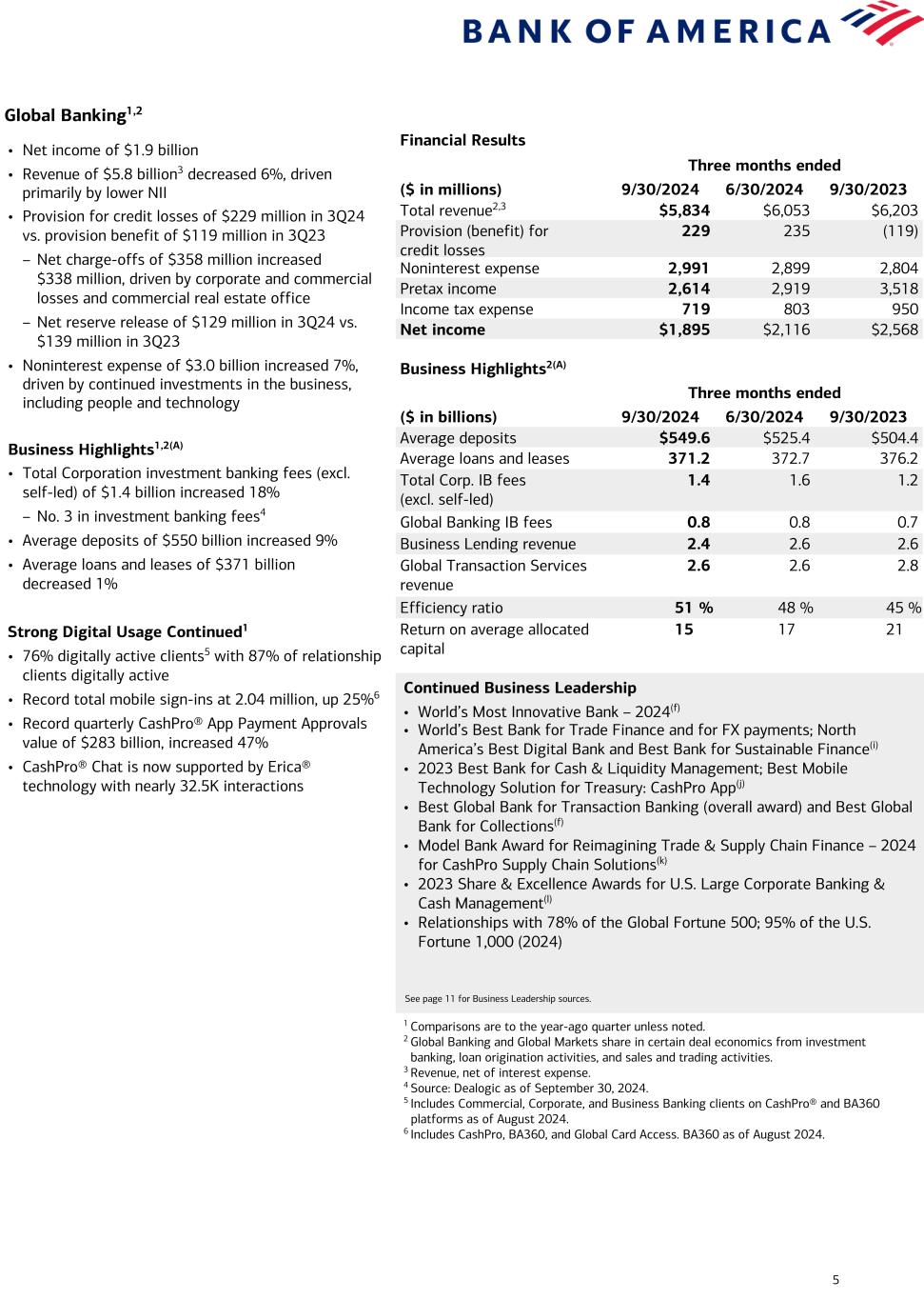 4 Global Wealth and Investment Management1 Financial Results Three months ended ($ in millions) 9/30/2024 6/30/2024 9/30/2023 Total revenue2 $5,762 $5,574 $5,321 Provision (benefit) for credit losses 7 7 (6) Noninterest expense 4,340 4,199 3,950 Pretax income 1,415 1,368 1,377 Income tax expense 354 342 344 Net income $1,061 $1,026 $1,033 Business Highlights(A) Three months ended ($ in billions) 9/30/2024 6/30/2024 9/30/2023 Average deposits $280.0 $287.7 $291.8 Average loans and leases 225.4 222.8 218.6 Total client balances (EOP) 4,193.9 4,011.9 3,550.9 AUM flows 21.3 10.8 14.2 Pretax margin 25 % 25 % 26 % Return on average allocated capital 23 22 22 • Net income of $1.1 billion • Revenue of $5.8 billion2 increased 8%, reflecting 14% higher asset management fees, due to higher market levels and strong AUM flows • Noninterest expense of $4.3 billion increased 10%, driven primarily by revenue-related incentives Business Highlights1(A) • Record client balances of $4.2 trillion increased 18%, driven by higher market valuations and positive net client flows – AUM flows of $21 billion in 3Q24; $65B since 3Q23 • Average deposits of $280 billion, down 4% • Average loans and leases of $225 billion increased 3% Merrill Wealth Management Highlights1 Client Engagement • Record client balances of $3.5 trillion(A) • AUM balances of $1.5 trillion(A) • ~4,700 net new households Strong Digital Usage Continued • 84% of Merrill households digitally active3 – 62% of Merrill households are active on mobile • 82% of households enrolled in eDelivery4 • 75% of eligible checks deposited through automated channels5 • 75% of eligible bank and brokerage accounts opened through digital onboarding, up from 70% Bank of America Private Bank Highlights1 Client Engagement • Record client balances of $667 billion(A) • AUM balances of $403 billion(A) • 770 net new relationships Strong Digital Usage Continued • 92% of clients digitally active6 • 76% of eligible checks deposited through automated channels5 • Clients continued using the convenience and effectiveness of our digital capabilities: – Digital wallet transactions up 45% – Zelle® transactions up 31% Continued Business Leadership • No. 1 on Forbes' Top Women Wealth Advisors (2024), Best-in-State Wealth Management Teams (2024), and Top Next Generation Advisors (2024) • No. 1 on Barron's Top 1200 Wealth Financial Advisors List (2024) • No. 1 on the Financial Planning's 'Top 40 Advisors Under 40' List (2024) • No. 1 in Managed Personal Trust AUM(b) • Best Private Bank (U.S.); Best Private Bank for Philanthropic Services and Sustainable Investing (North America)(f) • Best Private Bank in the Nation; Best Private Bank for Family Office and OCIO(g) • Best Private Bank (U.S.); Best Private Bank for Digital Innovation, Best Family Office Offering, and Excellence in Philanthropy Services(h) See page 11 for Business Leadership sources. 1 Comparisons are to the year-ago quarter unless noted. 2 Revenue, net of interest expense. 3 Percentage of digitally active Merrill primary households across the enterprise ($250K+ in investable assets within the enterprise) as of September 2024. Excludes Stock Plan and Banking-only households. 4 Includes Merrill Digital Households across the enterprise (excluding Stock Plan, Banking-only households, Retirement only and 529 only) that receive statements digitally, as of August 2024. 5 Includes mobile check deposits, remote deposit operations, and automated teller machine transactions, as of August 2024 for Private Bank and as of September 2024 for Merrill. 6 Percentage of digitally active Private Bank core relationships across the enterprise ($3MM+ in total balances) as of August 2024. Includes third-party activities and excludes Irrevocable Trust-only relationships, Institutional Philanthropic relationships, and exiting relationships.