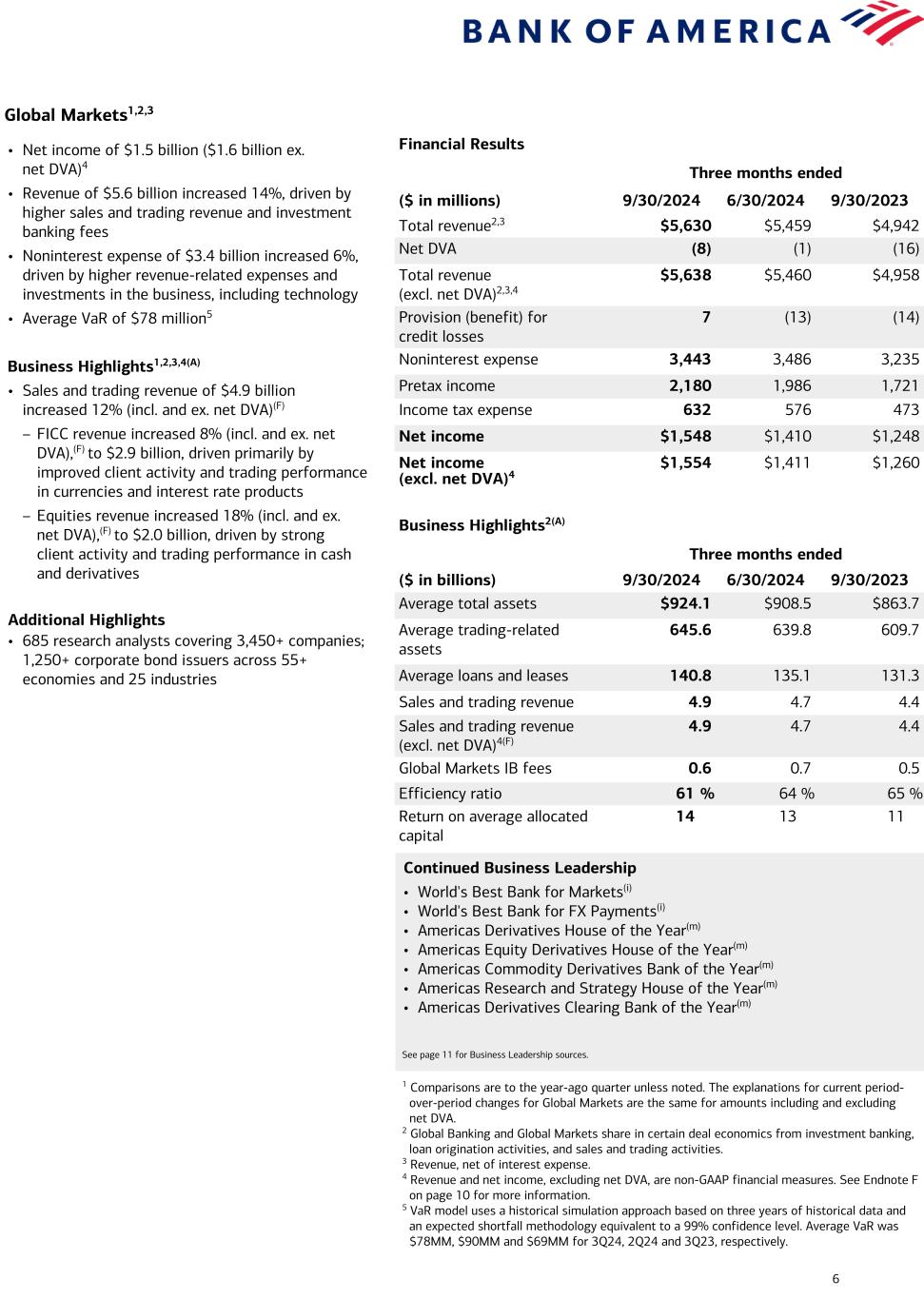 5 Global Banking1,2 Financial Results Three months ended ($ in millions) 9/30/2024 6/30/2024 9/30/2023 Total revenue2,3 $5,834 $6,053 $6,203 Provision (benefit) for credit losses 229 235 (119) Noninterest expense 2,991 2,899 2,804 Pretax income 2,614 2,919 3,518 Income tax expense 719 803 950 Net income $1,895 $2,116 $2,568 Business Highlights2(A) Three months ended ($ in billions) 9/30/2024 6/30/2024 9/30/2023 Average deposits $549.6 $525.4 $504.4 Average loans and leases 371.2 372.7 376.2 Total Corp. IB fees (excl. self-led) 1.4 1.6 1.2 Global Banking IB fees 0.8 0.8 0.7 Business Lending revenue 2.4 2.6 2.6 Global Transaction Services revenue 2.6 2.6 2.8 Efficiency ratio 51 % 48 % 45 % Return on average allocated capital 15 17 21 • Net income of $1.9 billion • Revenue of $5.8 billion3 decreased 6%, driven primarily by lower NII • Provision for credit losses of $229 million in 3Q24 vs. provision benefit of $119 million in 3Q23 – Net charge-offs of $358 million increased $338 million, driven by corporate and commercial losses and commercial real estate office – Net reserve release of $129 million in 3Q24 vs. $139 million in 3Q23 • Noninterest expense of $3.0 billion increased 7%, driven by continued investments in the business, including people and technology Business Highlights1,2(A) • Total Corporation investment banking fees (excl. self-led) of $1.4 billion increased 18% – No. 3 in investment banking fees4 • Average deposits of $550 billion increased 9% • Average loans and leases of $371 billion decreased 1% Strong Digital Usage Continued1 • 76% digitally active clients5 with 87% of relationship clients digitally active • Record total mobile sign-ins at 2.04 million, up 25%6 • Record quarterly CashPro® App Payment Approvals value of $283 billion, increased 47% • CashPro® Chat is now supported by Erica® technology with nearly 32.5K interactions Continued Business Leadership • World’s Most Innovative Bank – 2024(f) • World’s Best Bank for Trade Finance and for FX payments; North America’s Best Digital Bank and Best Bank for Sustainable Finance(i) • 2023 Best Bank for Cash & Liquidity Management; Best Mobile Technology Solution for Treasury: CashPro App(j) • Best Global Bank for Transaction Banking (overall award) and Best Global Bank for Collections(f) • Model Bank Award for Reimagining Trade & Supply Chain Finance – 2024 for CashPro Supply Chain Solutions(k) • 2023 Share & Excellence Awards for U.S. Large Corporate Banking & Cash Management(l) • Relationships with 78% of the Global Fortune 500; 95% of the U.S. Fortune 1,000 (2024) See page 11 for Business Leadership sources. 1 Comparisons are to the year-ago quarter unless noted. 2 Global Banking and Global Markets share in certain deal economics from investment banking, loan origination activities, and sales and trading activities. 3 Revenue, net of interest expense. 4 Source: Dealogic as of September 30, 2024. 5 Includes Commercial, Corporate, and Business Banking clients on CashPro® and BA360 platforms as of August 2024. 6 Includes CashPro, BA360, and Global Card Access. BA360 as of August 2024.