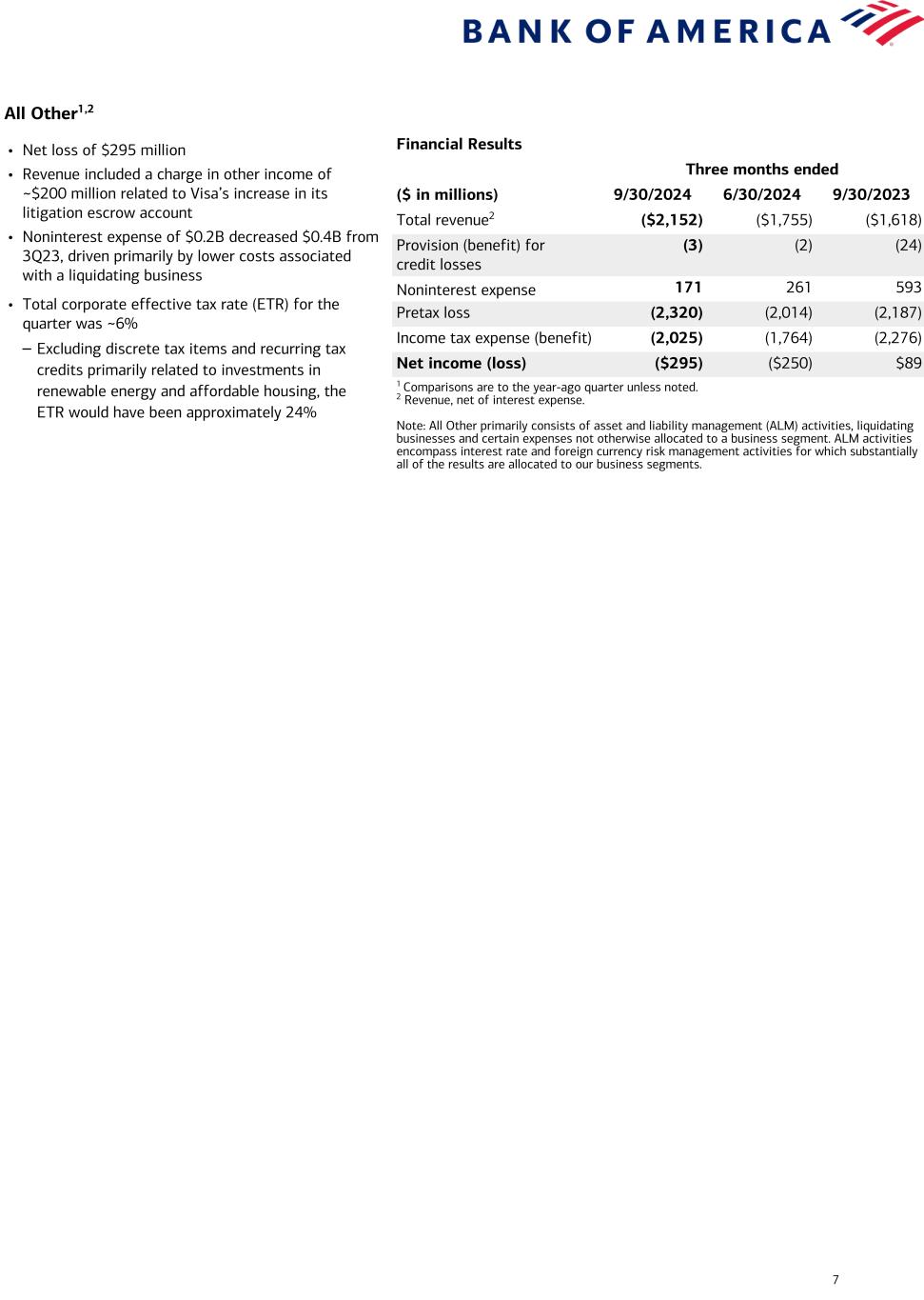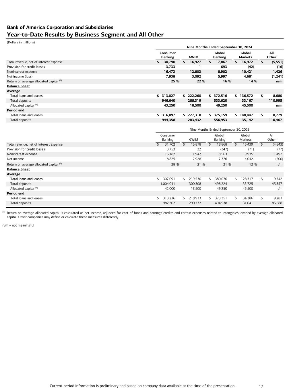 Current-period information is preliminary and based on company data available at the time of the presentation. 16 Bank of America Corporation and Subsidiaries Quarterly Results by Business Segment and All Other (Dollars in millions) Third Quarter 2024 Consumer Banking GWIM Global Banking Global Markets All Other Total revenue, net of interest expense $ 10,418 $ 5,762 $ 5,834 $ 5,630 $ (2,152) Provision for credit losses 1,302 7 229 7 (3) Noninterest expense 5,534 4,340 2,991 3,443 171 Net income 2,687 1,061 1,895 1,548 (295) Return on average allocated capital (1) 25 % 23 % 15 % 14 % n/m Balance Sheet Average Total loans and leases $ 313,781 $ 225,355 $ 371,216 $ 140,806 $ 8,570 Total deposits 938,364 279,999 549,629 34,952 117,804 Allocated capital (1) 43,250 18,500 49,250 45,500 n/m Period end Total loans and leases $ 316,097 $ 227,318 $ 375,159 $ 148,447 $ 8,779 Total deposits 944,358 283,432 556,953 35,142 110,467 Second Quarter 2024 Consumer Banking GWIM Global Banking Global Markets All Other Total revenue, net of interest expense $ 10,206 $ 5,574 $ 6,053 $ 5,459 $ (1,755) Provision for credit losses 1,281 7 235 (13) (2) Noninterest expense 5,464 4,199 2,899 3,486 261 Net income (loss) 2,595 1,026 2,116 1,410 (250) Return on average allocated capital (1) 24 % 22 % 17 % 13 % n/m Balance Sheet Average Total loans and leases $ 312,254 $ 222,776 $ 372,738 $ 135,106 $ 8,598 Total deposits 949,180 287,678 525,357 31,944 115,766 Allocated capital (1) 43,250 18,500 49,250 45,500 n/m Period end Total loans and leases $ 312,801 $ 224,837 $ 372,421 $ 138,441 $ 8,285 Total deposits 952,473 281,283 522,525 33,151 121,059 Third Quarter 2023 Consumer Banking GWIM Global Banking Global Markets All Other Total revenue, net of interest expense $ 10,472 $ 5,321 $ 6,203 $ 4,942 $ (1,618) Provision for credit losses 1,397 (6) (119) (14) (24) Noninterest expense 5,256 3,950 2,804 3,235 593 Net income 2,864 1,033 2,568 1,248 89 Return on average allocated capital (1) 27 % 22 % 21 % 11 % n/m Balance Sheet Average Total loans and leases $ 310,761 $ 218,569 $ 376,214 $ 131,298 $ 9,412 Total deposits 980,051 291,770 504,432 31,890 68,010 Allocated capital (1) 42,000 18,500 49,250 45,500 n/m Period end Total loans and leases $ 313,216 $ 218,913 $ 373,351 $ 134,386 $ 9,283 Total deposits 982,302 290,732 494,938 31,041 85,588 (1) Return on average allocated capital is calculated as net income, adjusted for cost of funds and earnings credits and certain expenses related to intangibles, divided by average allocated capital. Other companies may define or calculate these measures differently. n/m = not meaningful The Company reports the results of operations of its four business segments and All Other on a fully taxable-equivalent (FTE) basis.