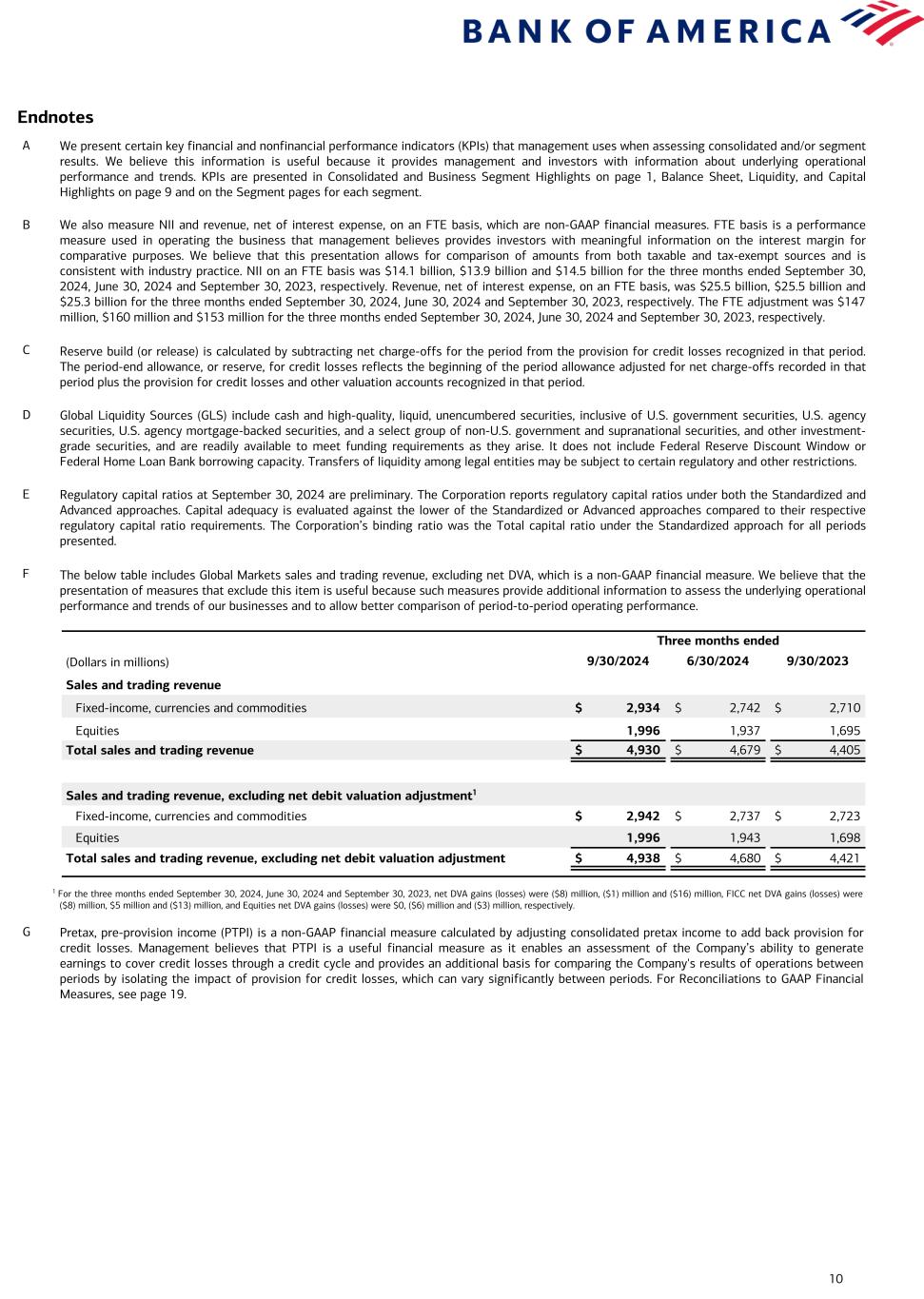 10 Endnotes Three months ended (Dollars in millions) 9/30/2024 6/30/2024 9/30/2023 Sales and trading revenue Fixed-income, currencies and commodities $ 2,934 $ 2,742 $ 2,710 Equities 1,996 1,937 1,695 Total sales and trading revenue $ 4,930 $ 4,679 $ 4,405 Sales and trading revenue, excluding net debit valuation adjustment1 Fixed-income, currencies and commodities $ 2,942 $ 2,737 $ 2,723 Equities 1,996 1,943 1,698 Total sales and trading revenue, excluding net debit valuation adjustment $ 4,938 $ 4,680 $ 4,421 A We present certain key financial and nonfinancial performance indicators (KPIs) that management uses when assessing consolidated and/or segment results. We believe this information is useful because it provides management and investors with information about underlying operational performance and trends. KPIs are presented in Consolidated and Business Segment Highlights on page 1, Balance Sheet, Liquidity, and Capital Highlights on page 9 and on the Segment pages for each segment. B We also measure NII and revenue, net of interest expense, on an FTE basis, which are non-GAAP financial measures. FTE basis is a performance measure used in operating the business that management believes provides investors with meaningful information on the interest margin for comparative purposes. We believe that this presentation allows for comparison of amounts from both taxable and tax-exempt sources and is consistent with industry practice. NII on an FTE basis was $14.1 billion, $13.9 billion and $14.5 billion for the three months ended September 30, 2024, June 30, 2024 and September 30, 2023, respectively. Revenue, net of interest expense, on an FTE basis, was $25.5 billion, $25.5 billion and $25.3 billion for the three months ended September 30, 2024, June 30, 2024 and September 30, 2023, respectively. The FTE adjustment was $147 million, $160 million and $153 million for the three months ended September 30, 2024, June 30, 2024 and September 30, 2023, respectively. C Reserve build (or release) is calculated by subtracting net charge-offs for the period from the provision for credit losses recognized in that period. The period-end allowance, or reserve, for credit losses reflects the beginning of the period allowance adjusted for net charge-offs recorded in that period plus the provision for credit losses and other valuation accounts recognized in that period. D Global Liquidity Sources (GLS) include cash and high-quality, liquid, unencumbered securities, inclusive of U.S. government securities, U.S. agency securities, U.S. agency mortgage-backed securities, and a select group of non-U.S. government and supranational securities, and other investment- grade securities, and are readily available to meet funding requirements as they arise. It does not include Federal Reserve Discount Window or Federal Home Loan Bank borrowing capacity. Transfers of liquidity among legal entities may be subject to certain regulatory and other restrictions. E Regulatory capital ratios at September 30, 2024 are preliminary. The Corporation reports regulatory capital ratios under both the Standardized and Advanced approaches. Capital adequacy is evaluated against the lower of the Standardized or Advanced approaches compared to their respective regulatory capital ratio requirements. The Corporation’s binding ratio was the Total capital ratio under the Standardized approach for all periods presented. F The below table includes Global Markets sales and trading revenue, excluding net DVA, which is a non-GAAP financial measure. We believe that the presentation of measures that exclude this item is useful because such measures provide additional information to assess the underlying operational performance and trends of our businesses and to allow better comparison of period-to-period operating performance. 1 For the three months ended September 30, 2024, June 30, 2024 and September 30, 2023, net DVA gains (losses) were ($8) million, ($1) million and ($16) million, FICC net DVA gains (losses) were ($8) million, $5 million and ($13) million, and Equities net DVA gains (losses) were $0, ($6) million and ($3) million, respectively. G Pretax, pre-provision income (PTPI) is a non-GAAP financial measure calculated by adjusting consolidated pretax income to add back provision for credit losses. Management believes that PTPI is a useful financial measure as it enables an assessment of the Company’s ability to generate earnings to cover credit losses through a credit cycle and provides an additional basis for comparing the Company's results of operations between periods by isolating the impact of provision for credit losses, which can vary significantly between periods. For Reconciliations to GAAP Financial Measures, see page 19.