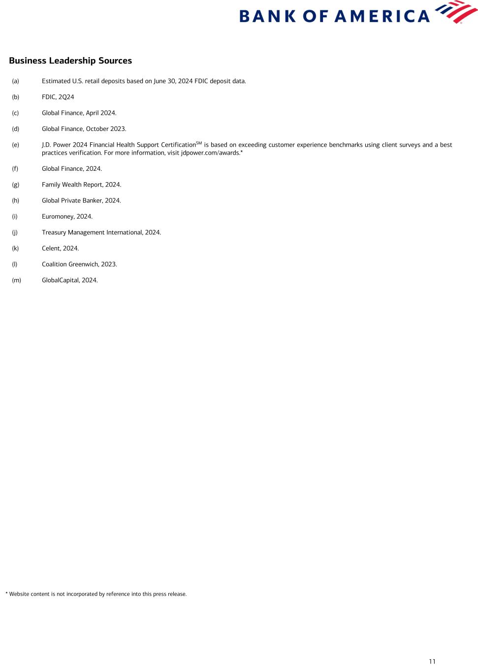 11 (a) Estimated U.S. retail deposits based on June 30, 2024 FDIC deposit data. (b) FDIC, 2Q24 (c) Global Finance, April 2024. (d) Global Finance, October 2023. (e) J.D. Power 2024 Financial Health Support CertificationSM is based on exceeding customer experience benchmarks using client surveys and a best practices verification. For more information, visit jdpower.com/awards.* (f) Global Finance, 2024. (g) Family Wealth Report, 2024. (h) Global Private Banker, 2024. (i) Euromoney, 2024. (j) Treasury Management International, 2024. (k) Celent, 2024. (l) Coalition Greenwich, 2023. (m) GlobalCapital, 2024. Business Leadership Sources * Website content is not incorporated by reference into this press release.