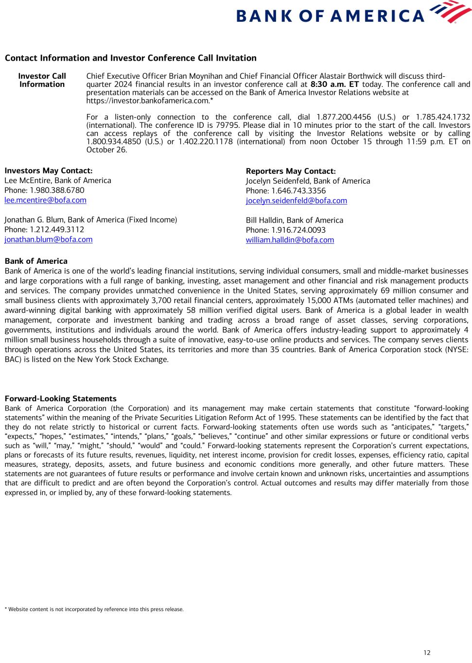 12 Contact Information and Investor Conference Call Invitation Investor Call Information Chief Executive Officer Brian Moynihan and Chief Financial Officer Alastair Borthwick will discuss third- quarter 2024 financial results in an investor conference call at 8:30 a.m. ET today. The conference call and presentation materials can be accessed on the Bank of America Investor Relations website at https://investor.bankofamerica.com.* For a listen-only connection to the conference call, dial 1.877.200.4456 (U.S.) or 1.785.424.1732 (international). The conference ID is 79795. Please dial in 10 minutes prior to the start of the call. Investors can access replays of the conference call by visiting the Investor Relations website or by calling 1.800.934.4850 (U.S.) or 1.402.220.1178 (international) from noon October 15 through 11:59 p.m. ET on October 26. Investors May Contact: Lee McEntire, Bank of America Phone: 1.980.388.6780 lee.mcentire@bofa.com Jonathan G. Blum, Bank of America (Fixed Income) Phone: 1.212.449.3112 jonathan.blum@bofa.com Bank of America Bank of America is one of the world’s leading financial institutions, serving individual consumers, small and middle-market businesses and large corporations with a full range of banking, investing, asset management and other financial and risk management products and services. The company provides unmatched convenience in the United States, serving approximately 69 million consumer and small business clients with approximately 3,700 retail financial centers, approximately 15,000 ATMs (automated teller machines) and award-winning digital banking with approximately 58 million verified digital users. Bank of America is a global leader in wealth management, corporate and investment banking and trading across a broad range of asset classes, serving corporations, governments, institutions and individuals around the world. Bank of America offers industry-leading support to approximately 4 million small business households through a suite of innovative, easy-to-use online products and services. The company serves clients through operations across the United States, its territories and more than 35 countries. Bank of America Corporation stock (NYSE: BAC) is listed on the New York Stock Exchange. Forward-Looking Statements Bank of America Corporation (the Corporation) and its management may make certain statements that constitute “forward-looking statements” within the meaning of the Private Securities Litigation Reform Act of 1995. These statements can be identified by the fact that they do not relate strictly to historical or current facts. Forward-looking statements often use words such as “anticipates,” “targets,” “expects,” “hopes,” “estimates,” “intends,” “plans,” “goals,” “believes,” “continue” and other similar expressions or future or conditional verbs such as “will,” “may,” “might,” “should,” “would” and “could.” Forward-looking statements represent the Corporation’s current expectations, plans or forecasts of its future results, revenues, liquidity, net interest income, provision for credit losses, expenses, efficiency ratio, capital measures, strategy, deposits, assets, and future business and economic conditions more generally, and other future matters. These statements are not guarantees of future results or performance and involve certain known and unknown risks, uncertainties and assumptions that are difficult to predict and are often beyond the Corporation’s control. Actual outcomes and results may differ materially from those expressed in, or implied by, any of these forward-looking statements. * Website content is not incorporated by reference into this press release. Reporters May Contact: Jocelyn Seidenfeld, Bank of America Phone: 1.646.743.3356 jocelyn.seidenfeld@bofa.com Bill Halldin, Bank of America Phone: 1.916.724.0093 william.halldin@bofa.com