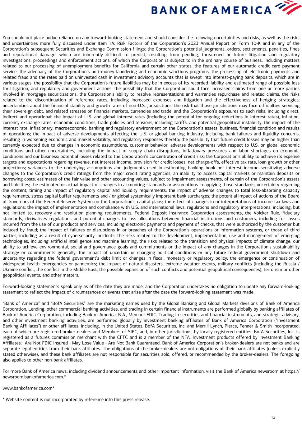 13 You should not place undue reliance on any forward-looking statement and should consider the following uncertainties and risks, as well as the risks and uncertainties more fully discussed under Item 1A. Risk Factors of the Corporation’s 2023 Annual Report on Form 10-K and in any of the Corporation’s subsequent Securities and Exchange Commission filings: the Corporation’s potential judgments, orders, settlements, penalties, fines and reputational damage, which are inherently difficult to predict, resulting from pending, threatened or future litigation and regulatory investigations, proceedings and enforcement actions, of which the Corporation is subject to in the ordinary course of business, including matters related to our processing of unemployment benefits for California and certain other states, the features of our automatic credit card payment service, the adequacy of the Corporation’s anti-money laundering and economic sanctions programs, the processing of electronic payments and related fraud and the rates paid on uninvested cash in investment advisory accounts that is swept into interest-paying bank deposits, which are in various stages; the possibility that the Corporation's future liabilities may be in excess of its recorded liability and estimated range of possible loss for litigation, and regulatory and government actions; the possibility that the Corporation could face increased claims from one or more parties involved in mortgage securitizations; the Corporation’s ability to resolve representations and warranties repurchase and related claims; the risks related to the discontinuation of reference rates, including increased expenses and litigation and the effectiveness of hedging strategies; uncertainties about the financial stability and growth rates of non-U.S. jurisdictions, the risk that those jurisdictions may face difficulties servicing their sovereign debt, and related stresses on financial markets, currencies and trade, and the Corporation’s exposures to such risks, including direct, indirect and operational; the impact of U.S. and global interest rates (including the potential for ongoing reductions in interest rates), inflation, currency exchange rates, economic conditions, trade policies and tensions, including tariffs, and potential geopolitical instability; the impact of the interest rate, inflationary, macroeconomic, banking and regulatory environment on the Corporation’s assets, business, financial condition and results of operations; the impact of adverse developments affecting the U.S. or global banking industry, including bank failures and liquidity concerns, resulting in worsening economic and market volatility, and regulatory responses thereto; the possibility that future credit losses may be higher than currently expected due to changes in economic assumptions, customer behavior, adverse developments with respect to U.S. or global economic conditions and other uncertainties, including the impact of supply chain disruptions, inflationary pressures and labor shortages on economic conditions and our business; potential losses related to the Corporation’s concentration of credit risk; the Corporation's ability to achieve its expense targets and expectations regarding revenue, net interest income, provision for credit losses, net charge-offs, effective tax rate, loan growth or other projections; variances to the underlying assumptions and judgments used in estimating banking book net interest income sensitivity; adverse changes to the Corporation’s credit ratings from the major credit rating agencies; an inability to access capital markets or maintain deposits or borrowing costs; estimates of the fair value and other accounting values, subject to impairment assessments, of certain of the Corporation’s assets and liabilities; the estimated or actual impact of changes in accounting standards or assumptions in applying those standards; uncertainty regarding the content, timing and impact of regulatory capital and liquidity requirements; the impact of adverse changes to total loss-absorbing capacity requirements, stress capital buffer requirements and / or global systemically important bank surcharges; the potential impact of actions of the Board of Governors of the Federal Reserve System on the Corporation’s capital plans; the effect of changes in or interpretations of income tax laws and regulations; the impact of implementation and compliance with U.S. and international laws, regulations and regulatory interpretations, including, but not limited to, recovery and resolution planning requirements, Federal Deposit Insurance Corporation assessments, the Volcker Rule, fiduciary standards, derivatives regulations and potential changes to loss allocations between financial institutions and customers, including for losses incurred from the use of our products and services, including electronic payments and payment of checks, that were authorized by the customer but induced by fraud; the impact of failures or disruptions in or breaches of the Corporation’s operations or information systems, or those of third parties, including as a result of cybersecurity incidents; the risks related to the development, implementation, use and management of emerging technologies, including artificial intelligence and machine learning; the risks related to the transition and physical impacts of climate change; our ability to achieve environmental, social and governance goals and commitments or the impact of any changes in the Corporation's sustainability strategy or commitments generally; the impact of uncertain or changing political conditions or any future federal government shutdown and uncertainty regarding the federal government’s debt limit or changes in fiscal, monetary or regulatory policy; the emergence or continuation of widespread health emergencies or pandemics; the impact of natural disasters, extreme weather events, military conflicts (including