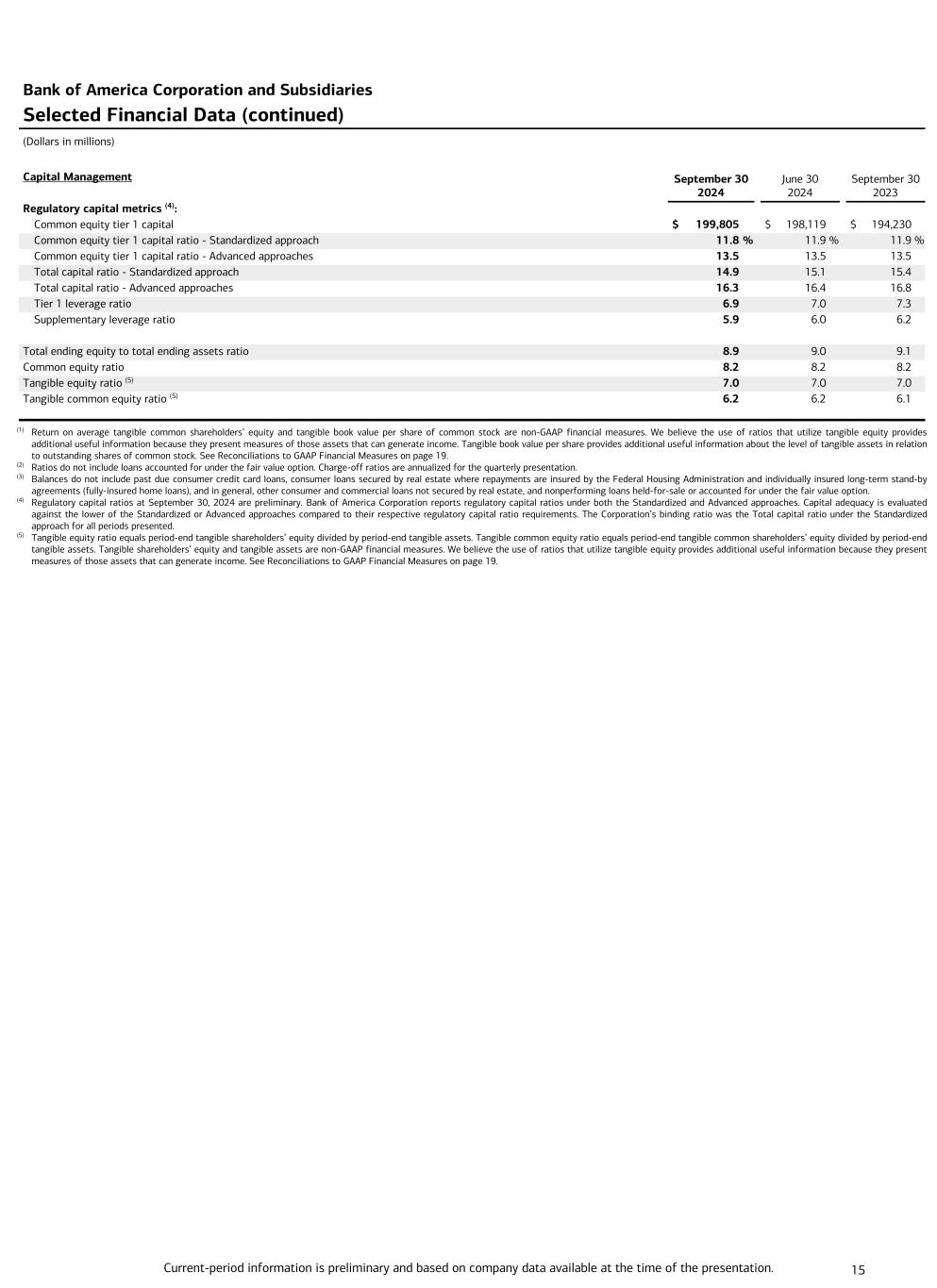 Current-period information is preliminary and based on company data available at the time of the presentation. 15 Bank of America Corporation and Subsidiaries Selected Financial Data (continued) (Dollars in millions) Capital Management September 30 2024 June 30 2024 September 30 2023 Regulatory capital metrics (4): Common equity tier 1 capital $ 199,805 $ 198,119 $ 194,230 Common equity tier 1 capital ratio - Standardized approach 11.8 % 11.9 % 11.9 % Common equity tier 1 capital ratio - Advanced approaches 13.5 13.5 13.5 Total capital ratio - Standardized approach 14.9 15.1 15.4 Total capital ratio - Advanced approaches 16.3 16.4 16.8 Tier 1 leverage ratio 6.9 7.0 7.3 Supplementary leverage ratio 5.9 6.0 6.2 Total ending equity to total ending assets ratio 8.9 9.0 9.1 Common equity ratio 8.2 8.2 8.2 Tangible equity ratio (5) 7.0 7.0 7.0 Tangible common equity ratio (5) 6.2 6.2 6.1 (1) Return on average tangible common shareholders’ equity and tangible book value per share of common stock are non-GAAP financial measures. We believe the use of ratios that utilize tangible equity provides additional useful information because they present measures of those assets that can generate income. Tangible book value per share provides additional useful information about the level of tangible assets in relation to outstanding shares of common stock. See Reconciliations to GAAP Financial Measures on page 19. (2) Ratios do not include loans accounted for under the fair value option. Charge-off ratios are annualized for the quarterly presentation. (3) Balances do not include past due consumer credit card loans, consumer loans secured by real estate where repayments are insured by the Federal Housing Administration and individually insured long-term stand-by agreements (fully-insured home loans), and in general, other consumer and commercial loans not secured by real estate, and nonperforming loans held-for-sale or accounted for under the fair value option. (4) Regulatory capital ratios at September 30, 2024 are preliminary. Bank of America Corporation reports regulatory capital ratios under both the Standardized and Advanced approaches. Capital adequacy is evaluated against the lower of the Standardized or Advanced approaches compared to their respective regulatory capital ratio requirements. The Corporation’s binding ratio was the Total capital ratio under the Standardized approach for all periods presented. (5) Tangible equity ratio equals period-end tangible shareholders’ equity divided by period-end tangible assets. Tangible common equity ratio equals period-end tangible common shareholders’ equity divided by period-end tangible assets. Tangible shareholders’ equity and tangible assets are non-GAAP financial measures. We believe the use of ratios that utilize tangible equity provides additional useful information because they present measures of those assets that can generate income. See Reconciliations to GAAP Financial Measures on page 19.