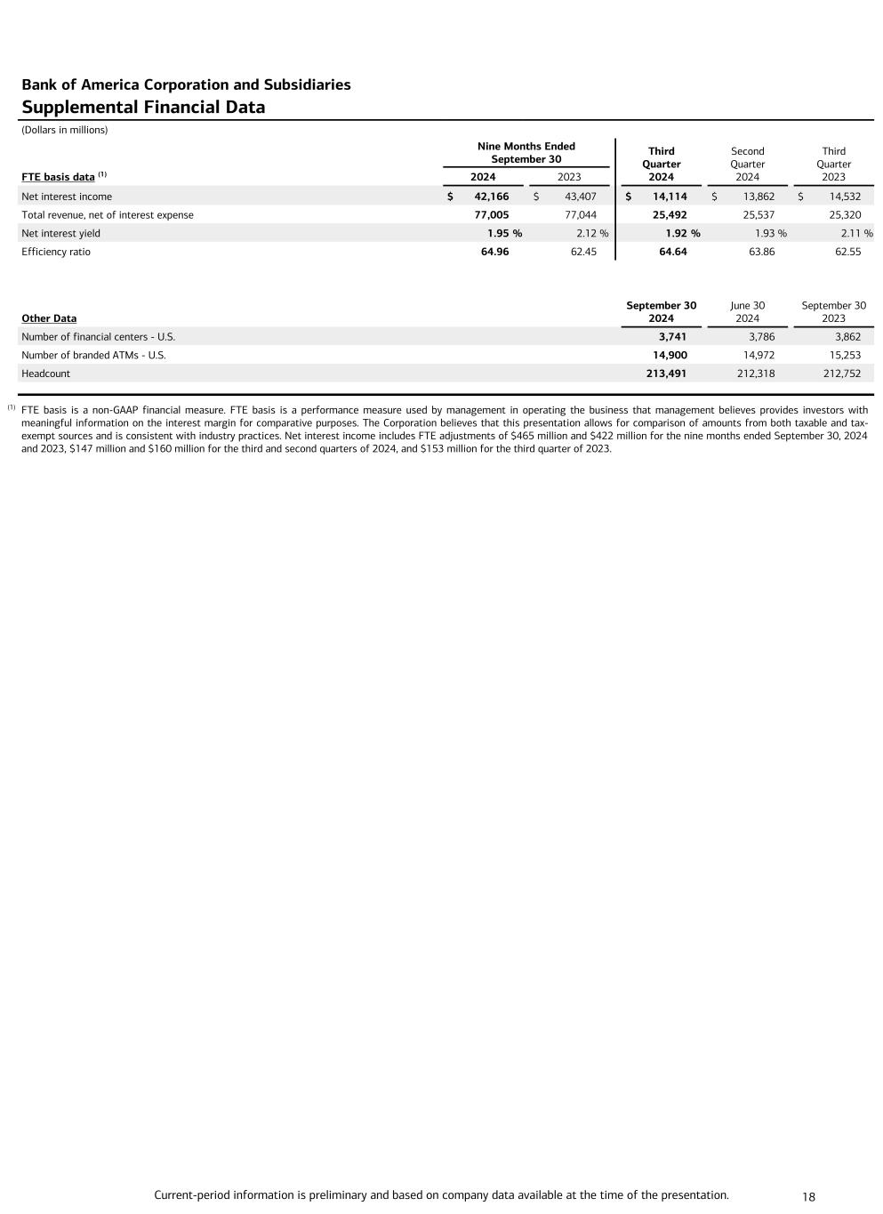 Current-period information is preliminary and based on company data available at the time of the presentation. 18 Bank of America Corporation and Subsidiaries Supplemental Financial Data (Dollars in millions) Nine Months Ended September 30 Third Quarter 2024 Second Quarter 2024 Third Quarter 2023FTE basis data (1) 2024 2023 Net interest income $ 42,166 $ 43,407 $ 14,114 $ 13,862 $ 14,532 Total revenue, net of interest expense 77,005 77,044 25,492 25,537 25,320 Net interest yield 1.95 % 2.12 % 1.92 % 1.93 % 2.11 % Efficiency ratio 64.96 62.45 64.64 63.86 62.55 Other Data September 30 2024 June 30 2024 September 30 2023 Number of financial centers - U.S. 3,741 3,786 3,862 Number of branded ATMs - U.S. 14,900 14,972 15,253 Headcount 213,491 212,318 212,752 (1) FTE basis is a non-GAAP financial measure. FTE basis is a performance measure used by management in operating the business that management believes provides investors with meaningful information on the interest margin for comparative purposes. The Corporation believes that this presentation allows for comparison of amounts from both taxable and tax- exempt sources and is consistent with industry practices. Net interest income includes FTE adjustments of $465 million and $422 million for the nine months ended September 30, 2024 and 2023, $147 million and $160 million for the third and second quarters of 2024, and $153 million for the third quarter of 2023.