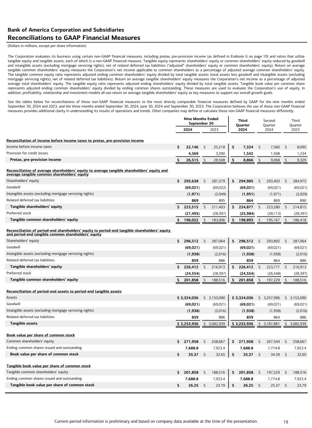 Current-period information is preliminary and based on company data available at the time of the presentation. 19 The Corporation evaluates its business using certain non-GAAP financial measures, including pretax, pre-provision income (as defined in Endnote G on page 10) and ratios that utilize tangible equity and tangible assets, each of which is a non-GAAP financial measure. Tangible equity represents shareholders’ equity or common shareholders’ equity reduced by goodwill and intangible assets (excluding mortgage servicing rights), net of related deferred tax liabilities (“adjusted” shareholders’ equity or common shareholders’ equity). Return on average tangible common shareholders’ equity measures the Corporation’s net income applicable to common shareholders as a percentage of adjusted average common shareholders’ equity. The tangible common equity ratio represents adjusted ending common shareholders’ equity divided by total tangible assets (total assets less goodwill and intangible assets (excluding mortgage servicing rights), net of related deferred tax liabilities). Return on average tangible shareholders’ equity measures the Corporation’s net income as a percentage of adjusted average total shareholders’ equity. The tangible equity ratio represents adjusted ending shareholders’ equity divided by total tangible assets. Tangible book value per common share represents adjusted ending common shareholders’ equity divided by ending common shares outstanding. These measures are used to evaluate the Corporation’s use of equity. In addition, profitability, relationship and investment models all use return on average tangible shareholders’ equity as key measures to support our overall growth goals. See the tables below for reconciliations of these non-GAAP financial measures to the most directly comparable financial measures defined by GAAP for the nine months ended September 30, 2024 and 2023, and the three months ended September 30, 2024, June 30, 2024 and September 30, 2023. The Corporation believes the use of these non-GAAP financial measures provides additional clarity in understanding its results of operations and trends. Other companies may define or calculate these non-GAAP financial measures differently. Bank of America Corporation and Subsidiaries Reconciliations to GAAP Financial Measures (Dollars in millions, except per share information) Nine Months Ended September 30 Third Quarter 2024 Second Quarter 2024 Third Quarter 2023 2024 2023 Reconciliation of income before income taxes to pretax, pre-provision income Income before income taxes $ 22,146 $ 25,218 $ 7,324 $ 7,560 $ 8,095 Provision for credit losses 4,369 3,290 1,542 1,508 1,234 Pretax, pre-provision income $ 26,515 $ 28,508 $ 8,866 $ 9,068 $ 9,329 Reconciliation of average shareholders’ equity to average tangible shareholders’ equity and average tangible common shareholders’ equity Shareholders’ equity $ 293,638 $ 281,579 $ 294,985 $ 293,403 $ 284,975 Goodwill (69,021) (69,022) (69,021) (69,021) (69,021) Intangible assets (excluding mortgage servicing rights) (1,971) (2,049) (1,951) (1,971) (2,029) Related deferred tax liabilities 869 895 864 869 890 Tangible shareholders’ equity $ 223,515 $ 211,403 $ 224,877 $ 223,280 $ 214,815 Preferred stock (27,493) (28,397) (25,984) (28,113) (28,397) Tangible common shareholders’ equity $ 196,022 $ 183,006 $ 198,893 $ 195,167 $ 186,418 Reconciliation of period-end shareholders’ equity to period-end tangible shareholders’ equity and period-end tangible common shareholders’ equity Shareholders’ equity $ 296,512 $ 287,064 $ 296,512 $ 293,892 $ 287,064 Goodwill (69,021) (69,021) (69,021) (69,021) (69,021) Intangible assets (excluding mortgage servicing rights) (1,938) (2,016) (1,938) (1,958) (2,016) Related deferred tax liabilities 859 886 859 864 886 Tangible shareholders’ equity $ 226,412 $ 216,913 $ 226,412 $ 223,777 $ 216,913 Preferred stock (24,554) (28,397) (24,554) (26,548) (28,397) Tangible common shareholders’ equity $ 201,858 $ 188,516 $ 201,858 $ 197,229 $ 188,516 Reconciliation of period-end assets to period-end tangible assets Assets $ 3,324,036 $ 3,153,090 $ 3,324,036 $ 3,257,996 $ 3,153,090 Goodwill (69,021) (69,021) (69,021) (69,021) (69,021) Intangible assets (excluding mortgage servicing rights) (1,938) (2,016) (1,938) (1,958) (2,016) Related deferred tax liabilities 859 886 859 864 886 Tangible assets $ 3,253,936 $ 3,082,939 $ 3,253,936 $ 3,187,881 $ 3,082,939 Book value per share of common stock Common shareholders’ equity $ 271,958 $ 258,667 $ 271,958 $ 267,344 $ 258,667 Ending common shares issued and outstanding 7,688.8 7,923.4 7,688.8 7,774.8 7,923.4 Book value per share of common stock $ 35.37 $ 32.65 $ 35.37 $ 34.39 $ 32.65 Tangible book value per share of common stock Tangible common shareholders’ equity $ 201,858 $ 188,516 $ 201,858 $ 197,229 $ 188,516 Ending common shares issued and outstanding 7,688.8 7,923.4 7,688.8 7,774.8 7,923.4 Tangible book value per share of common stock $ 26.25 $ 23.79 $ 26.25 $ 25.37 $ 23.79