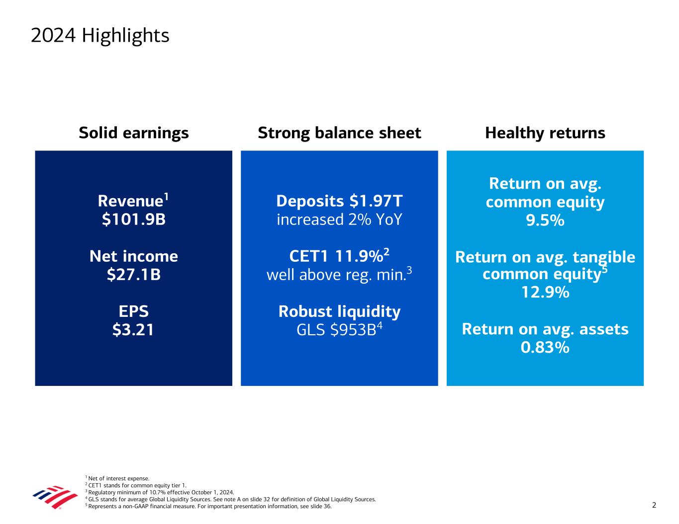 1 Net of interest expense. 2 CET1 stands for common equity tier 1. 3 Regulatory minimum of 10.7% effective October 1, 2024. 4 GLS stands for average Global Liquidity Sources. See note A on slide 32 for definition of Global Liquidity Sources. 5 Represents a non-GAAP financial measure. For important presentation information, see slide 36. Solid earnings Strong balance sheet Healthy returns Revenue1 $101.9B Net income $27.1B EPS $3.21 Deposits $1.97T increased 2% YoY CET1 11.9%2 well above reg. min.3 Robust liquidity GLS $953B4 Return on avg. common equity 9.5% Return on avg. tangible common equity5 12.9% Return on avg. assets 0.83% 2024 Highlights 2