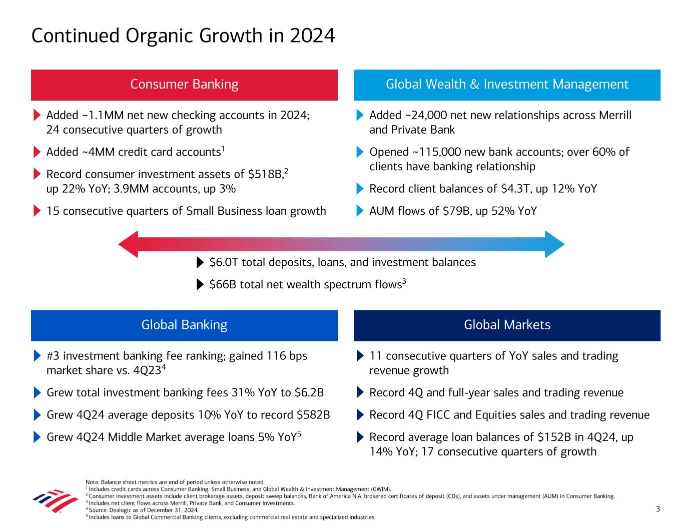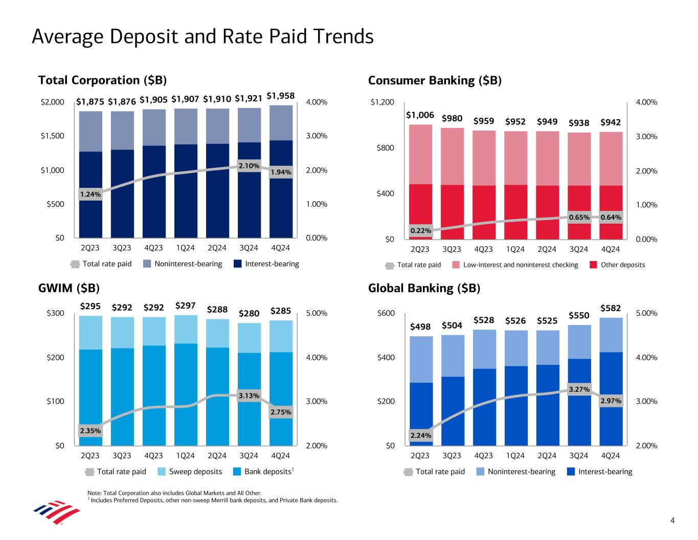 11 consecutive quarters of YoY sales and trading revenue growth Record 4Q and full-year sales and trading revenue Record 4Q FICC and Equities sales and trading revenue Record average loan balances of $152B in 4Q24, up 14% YoY; 17 consecutive quarters of growth Added ~24,000 net new relationships across Merrill and Private Bank Opened ~115,000 new bank accounts; over 60% of clients have banking relationship Record client balances of $4.3T, up 12% YoY AUM flows of $79B, up 52% YoY Continued Organic Growth in 2024 3 Consumer Banking Global Wealth & Investment Management Global Banking Global Markets Added ~1.1MM net new checking accounts in 2024; 24 consecutive quarters of growth Added ~4MM credit card accounts1 Record consumer investment assets of $518B,2 up 22% YoY; 3.9MM accounts, up 3% 15 consecutive quarters of Small Business loan growth $6.0T total deposits, loans, and investment balances $66B total net wealth spectrum flows3 Note: Balance sheet metrics are end of period unless otherwise noted. 1 Includes credit cards across Consumer Banking, Small Business, and Global Wealth & Investment Management (GWIM). 2 Consumer investment assets include client brokerage assets, deposit sweep balances, Bank of America N.A. brokered certificates of deposit (CDs), and assets under management (AUM) in Consumer Banking. 3 Includes net client flows across Merrill, Private Bank, and Consumer Investments. 4 Source: Dealogic as of December 31, 2024. 5 Includes loans to Global Commercial Banking clients, excluding commercial real estate and specialized industries. #3 investment banking fee ranking; gained 116 bps market share vs. 4Q234 Grew total investment banking fees 31% YoY to $6.2B Grew 4Q24 average deposits 10% YoY to record $582B Grew 4Q24 Middle Market average loans 5% YoY5