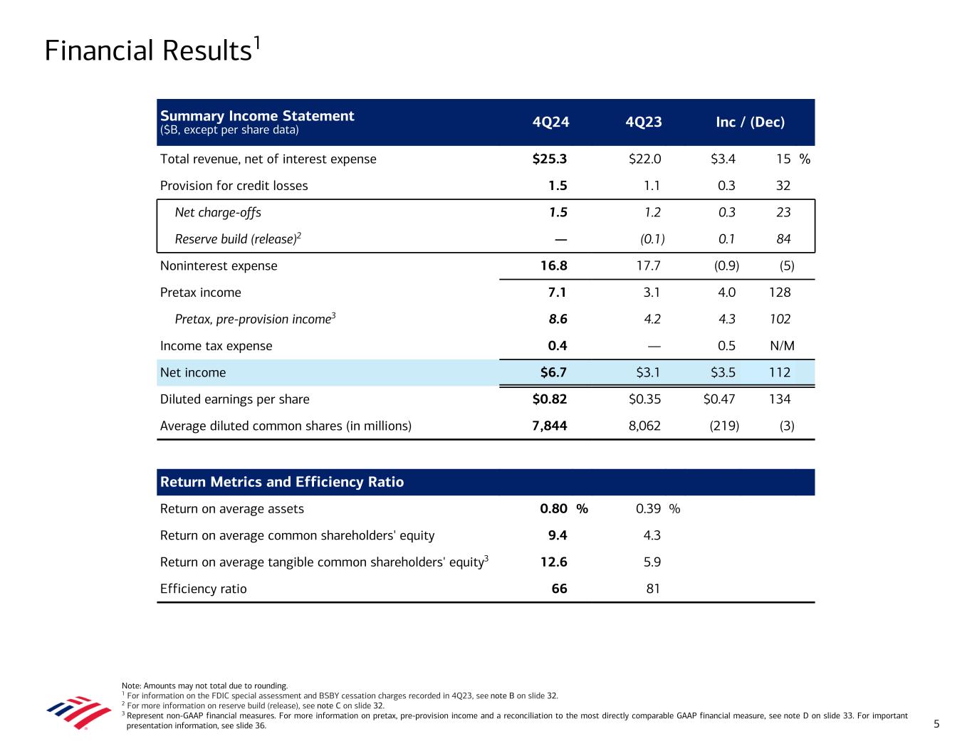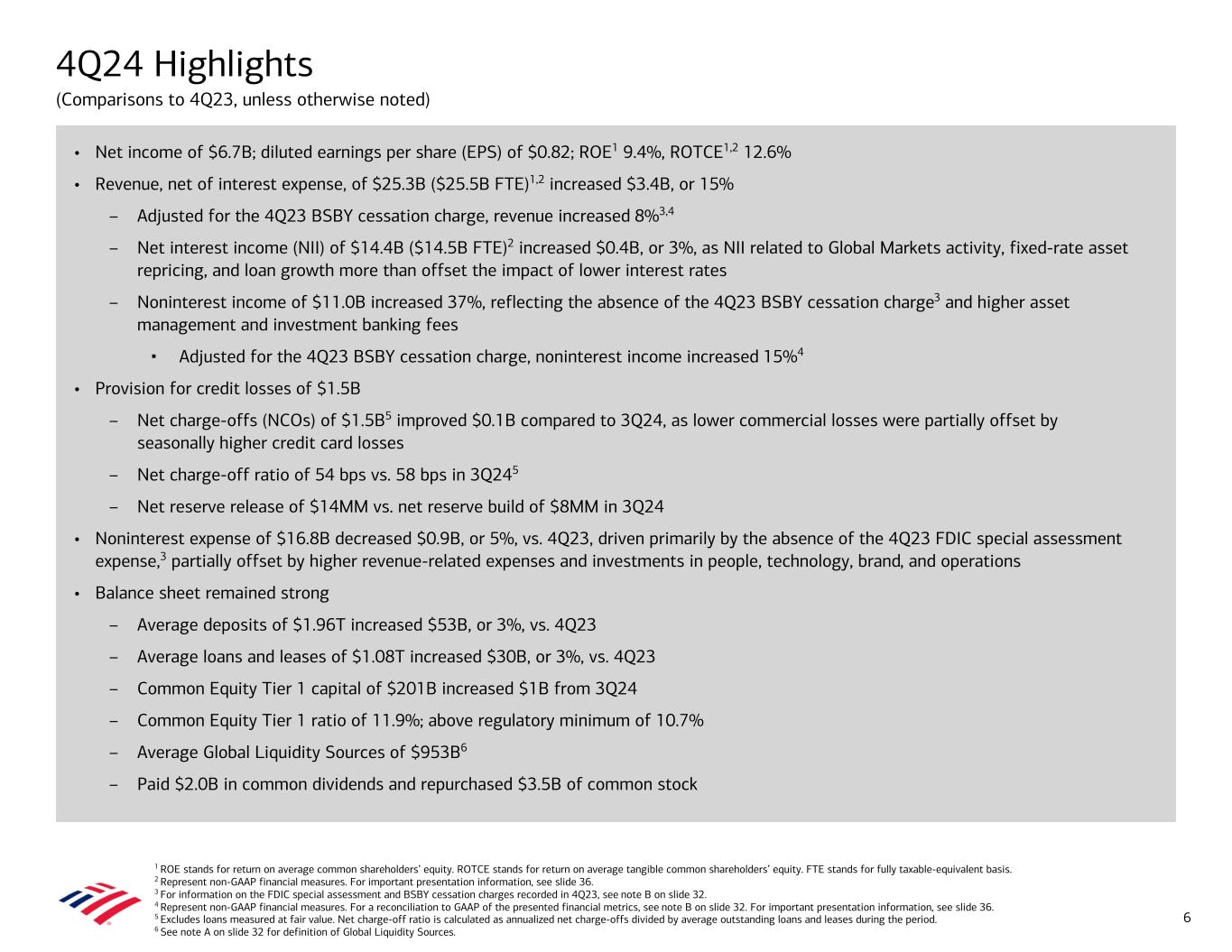 Note: Amounts may not total due to rounding. 1 For information on the FDIC special assessment and BSBY cessation charges recorded in 4Q23, see note B on slide 32. 2 For more information on reserve build (release), see note C on slide 32. 3 Represent non-GAAP financial measures. For more information on pretax, pre-provision income and a reconciliation to the most directly comparable GAAP financial measure, see note D on slide 33. For important presentation information, see slide 36. Summary Income Statement ($B, except per share data) 4Q24 4Q23 Inc / (Dec) Total revenue, net of interest expense $25.3 $22.0 $3.4 15 % Provision for credit losses 1.5 1.1 0.3 32 Net charge-offs 1.5 1.2 0.3 23 Reserve build (release)2 — (0.1) 0.1 84 Noninterest expense 16.8 17.7 (0.9) (5) Pretax income 7.1 3.1 4.0 128 Pretax, pre-provision income3 8.6 4.2 4.3 102 Income tax expense 0.4 — 0.5 N/M Net income $6.7 $3.1 $3.5 112 Diluted earnings per share $0.82 $0.35 $0.47 134 Average diluted common shares (in millions) 7,844 8,062 (219) (3) Return Metrics and Efficiency Ratio Return on average assets 0.80 % 0.39 % Return on average common shareholders' equity 9.4 4.3 Return on average tangible common shareholders' equity3 12.6 5.9 Efficiency ratio 66 81 Financial Results1 5