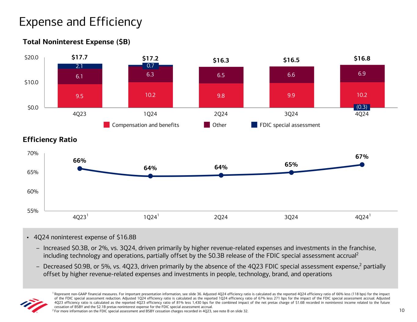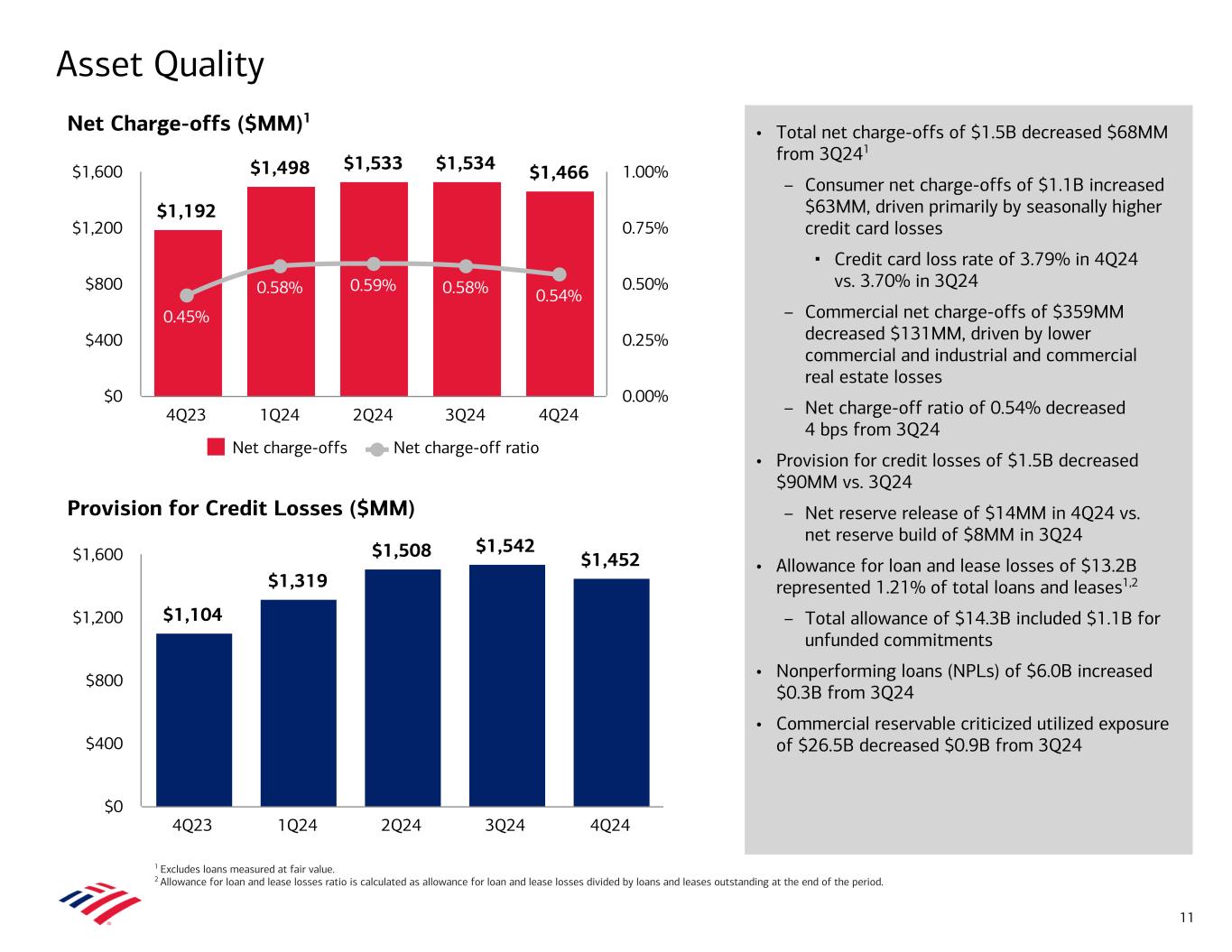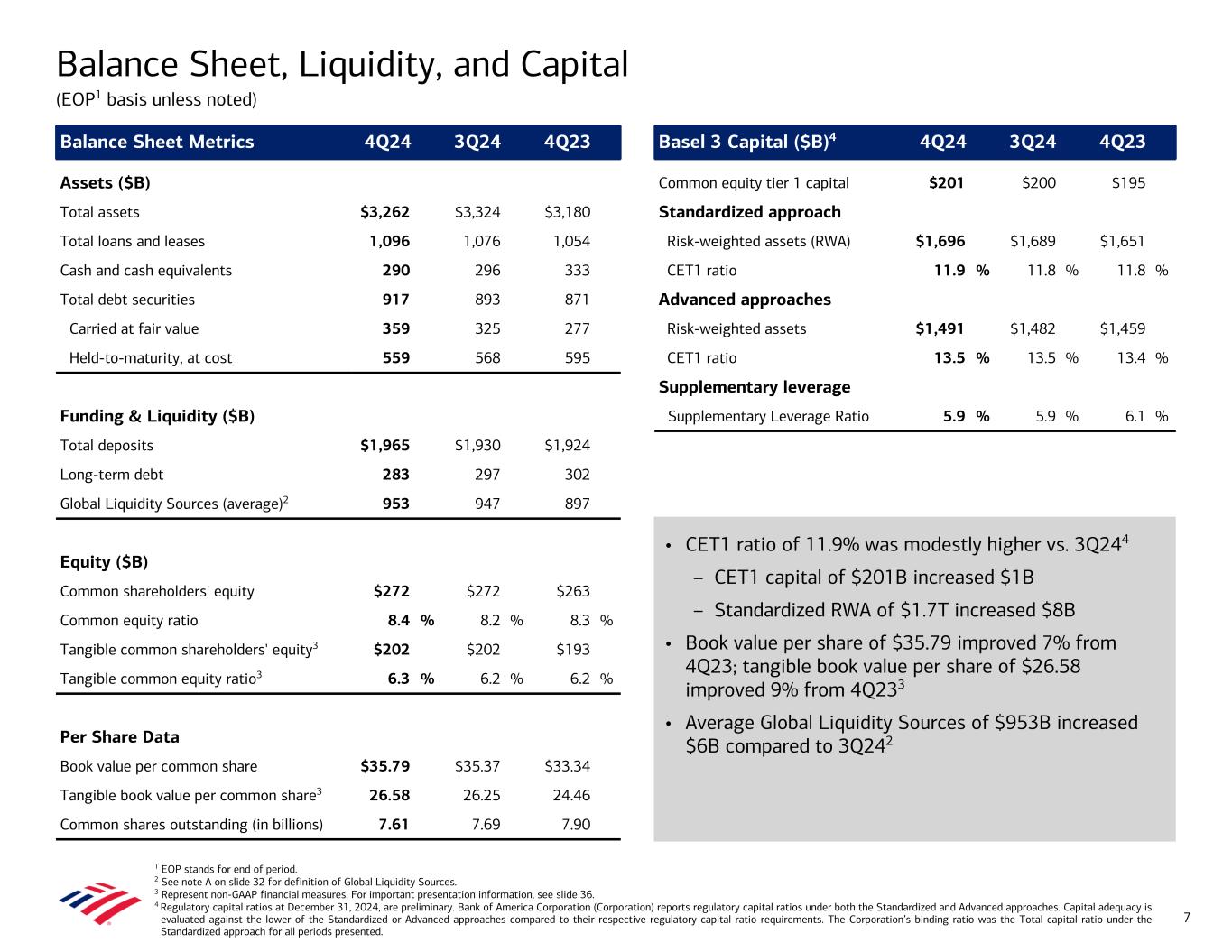 1 ROE stands for return on average common shareholders’ equity. ROTCE stands for return on average tangible common shareholders’ equity. FTE stands for fully taxable-equivalent basis. 2 Represent non-GAAP financial measures. For important presentation information, see slide 36. 3 For information on the FDIC special assessment and BSBY cessation charges recorded in 4Q23, see note B on slide 32. 4 Represent non-GAAP financial measures. For a reconciliation to GAAP of the presented financial metrics, see note B on slide 32. For important presentation information, see slide 36. 5 Excludes loans measured at fair value. Net charge-off ratio is calculated as annualized net charge-offs divided by average outstanding loans and leases during the period. 6 See note A on slide 32 for definition of Global Liquidity Sources. 4Q24 Highlights (Comparisons to 4Q23, unless otherwise noted) • Net income of $6.7B; diluted earnings per share (EPS) of $0.82; ROE1 9.4%, ROTCE1,2 12.6% • Revenue, net of interest expense, of $25.3B ($25.5B FTE)1,2 increased $3.4B, or 15% – Adjusted for the 4Q23 BSBY cessation charge, revenue increased 8%3,4 – Net interest income (NII) of $14.4B ($14.5B FTE)2 increased $0.4B, or 3%, as NII related to Global Markets activity, fixed-rate asset repricing, and loan growth more than offset the impact of lower interest rates – Noninterest income of $11.0B increased 37%, reflecting the absence of the 4Q23 BSBY cessation charge3 and higher asset management and investment banking fees ▪ Adjusted for the 4Q23 BSBY cessation charge, noninterest income increased 15%4 • Provision for credit losses of $1.5B – Net charge-offs (NCOs) of $1.5B5 improved $0.1B compared to 3Q24, as lower commercial losses were partially offset by seasonally higher credit card losses – Net charge-off ratio of 54 bps vs. 58 bps in 3Q245 – Net reserve release of $14MM vs. net reserve build of $8MM in 3Q24 • Noninterest expense of $16.8B decreased $0.9B, or 5%, vs. 4Q23, driven primarily by the absence of the 4Q23 FDIC special assessment expense,3 partially offset by higher revenue-related expenses and investments in people, technology, brand, and operations • Balance sheet remained strong – Average deposits of $1.96T increased $53B, or 3%, vs. 4Q23 – Average loans and leases of $1.08T increased $30B, or 3%, vs. 4Q23 – Common Equity Tier 1 capital of $201B increased $1B from 3Q24 – Common Equity Tier 1 ratio of 11.9%; above regulatory minimum of 10.7% – Average Global Liquidity Sources of $953B6 – Paid $2.0B in common dividends and repurchased $3.5B of common stock 6