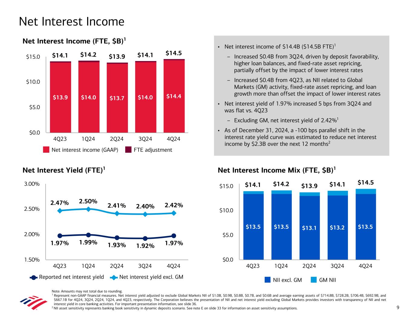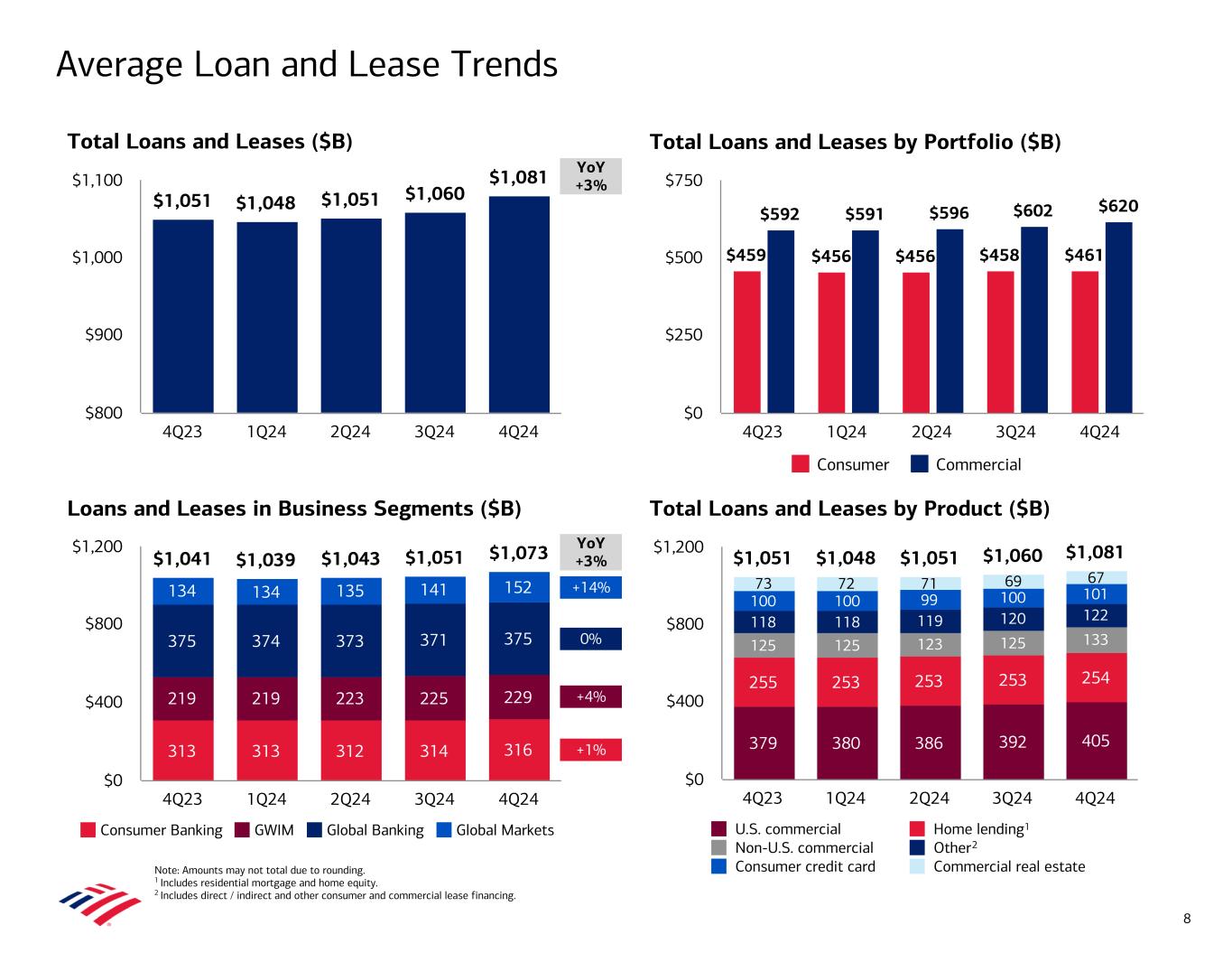 $1,041 $1,039 $1,043 $1,051 $1,073 313 313 312 314 316 219 219 223 225 229 375 374 373 371 375 134 134 135 141 152 Consumer Banking GWIM Global Banking Global Markets 4Q23 1Q24 2Q24 3Q24 4Q24 $0 $400 $800 $1,200 $1,051 $1,048 $1,051 $1,060 $1,081 4Q23 1Q24 2Q24 3Q24 4Q24 $800 $900 $1,000 $1,100 +1% +4% 0% +14% Average Loan and Lease Trends YoY +3% YoY +3% Note: Amounts may not total due to rounding. 1 Includes residential mortgage and home equity. 2 Includes direct / indirect and other consumer and commercial lease financing. Total Loans and Leases by Product ($B) Loans and Leases in Business Segments ($B) Total Loans and Leases by Portfolio ($B)Total Loans and Leases ($B) $459 $456 $456 $458 $461 $592 $591 $596 $602 $620 Consumer Commercial 4Q23 1Q24 2Q24 3Q24 4Q24 $0 $250 $500 $750 8 $1,051 $1,048 $1,051 $1,060 $1,081 379 380 386 392 405 255 253 253 253 254 125 125 123 125 133 118 118 119 120 122 100 100 99 100 101 73 72 71 69 67 U.S. commercial Home lending Non-U.S. commercial Other Consumer credit card Commercial real estate 4Q23 1Q24 2Q24 3Q24 4Q24 $0 $400 $800 $1,200 2 1